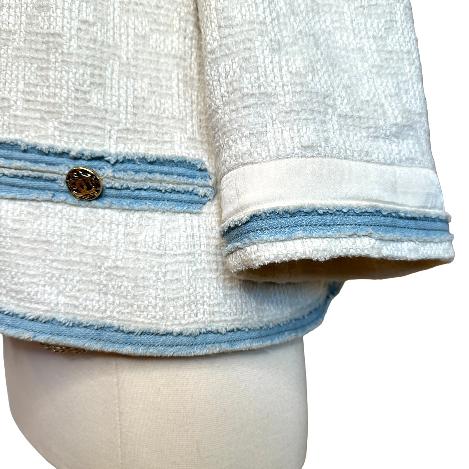 Chanel white tweed jacket with denim trims. Spring 2007 collection by Karl Largerfeld. Large CC gold-tone buttons. Pointed collar. Designer size 48.