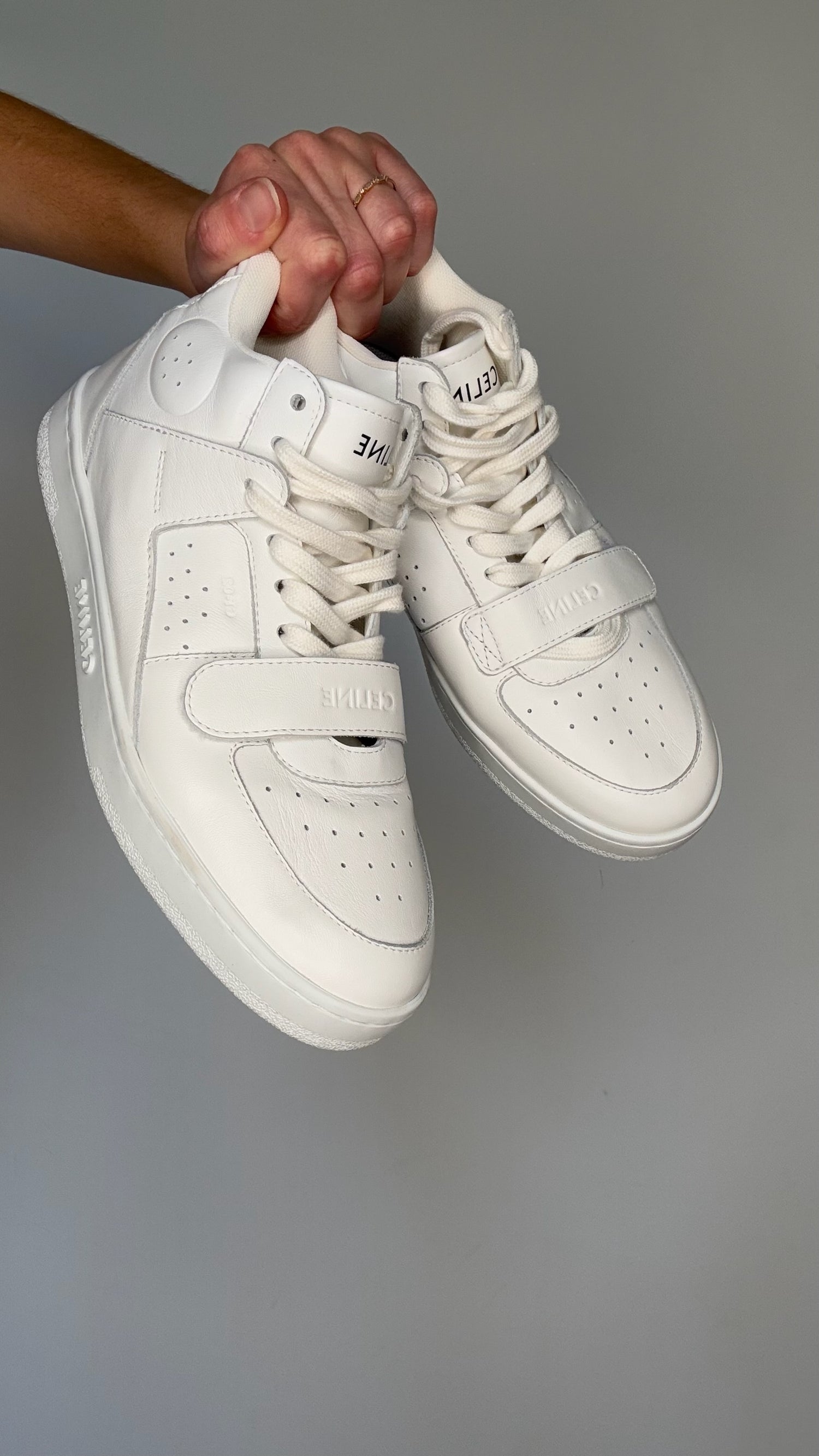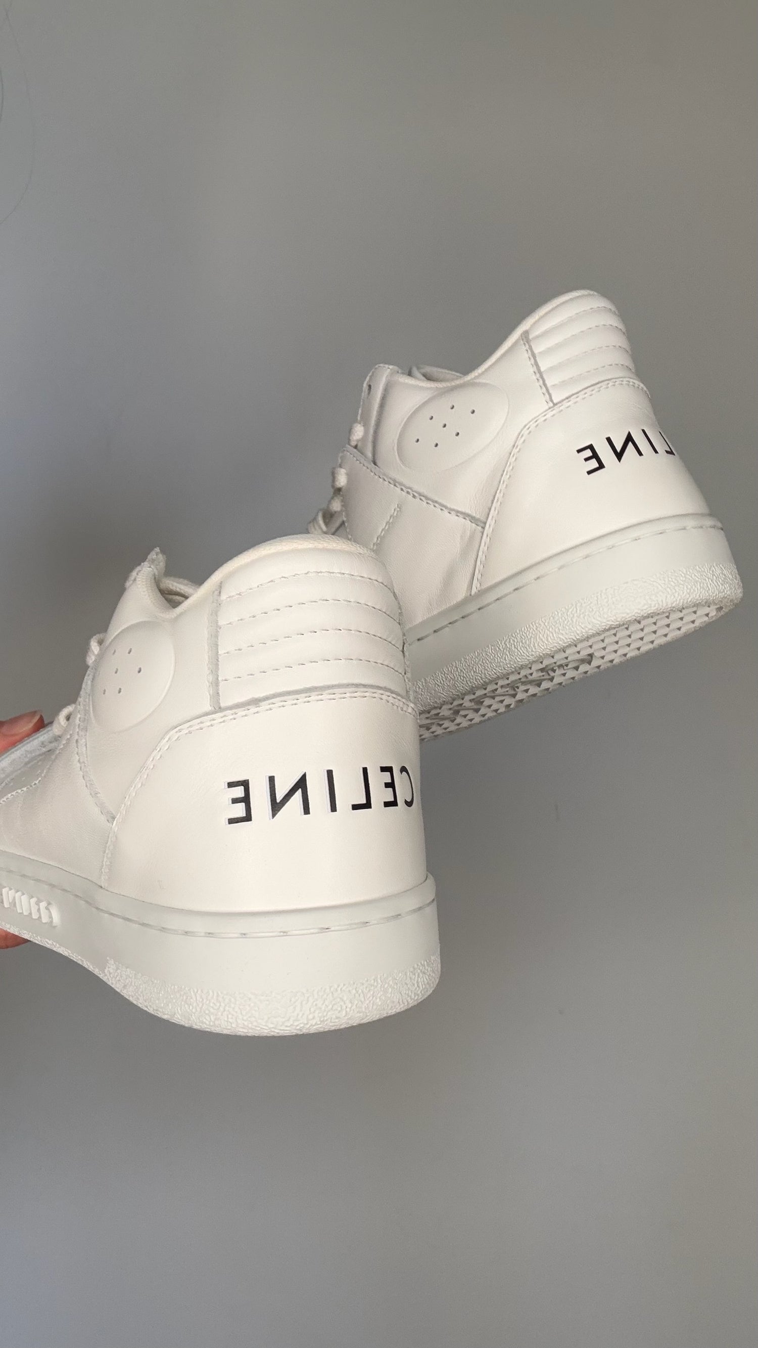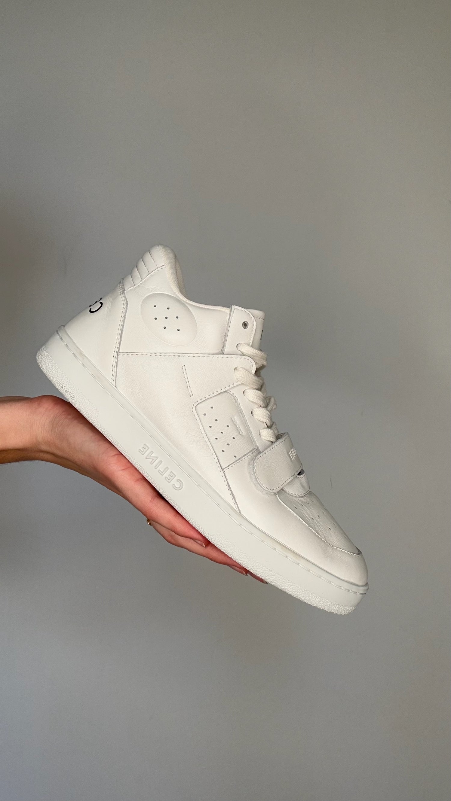 Celine white high top sneakers. White leather. Logo throughout. Designer size 37.