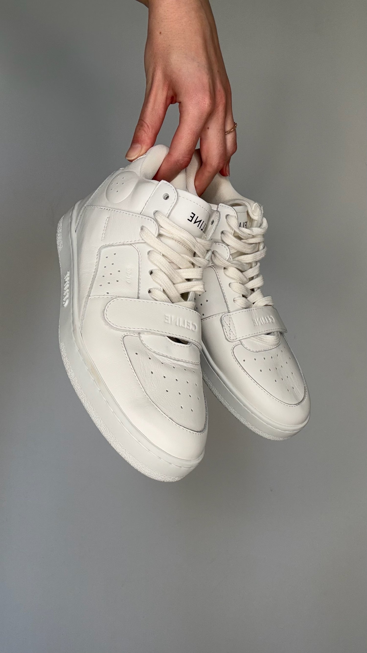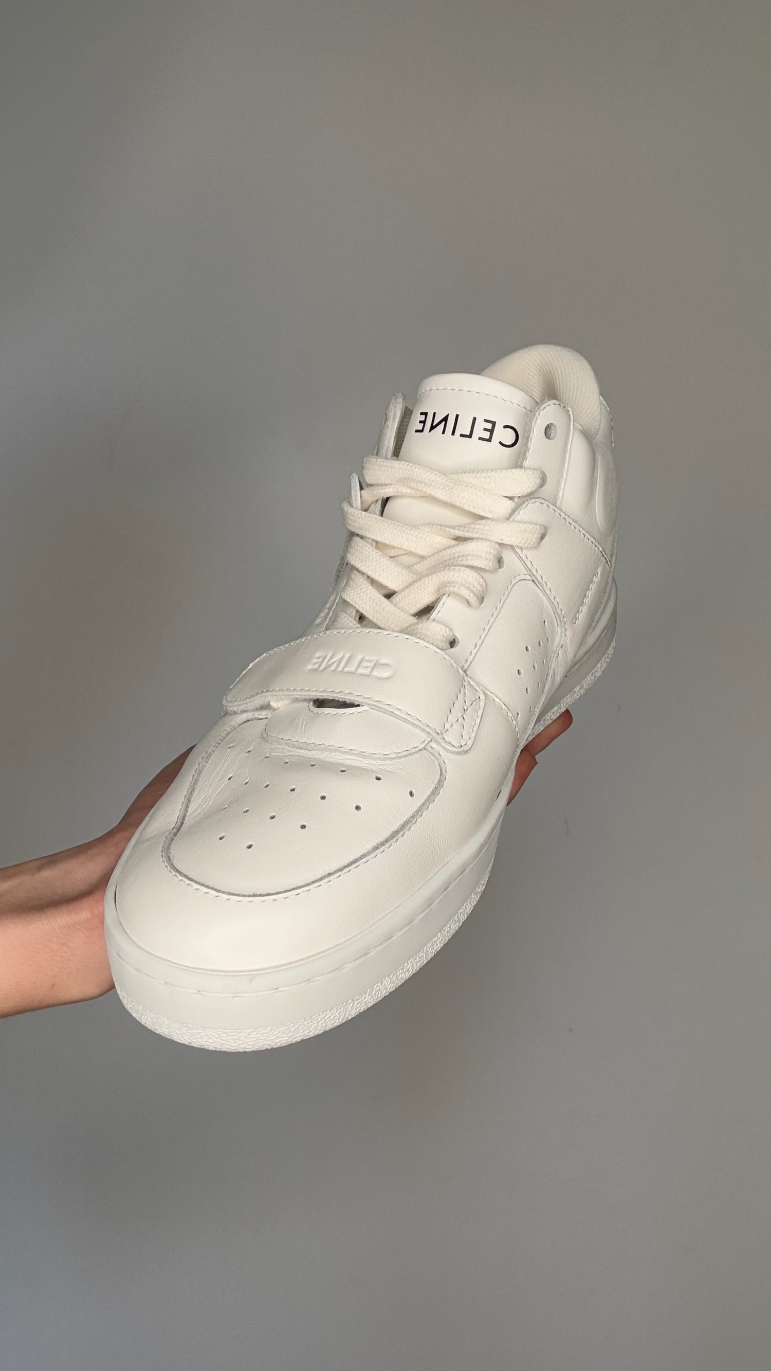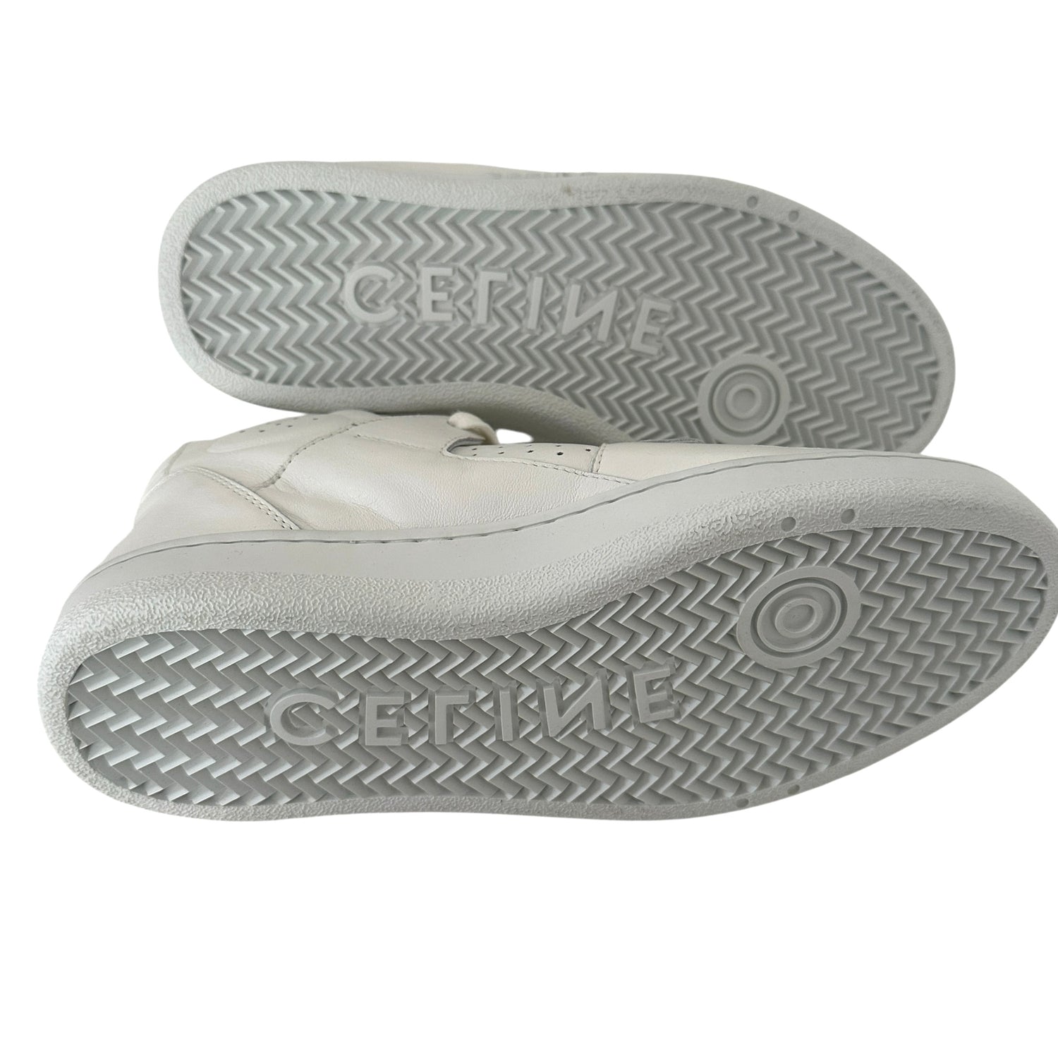 Celine white high top sneakers. White leather. Logo throughout. Designer size 37.