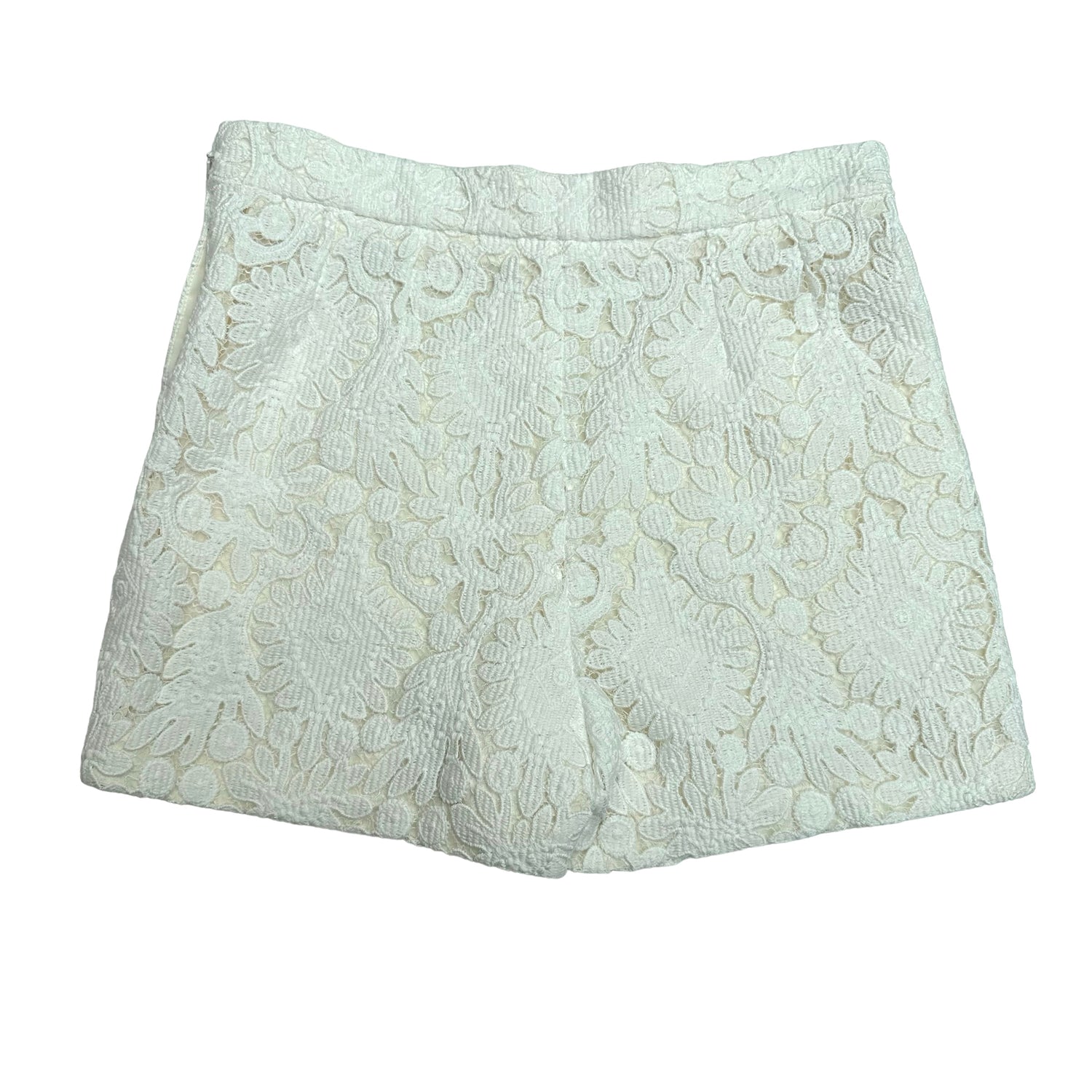 Chloe white lace mini shorts. Two patch pockets at front. Zipper closure. Designer size 38.