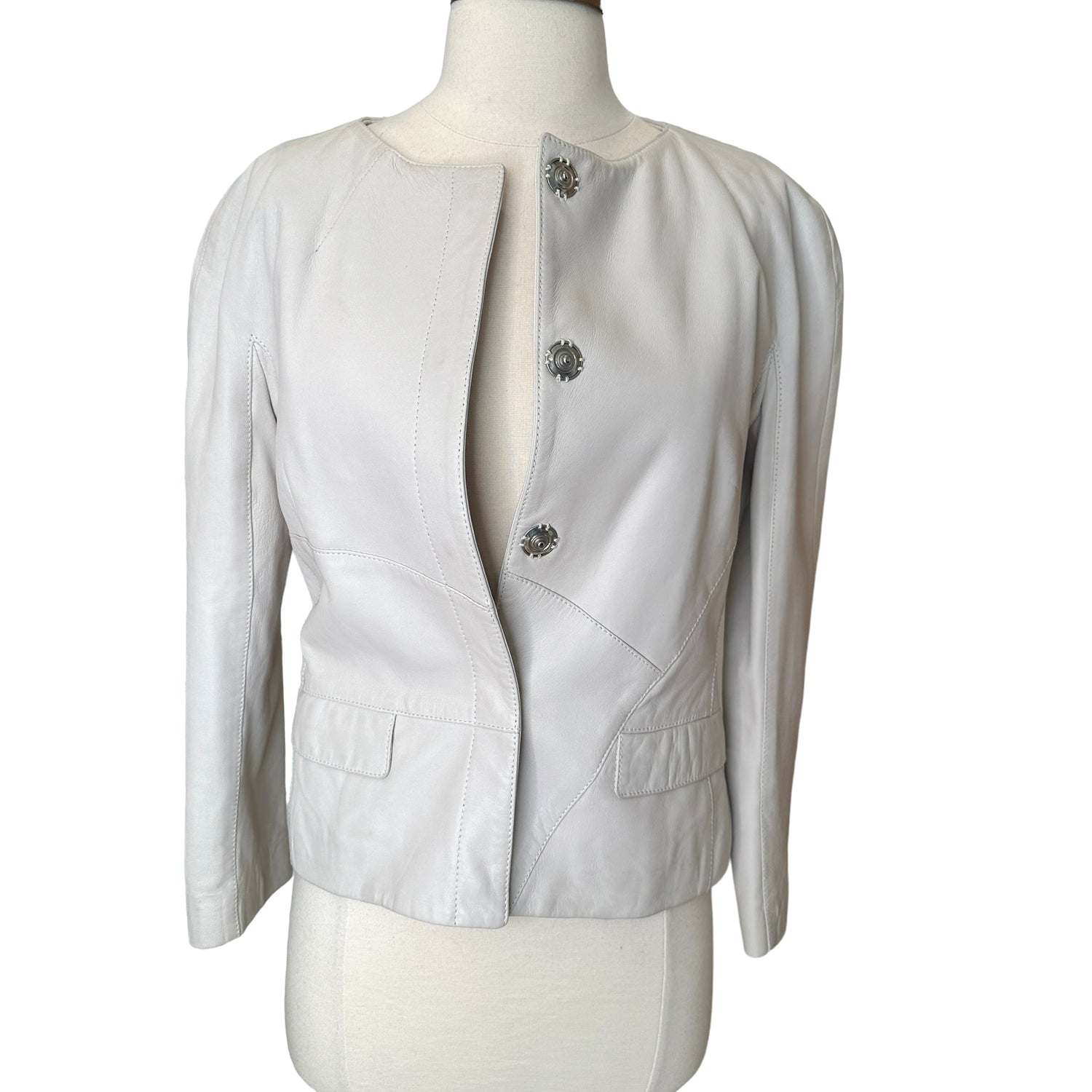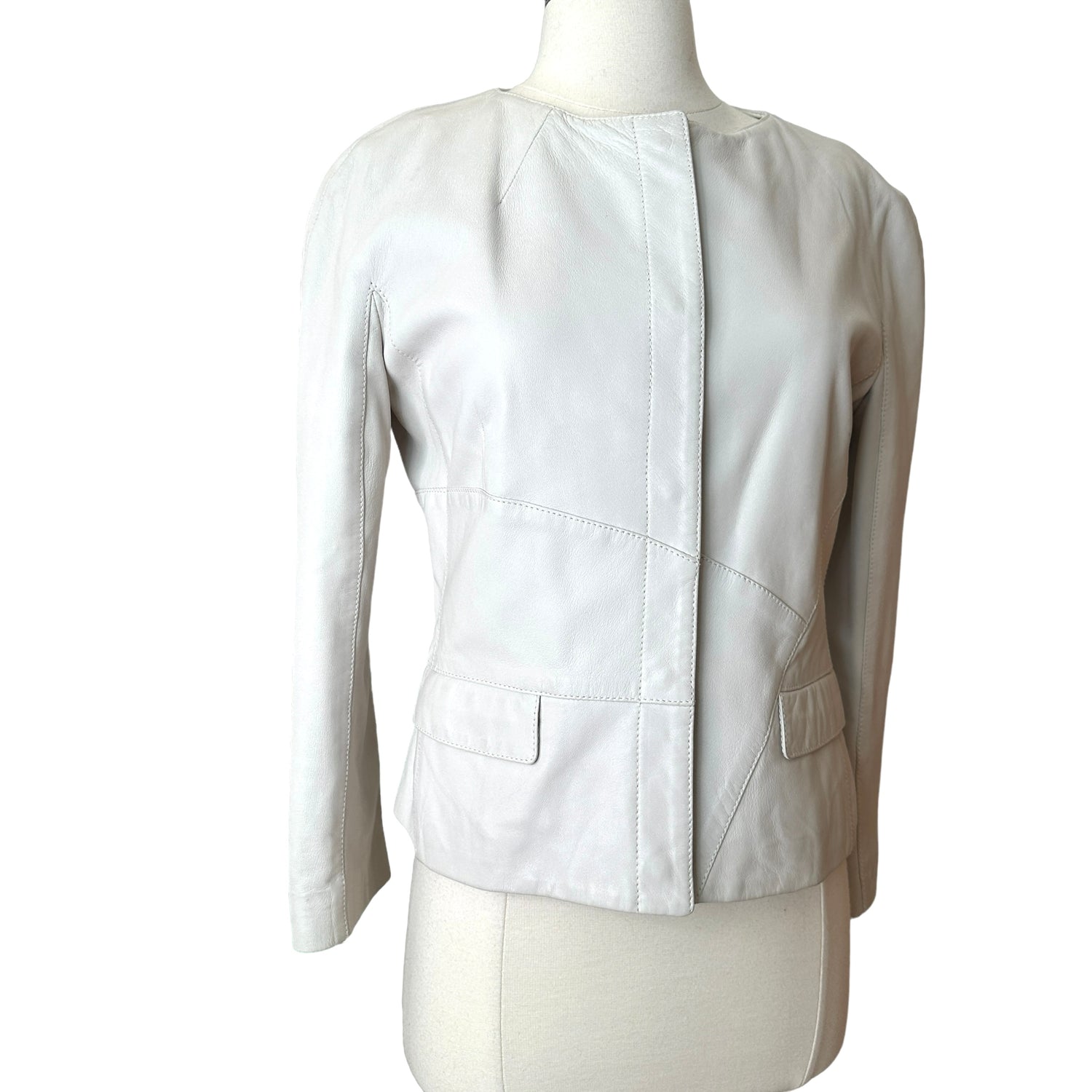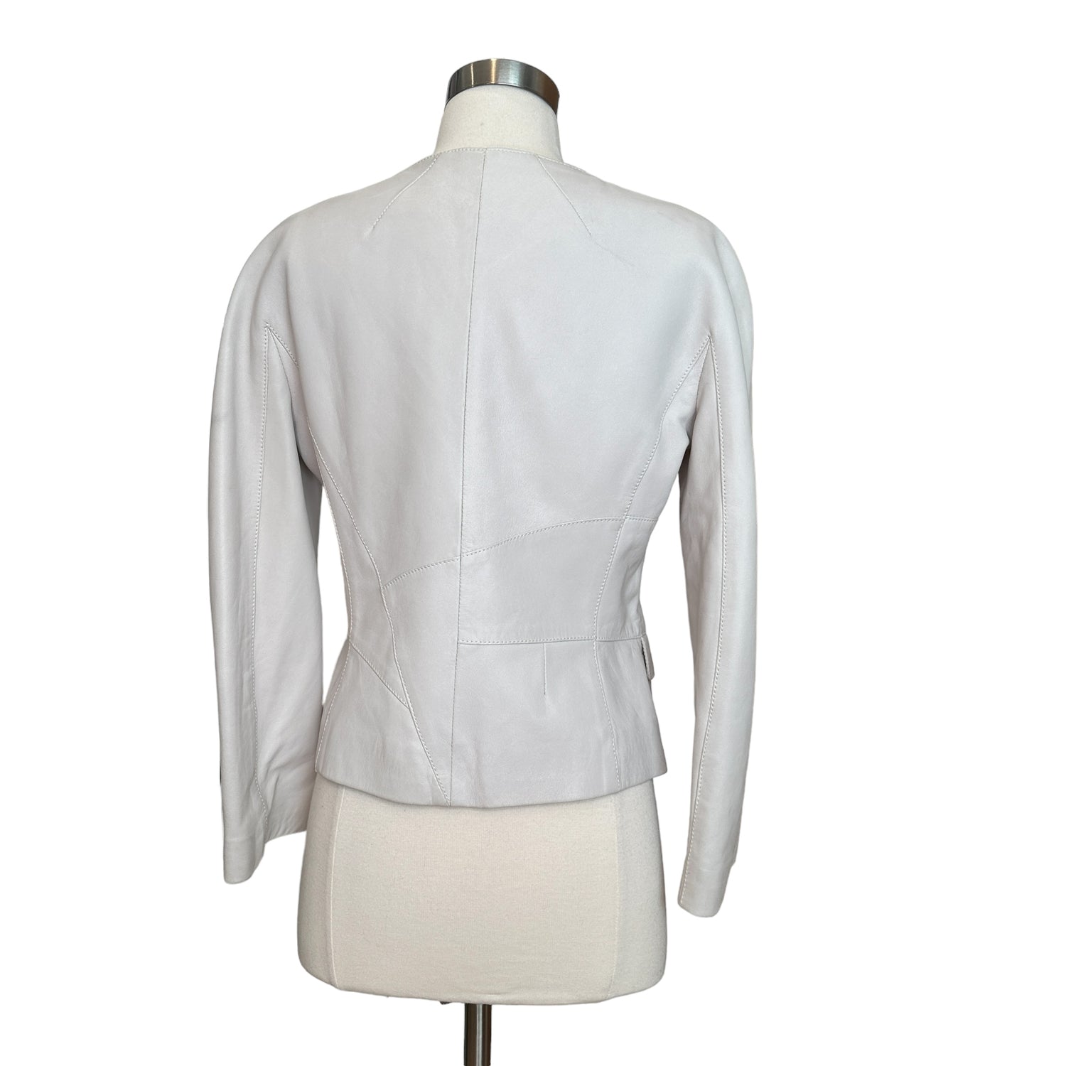 Christian Dior white leather jacket. Collarless. Concealed snap button closure. Flap pockets. Buttery soft leather. Double lining in silk and mesh. Designer size FR40 - US8.