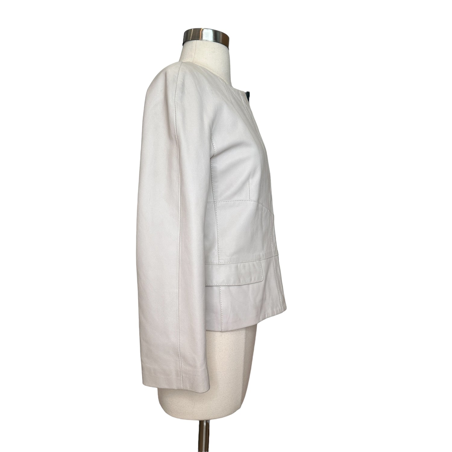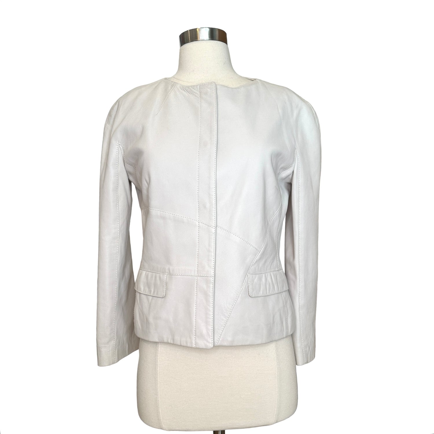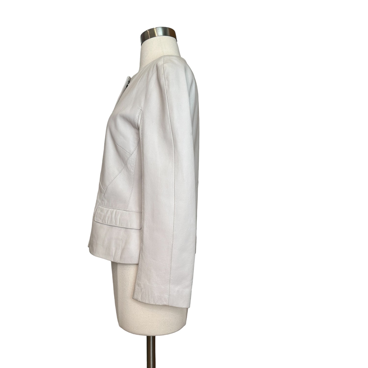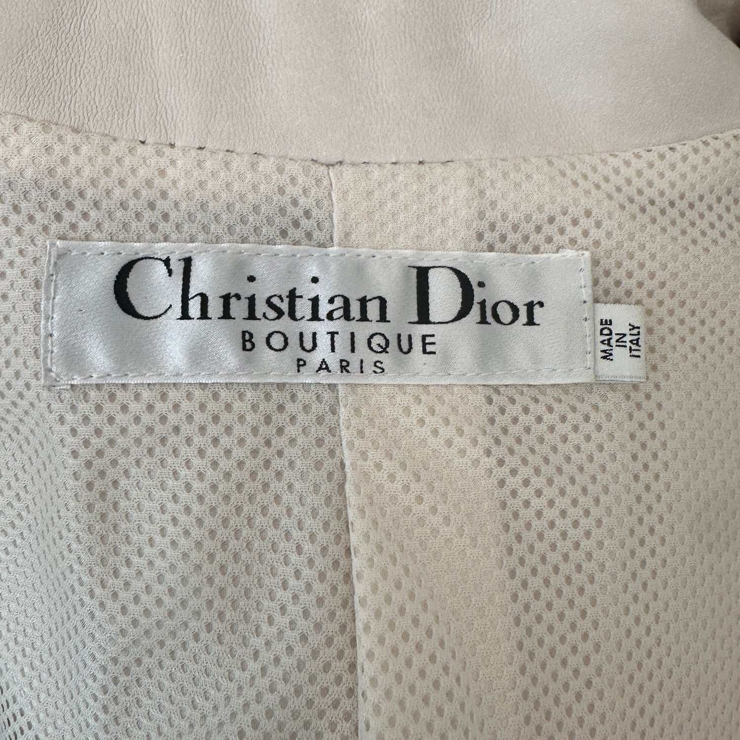 Christian Dior white leather jacket. Collarless. Concealed snap button closure. Flap pockets. Buttery soft leather. Double lining in silk and mesh. Designer size FR40 - US8.