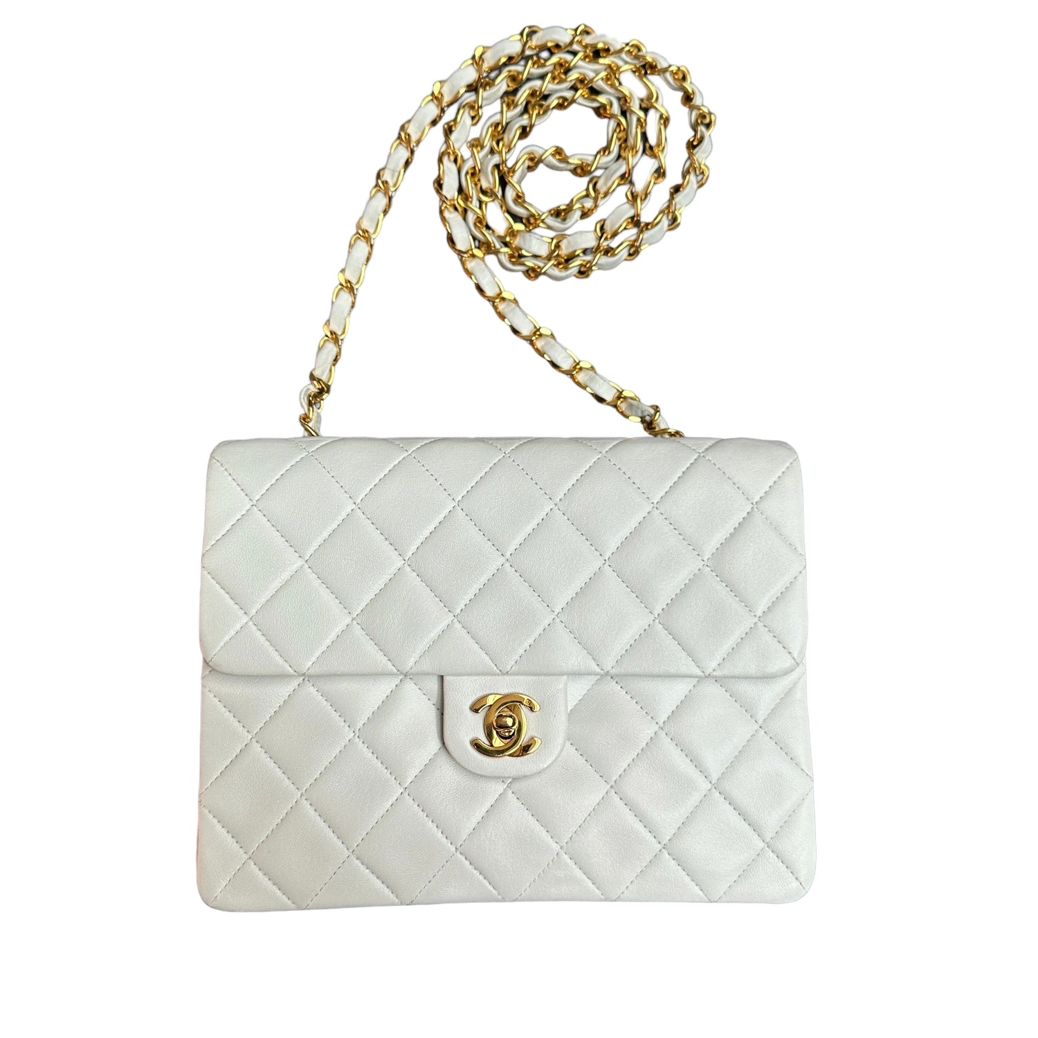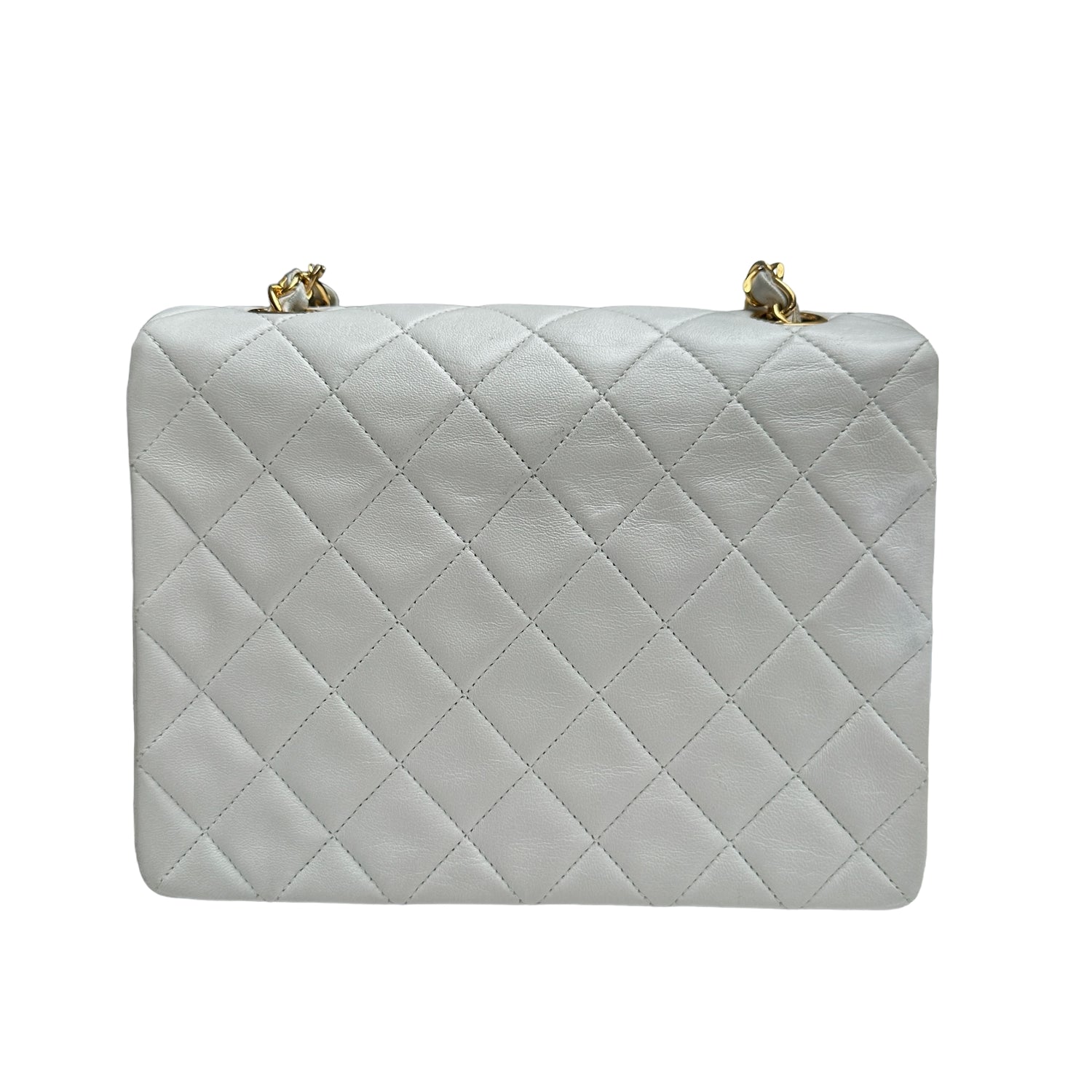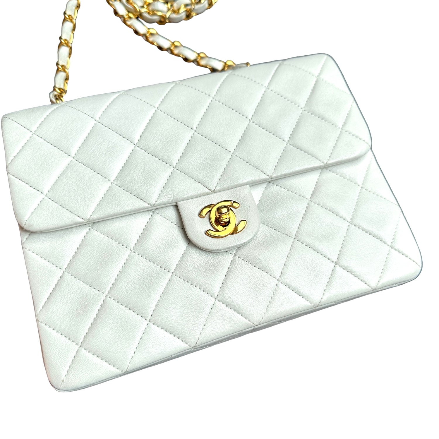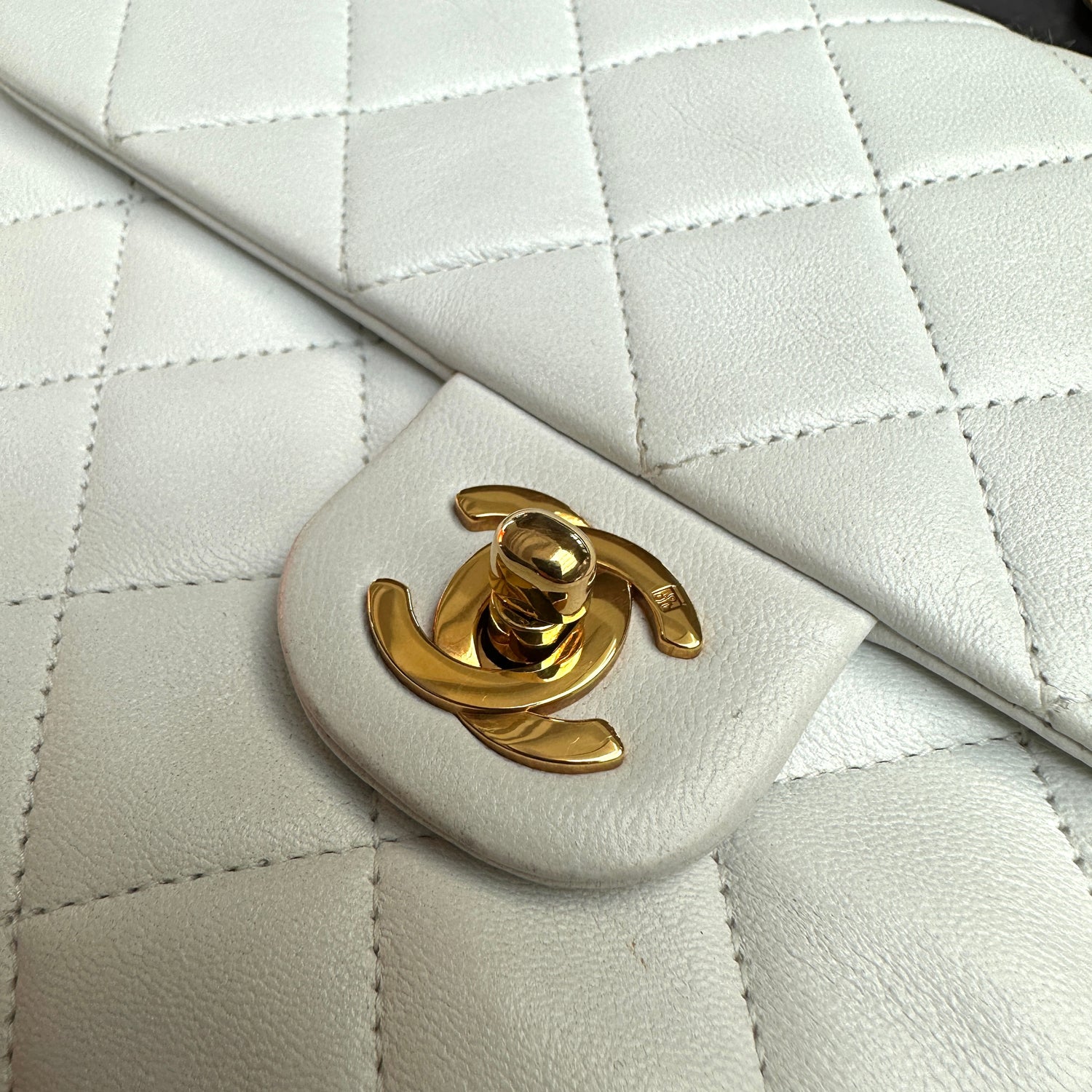 Chanel smooth white leather flap bag. 24K yellow gold. Diamond quilted leather. One interior zipper pocket.