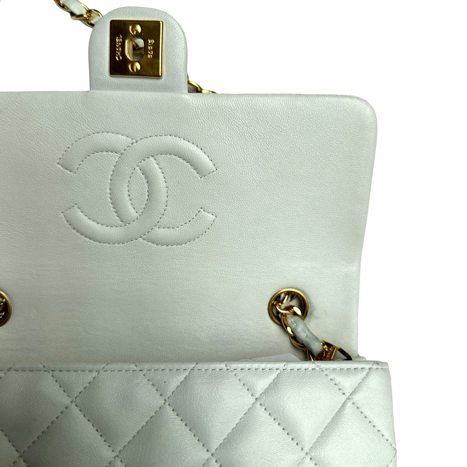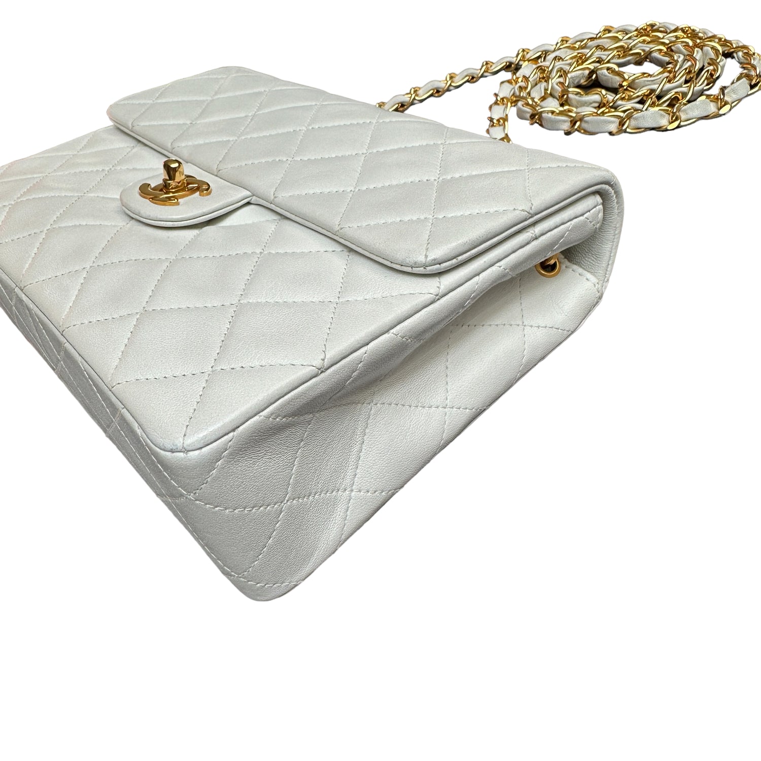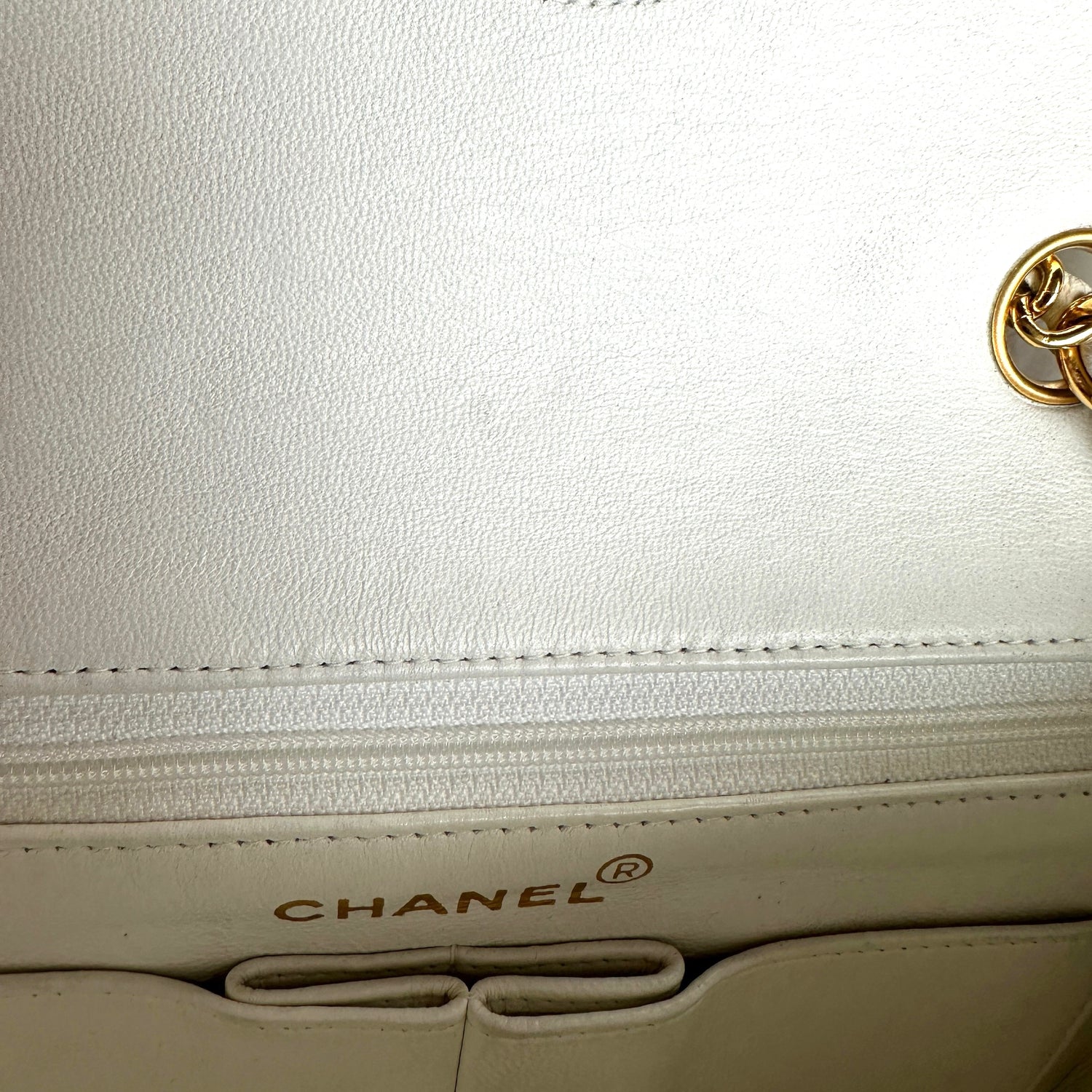 Chanel smooth white leather flap bag. 24K yellow gold. Diamond quilted leather. One interior zipper pocket.