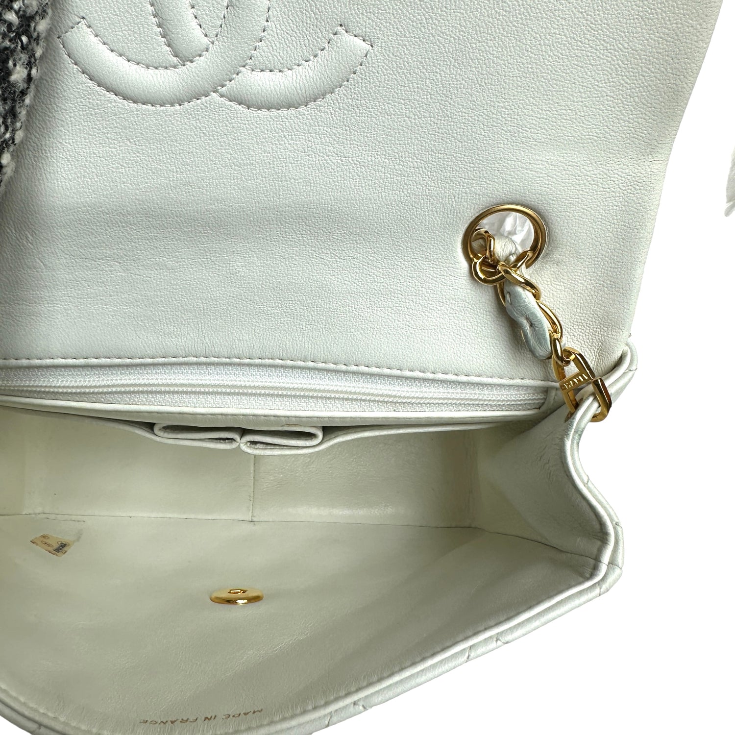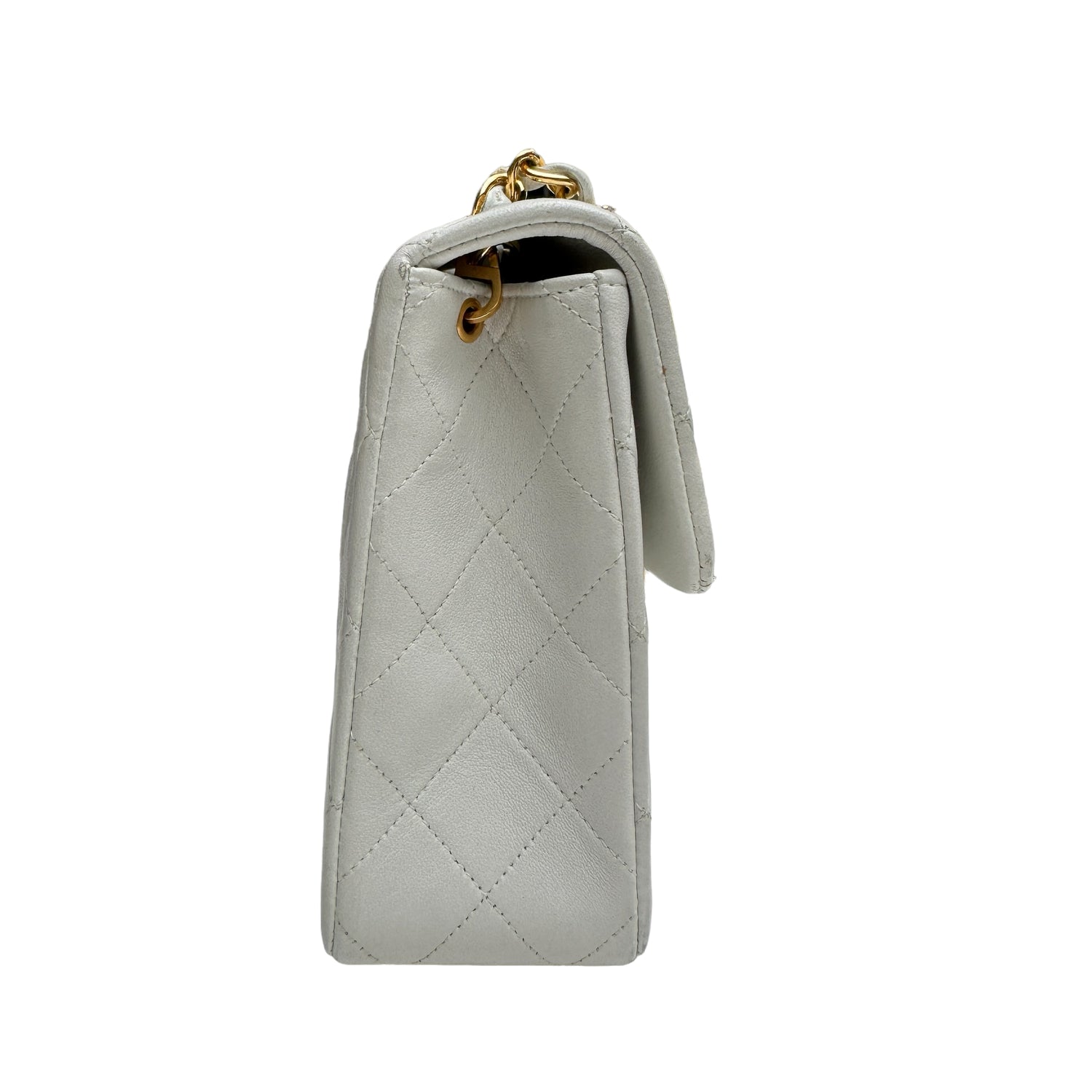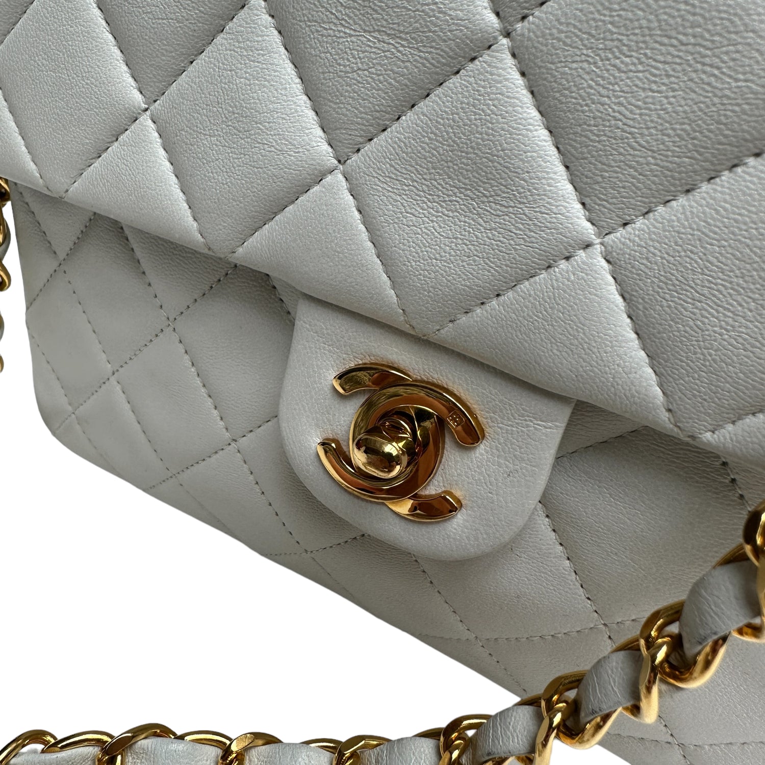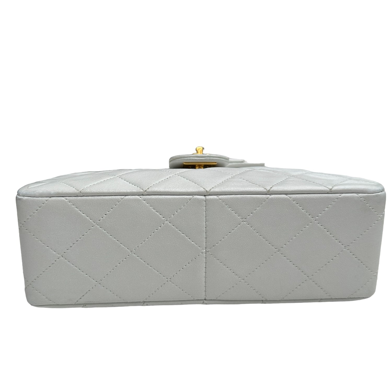 Chanel smooth white leather flap bag. 24K yellow gold. Diamond quilted leather. One interior zipper pocket.