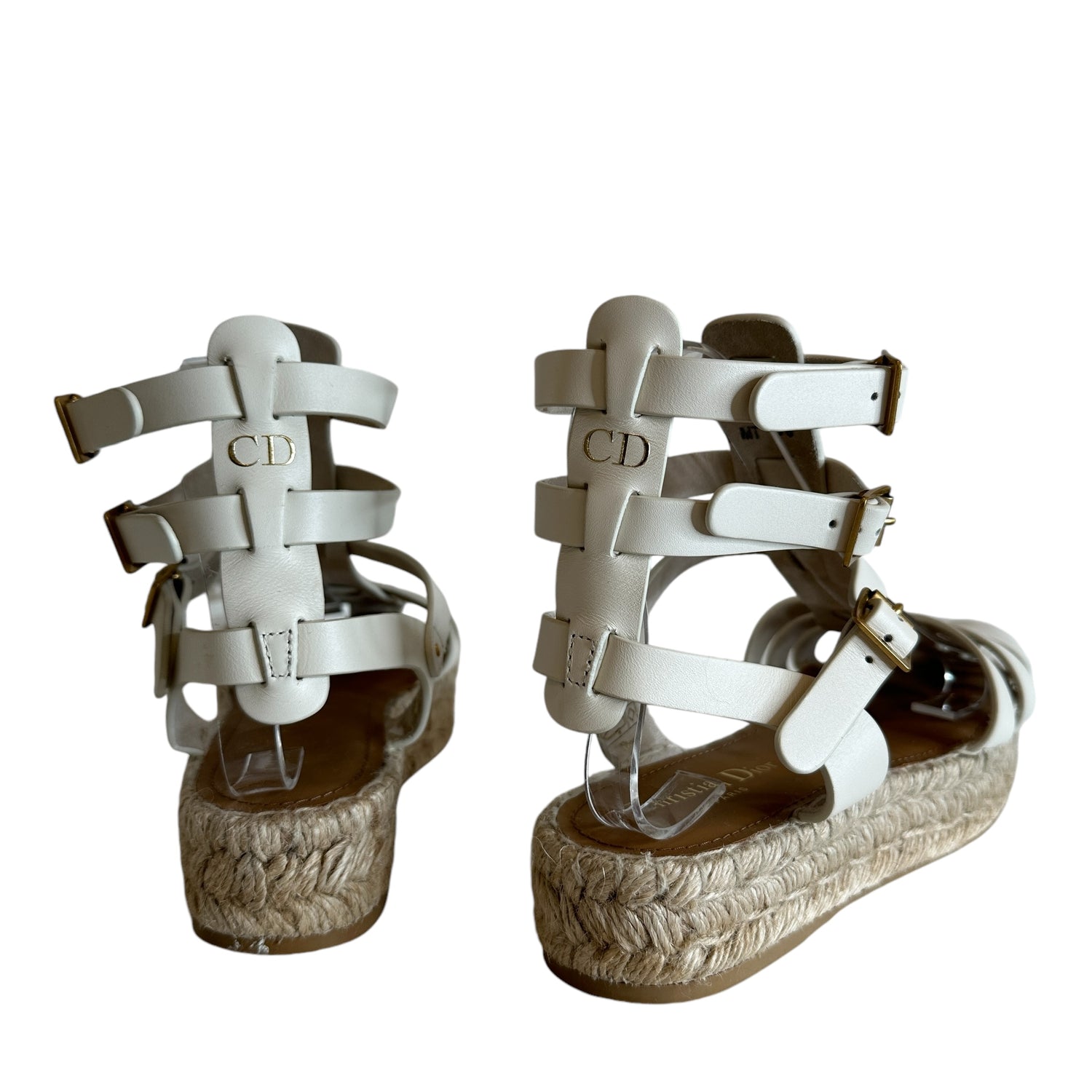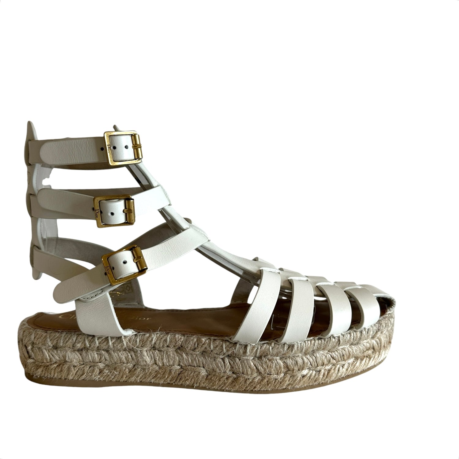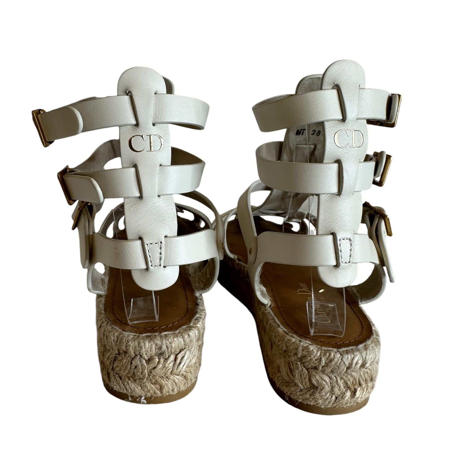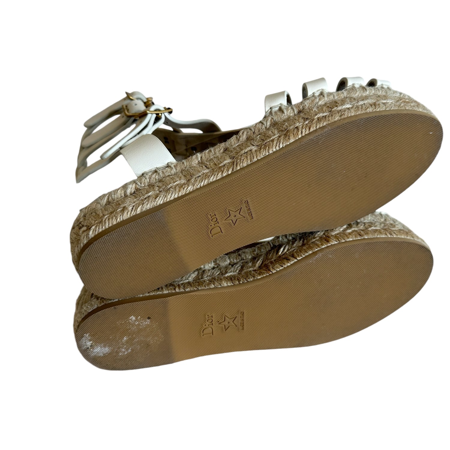 Christian Dior white leather sandals with raffia trims. Rubber outer soles. CD logo at back. Designer size 38.