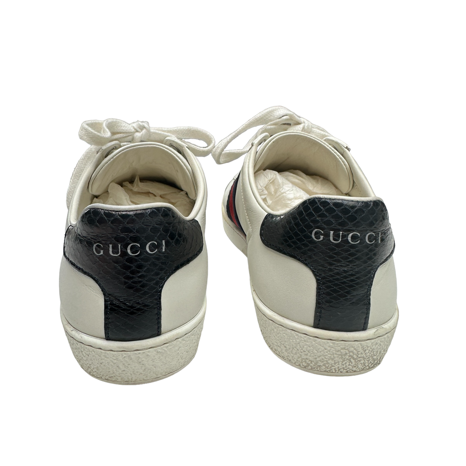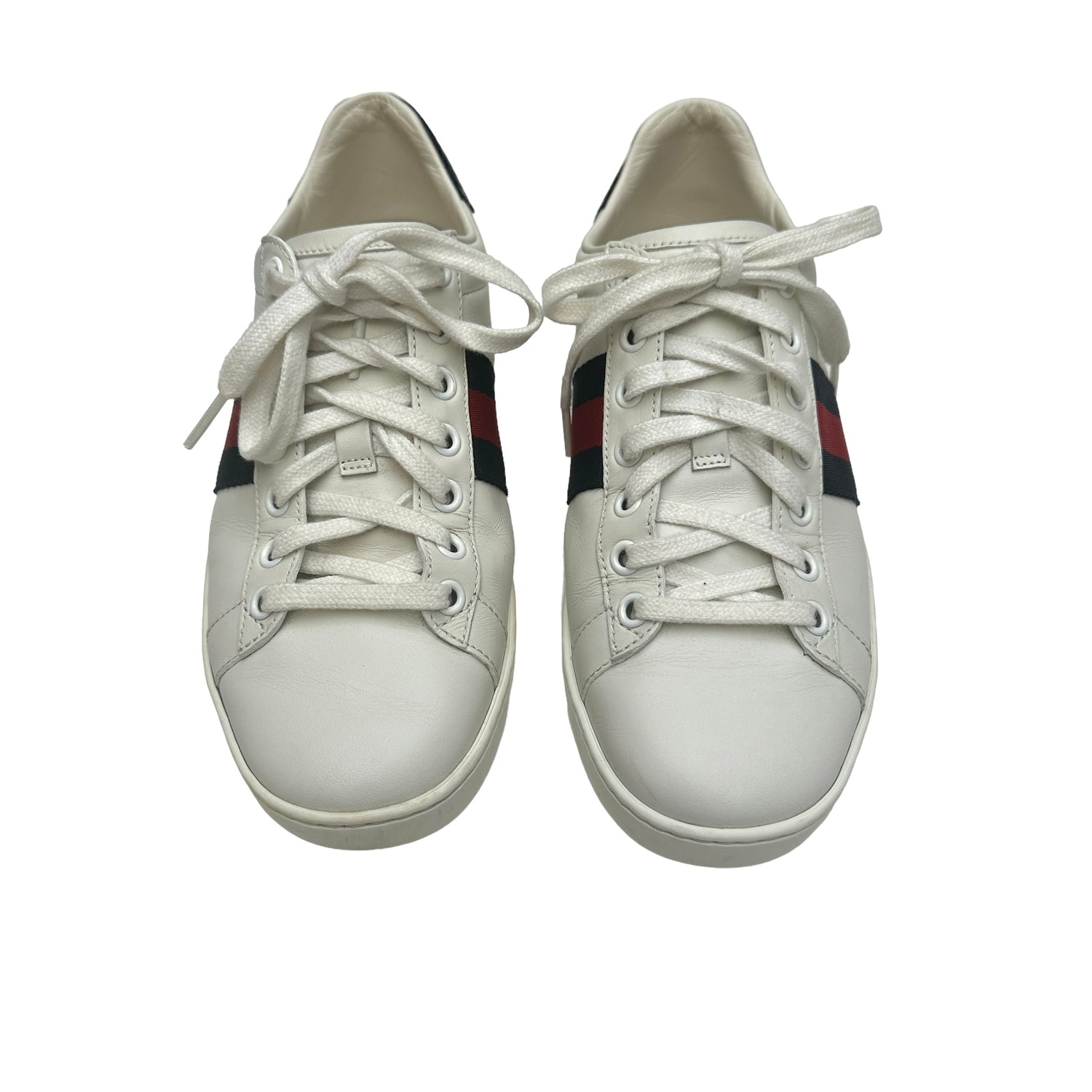 Gucci white classic sneakers. Round toe. Laces closure at top. Brand logo at back. Designer size 36. (These Gucci run big).