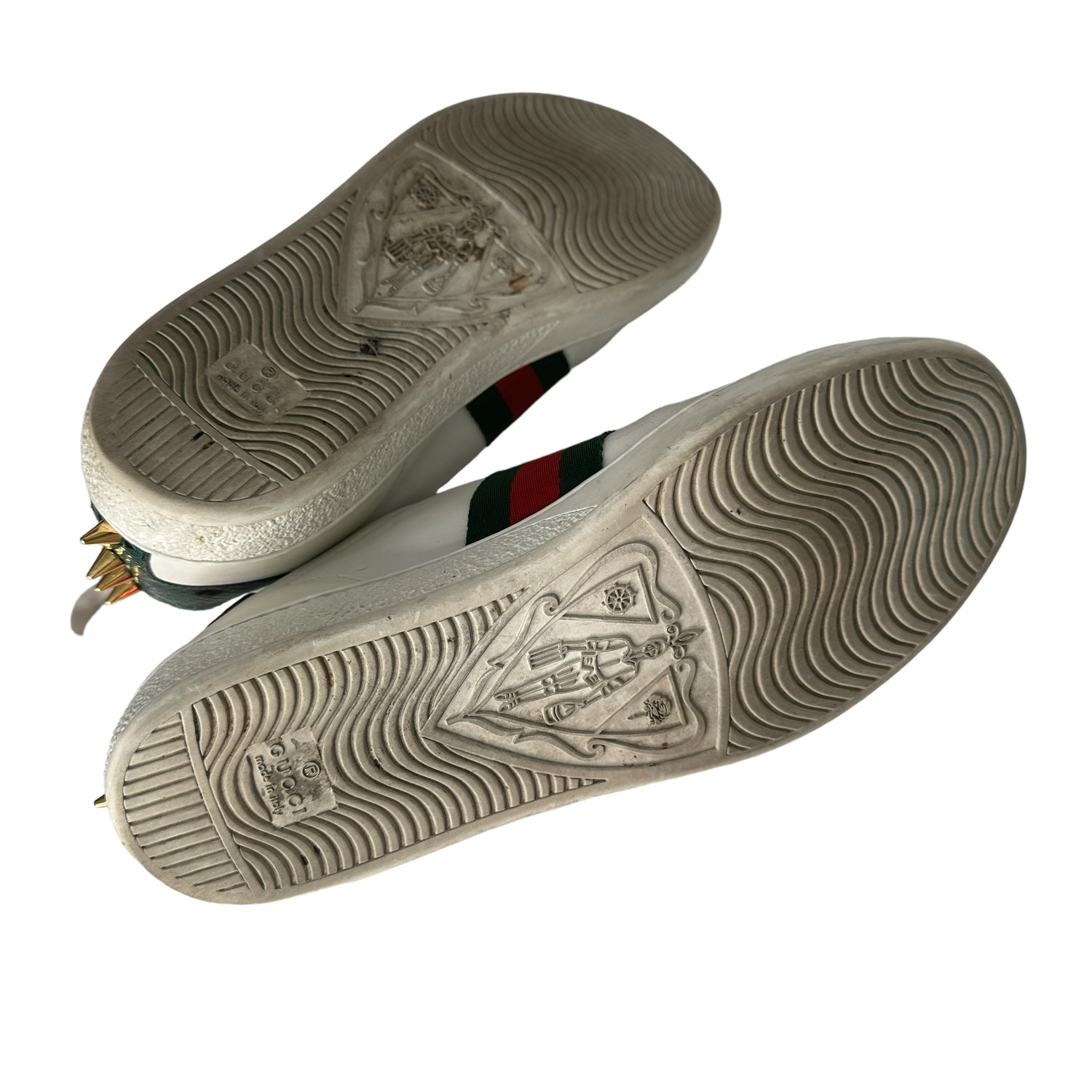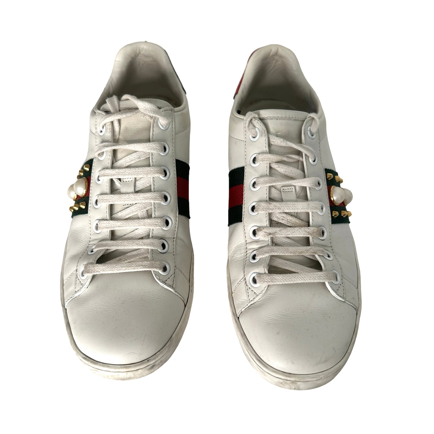 Gucci sneakers. White leather. Laces at top. Faux-pearl and gold spikes embellishments. Round toe. Designer size 39.5.