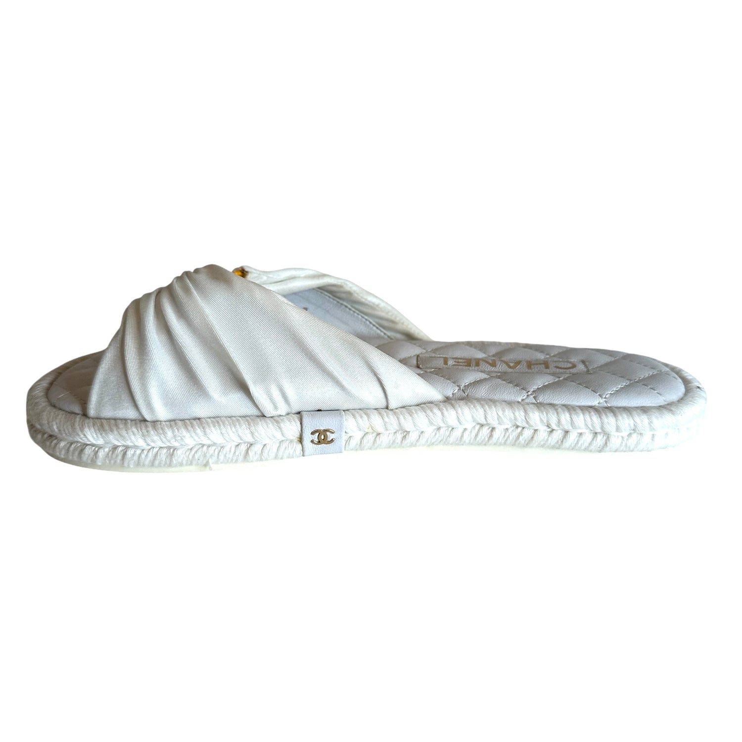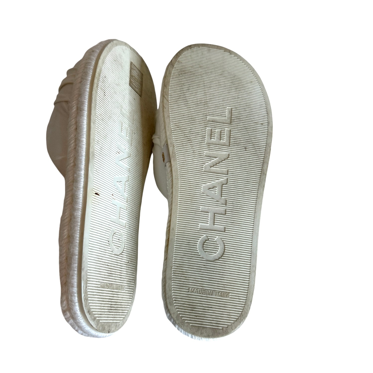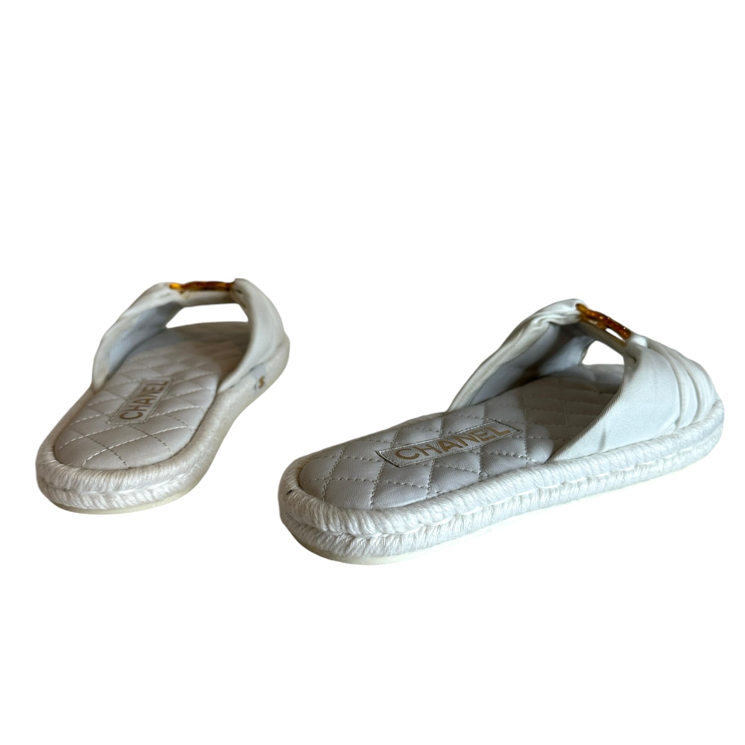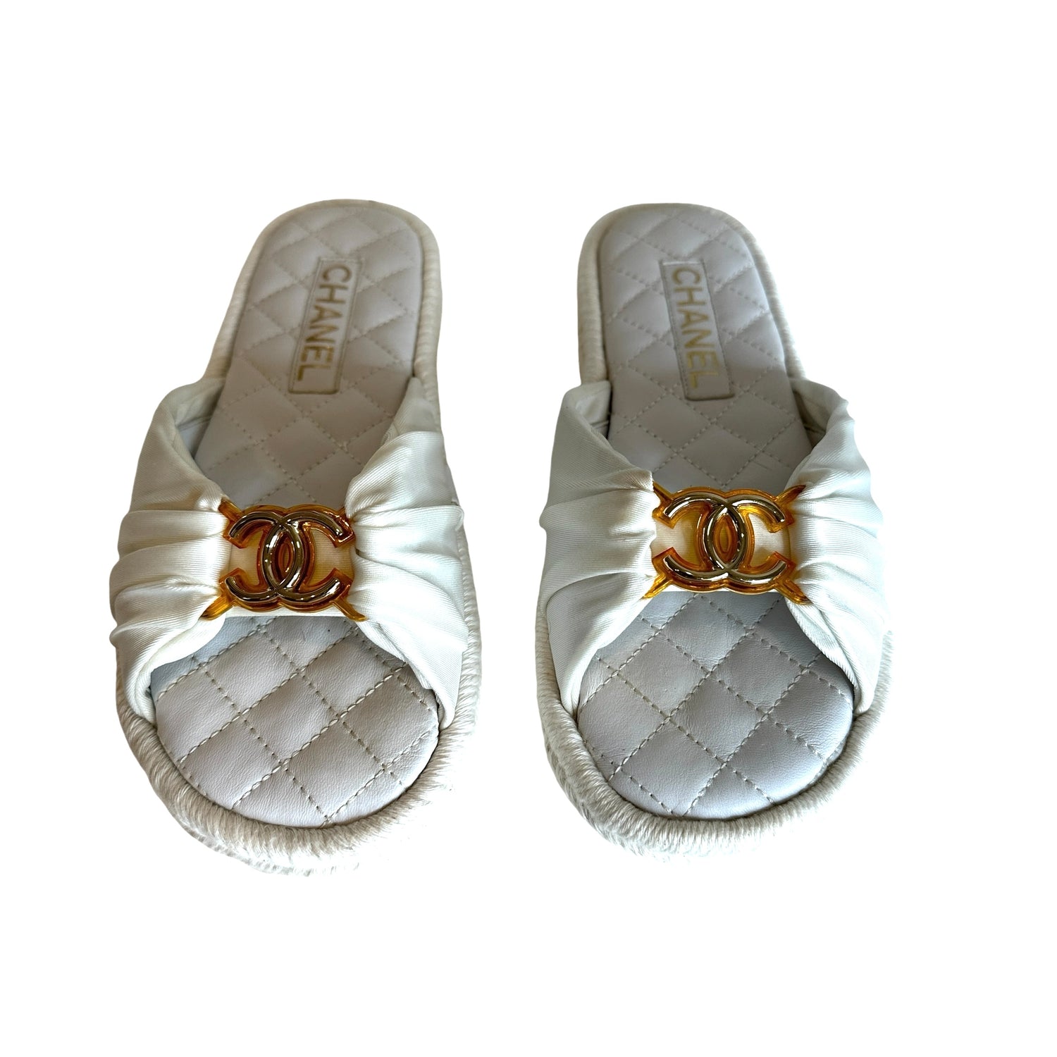 Chanel white sandals. White satin top with gold-tone CC logo on top of orange acrylic. CC logo at sides. Raffia trims. Designer size 37.