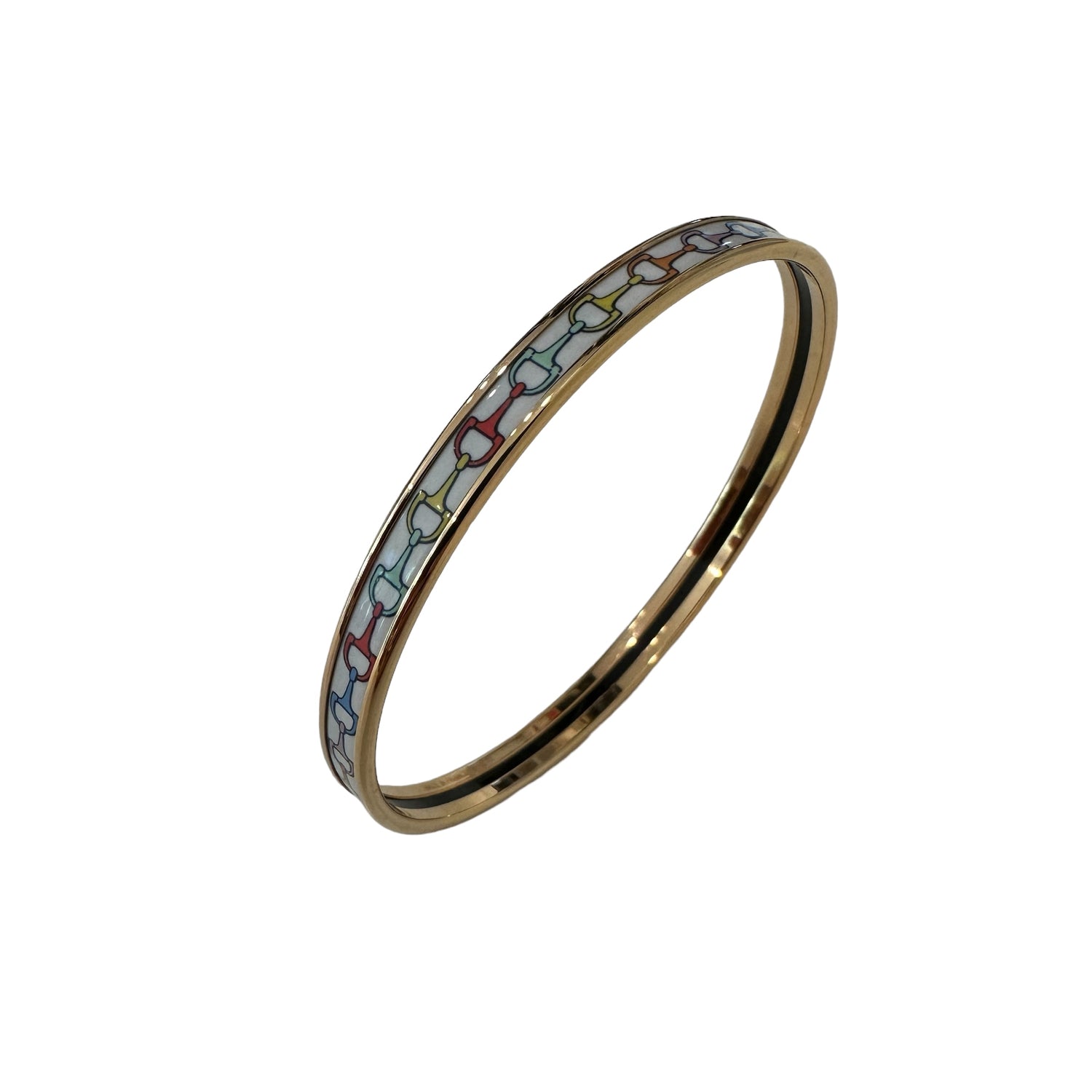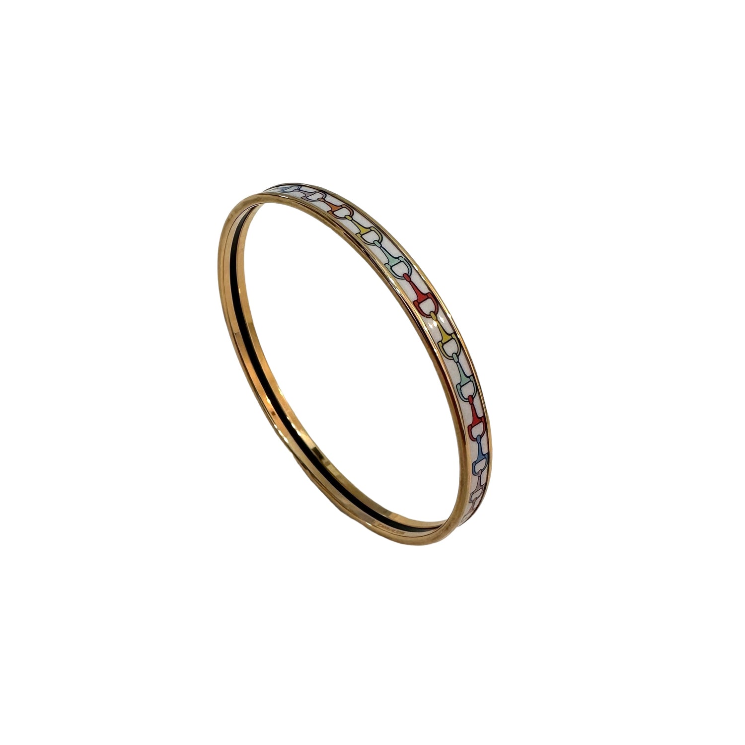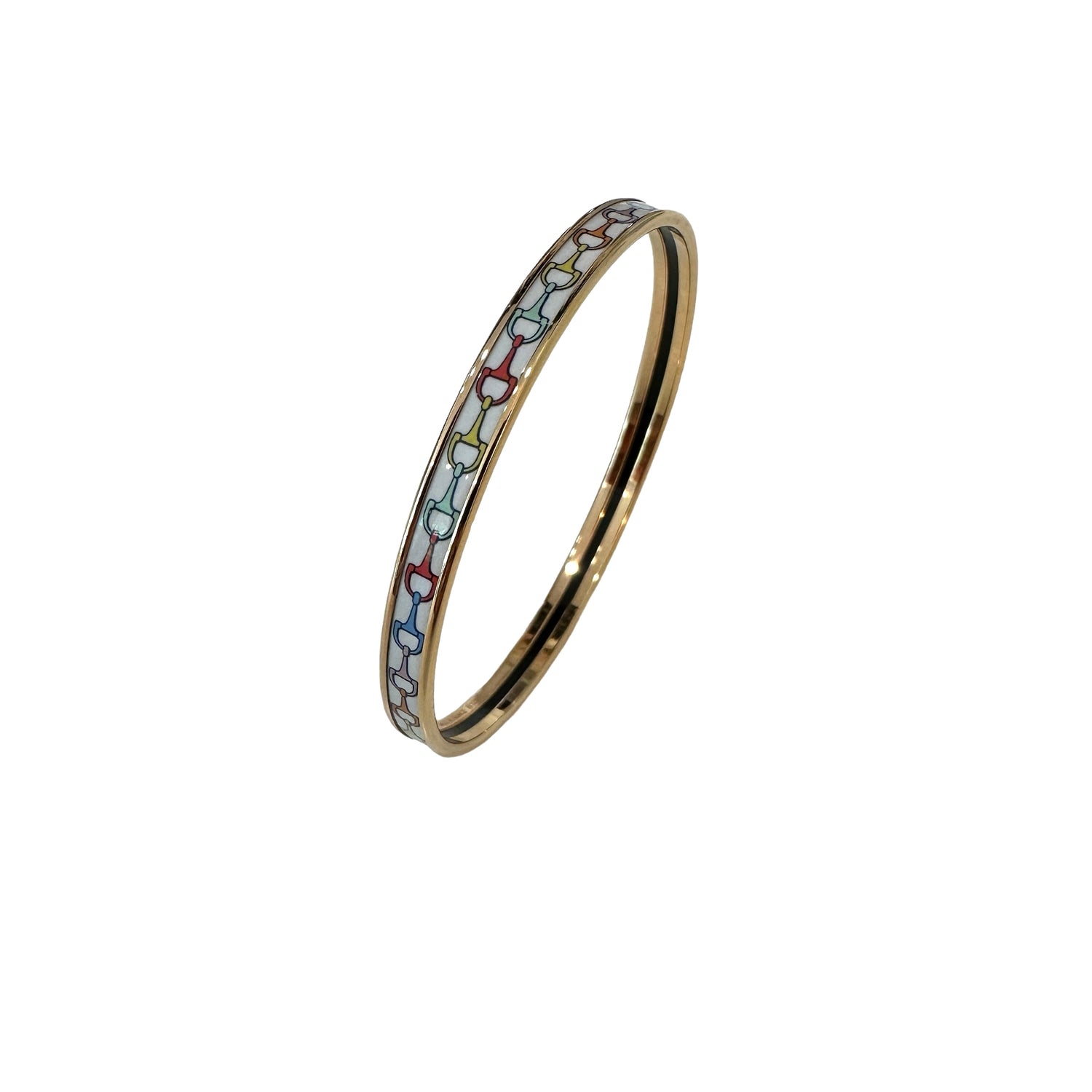 Hermes enamel bangle. White enamel with rainbow horsebites design. Gold plated trims.