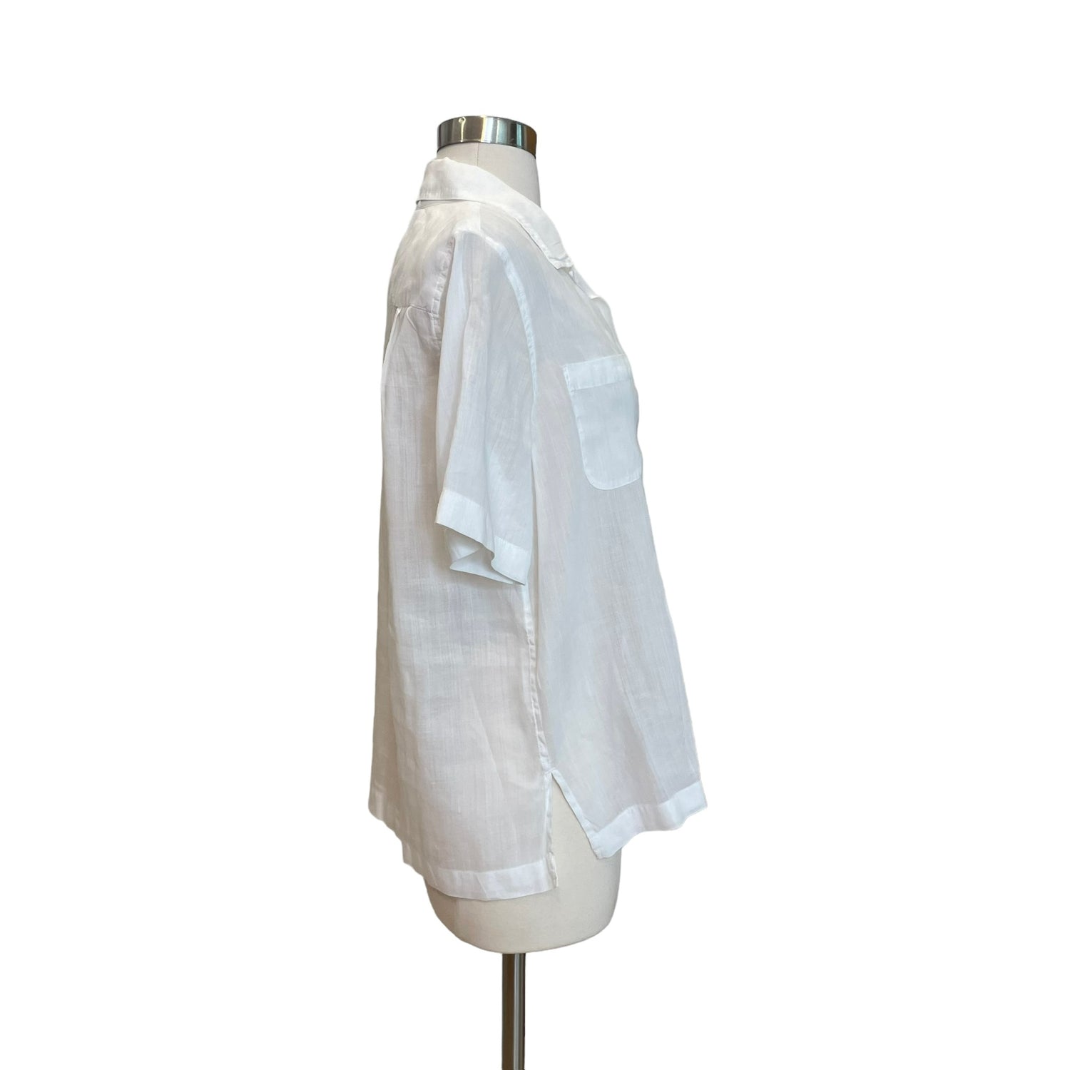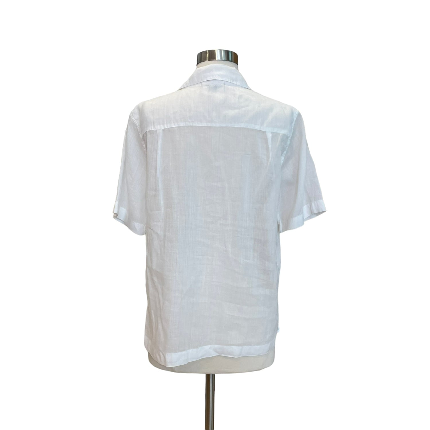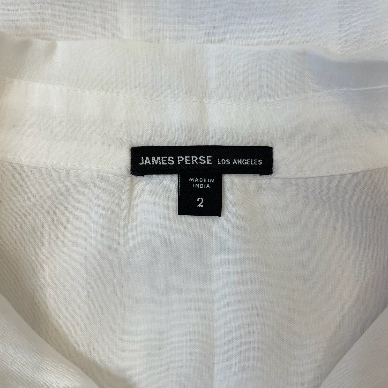 James Perse white shirt. Button down shirt with short sleeves. Pointed collar. Patch pockets at front. Designer size 2.
