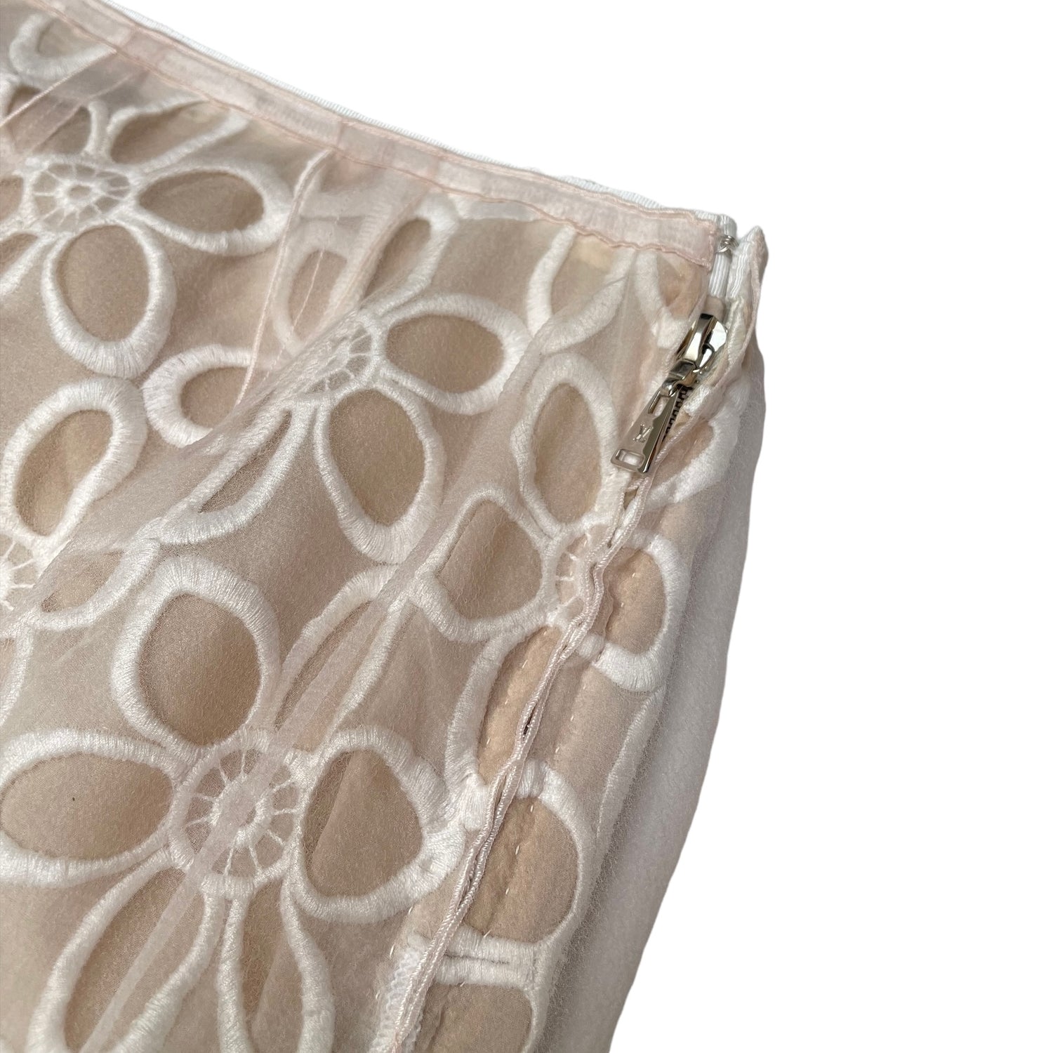 Light pink tulle and white lace skirt with floral design. Silver-tone zipper closure. Size 34.