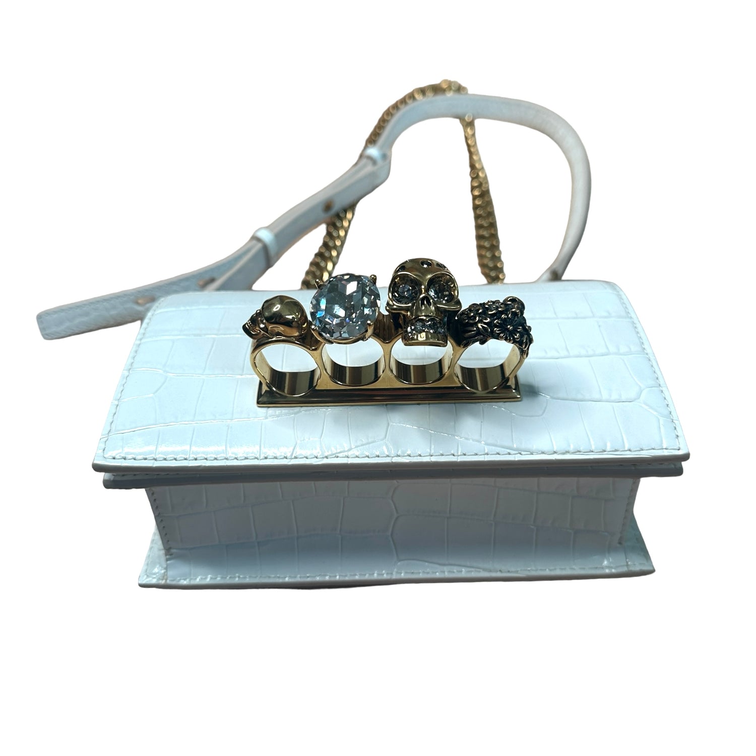Alexander McQueen crossbody bag. White embossed leather. Gold-tone hardware. Chain strap with leather shoulder detail. Magnetic snap closure at flap. Adjustable chain drop. Can be worn as a shoulder bag or crossbody.