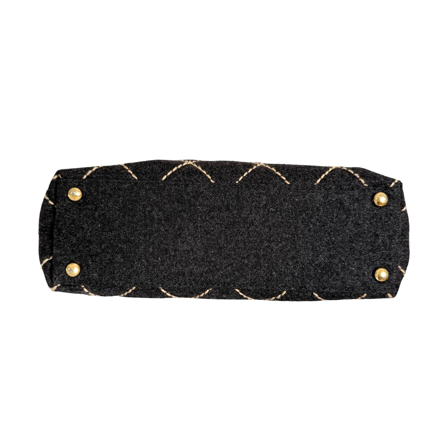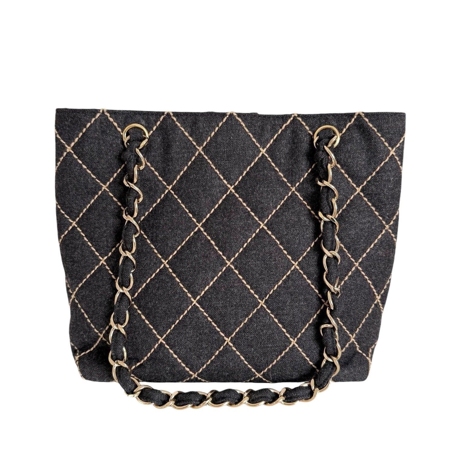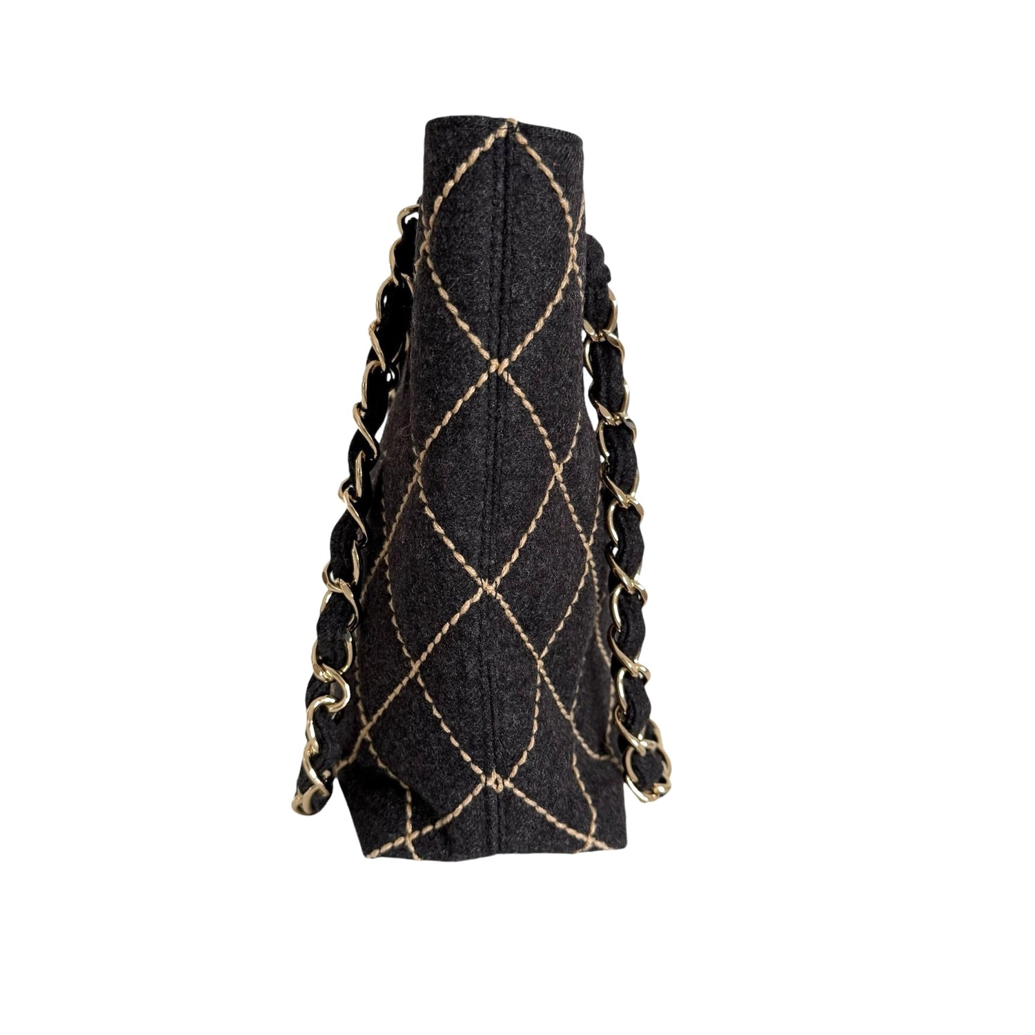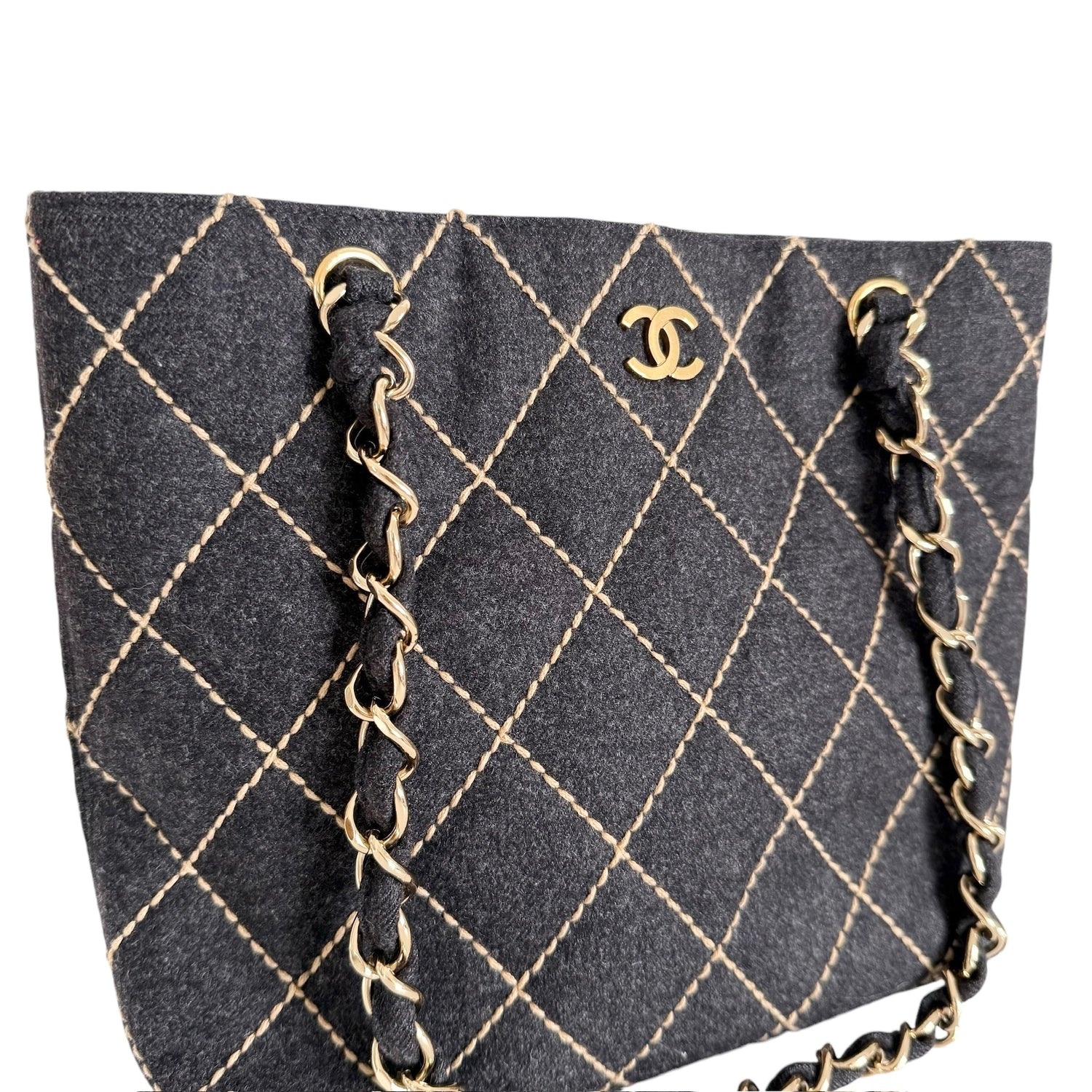 Chanel Wildstich grey felt bag. 2004 collection. Cream diamond quilted stitching on grey felt. Gold-tone hardware. Flat CC logo. Double chain handles. Magnetic snap closure. One interior zipper pocket. One interior slit pocket. CC logo lining. Protective feet at base.
