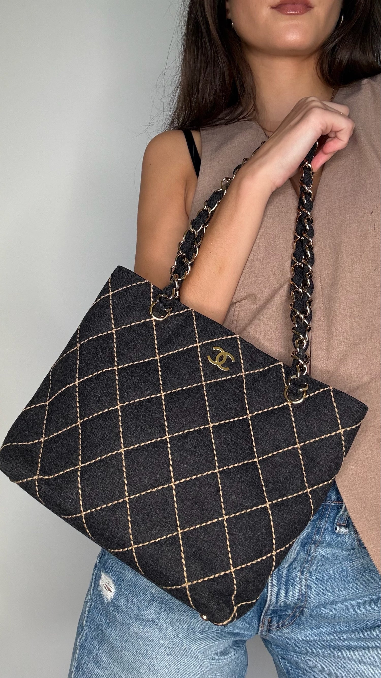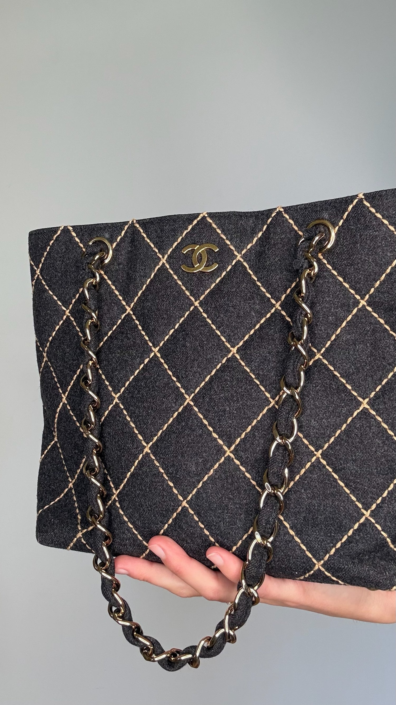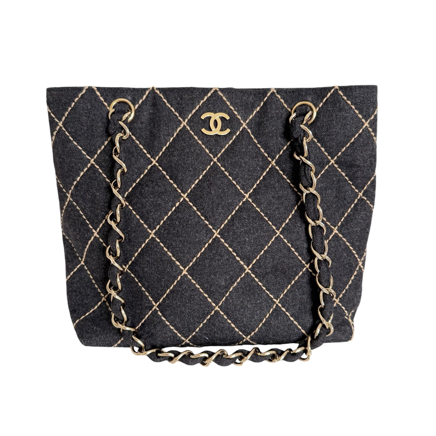 Chanel Wildstich grey felt bag. 2004 collection. Cream diamond quilted stitching on grey felt. Gold-tone hardware. Flat CC logo. Double chain handles. Magnetic snap closure. One interior zipper pocket. One interior slit pocket. CC logo lining. Protective feet at base.