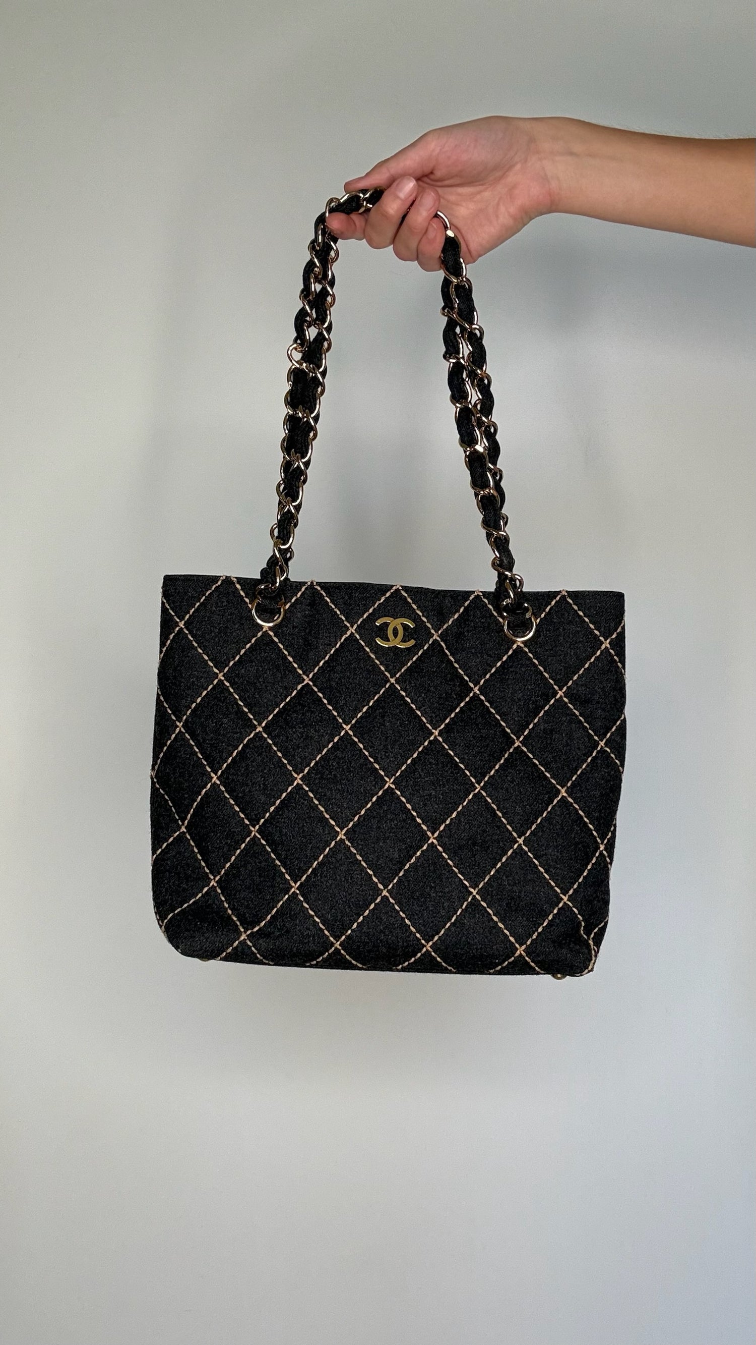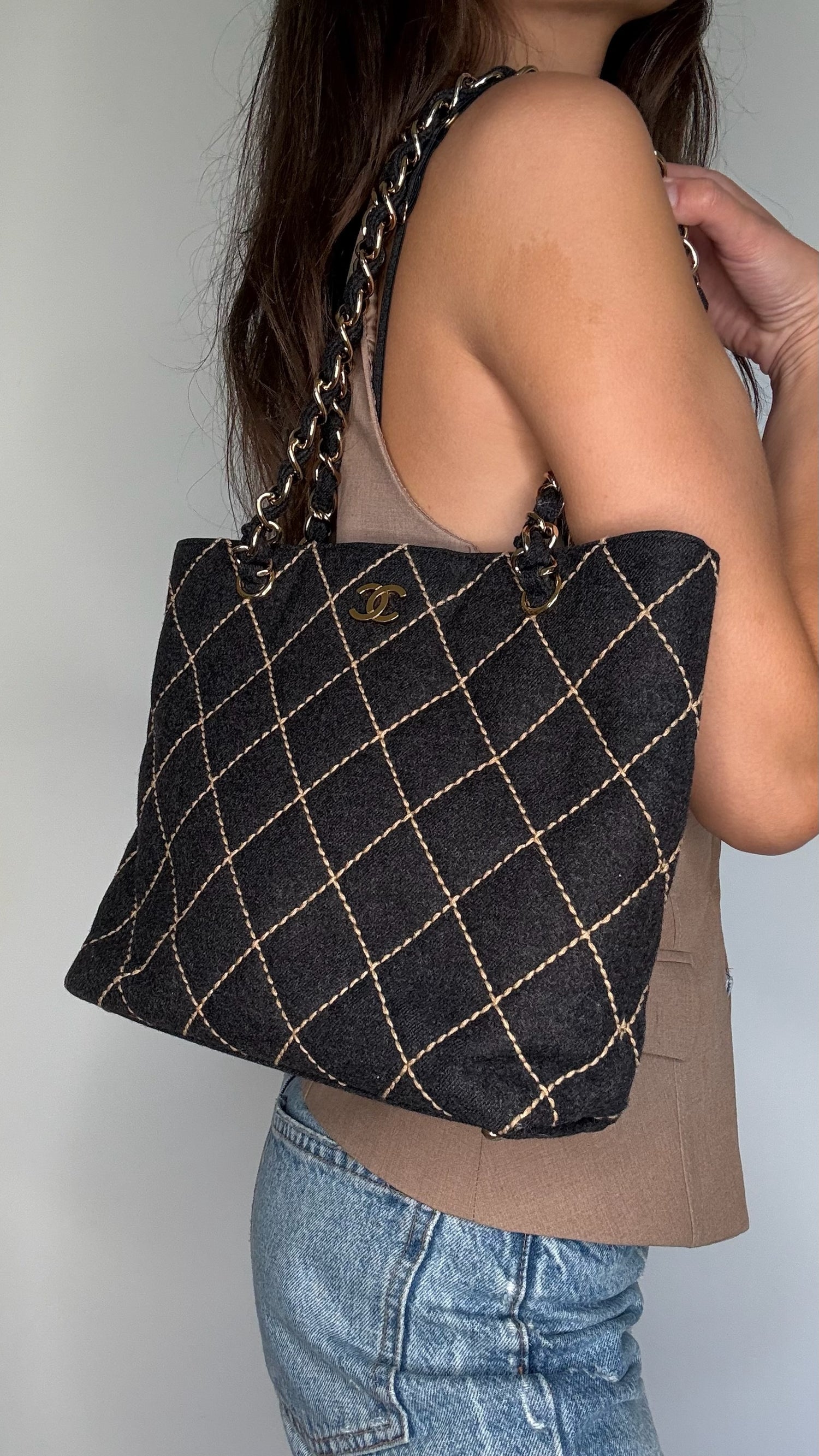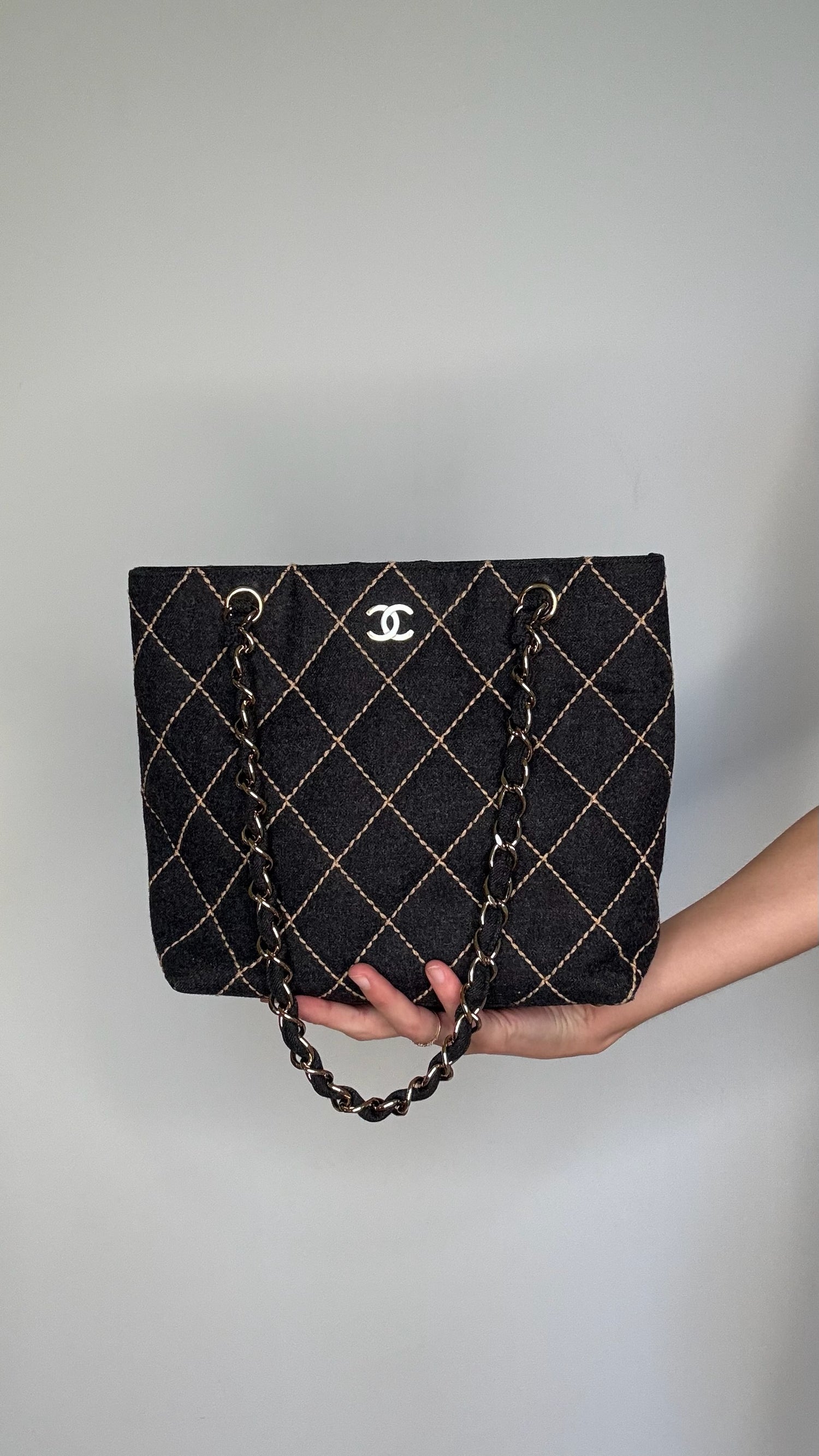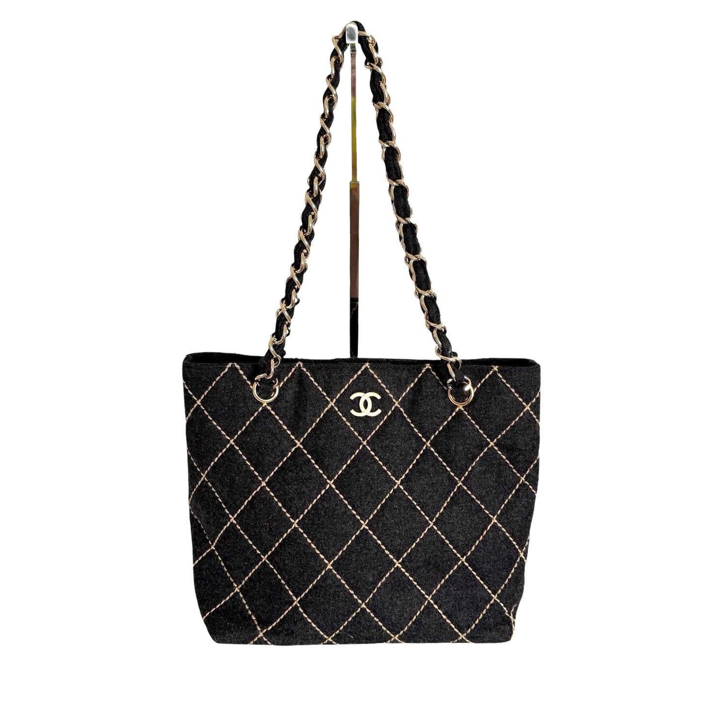 Chanel Wildstich grey felt bag. 2004 collection. Cream diamond quilted stitching on grey felt. Gold-tone hardware. Flat CC logo. Double chain handles. Magnetic snap closure. One interior zipper pocket. One interior slit pocket. CC logo lining. Protective feet at base.