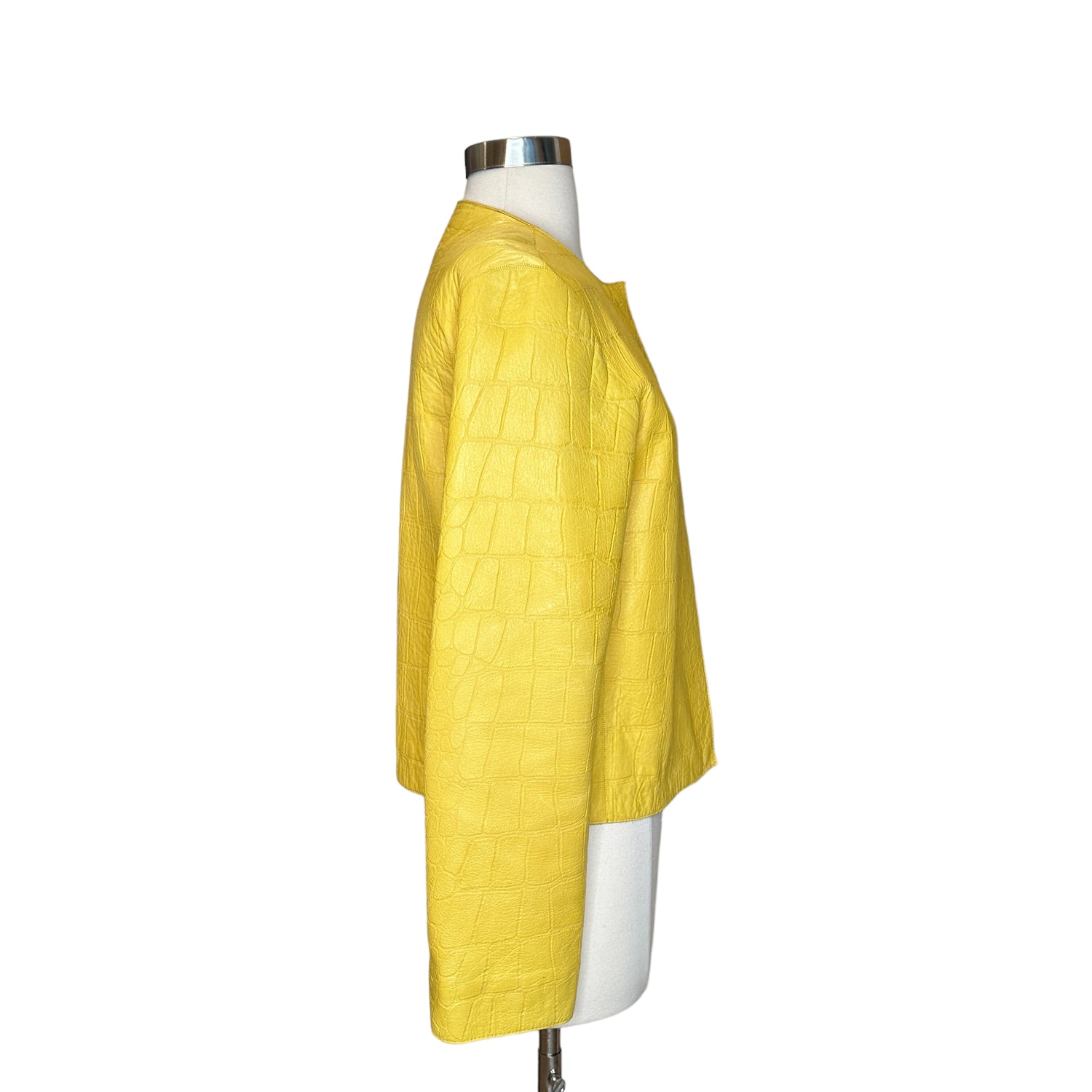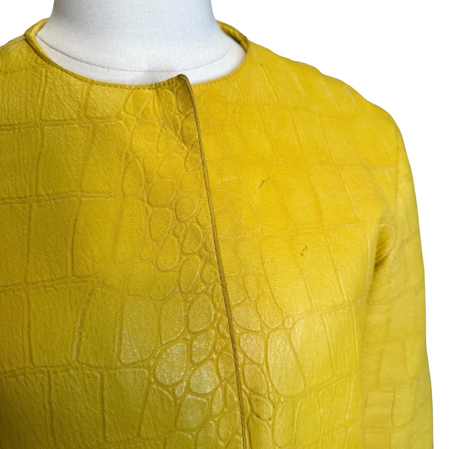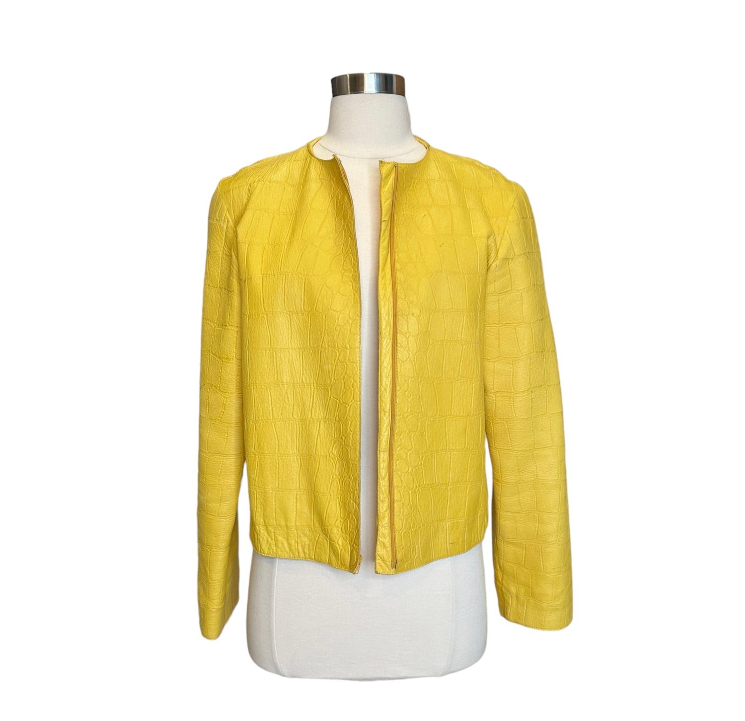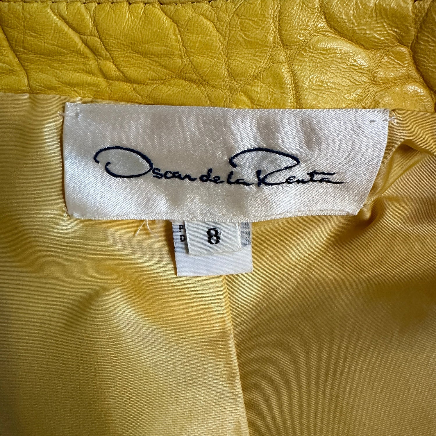 Oscar de la Renta yellow leather jacket. Crocodile embossed leather. Round neck. Zipper closure at front. Designer size 8.