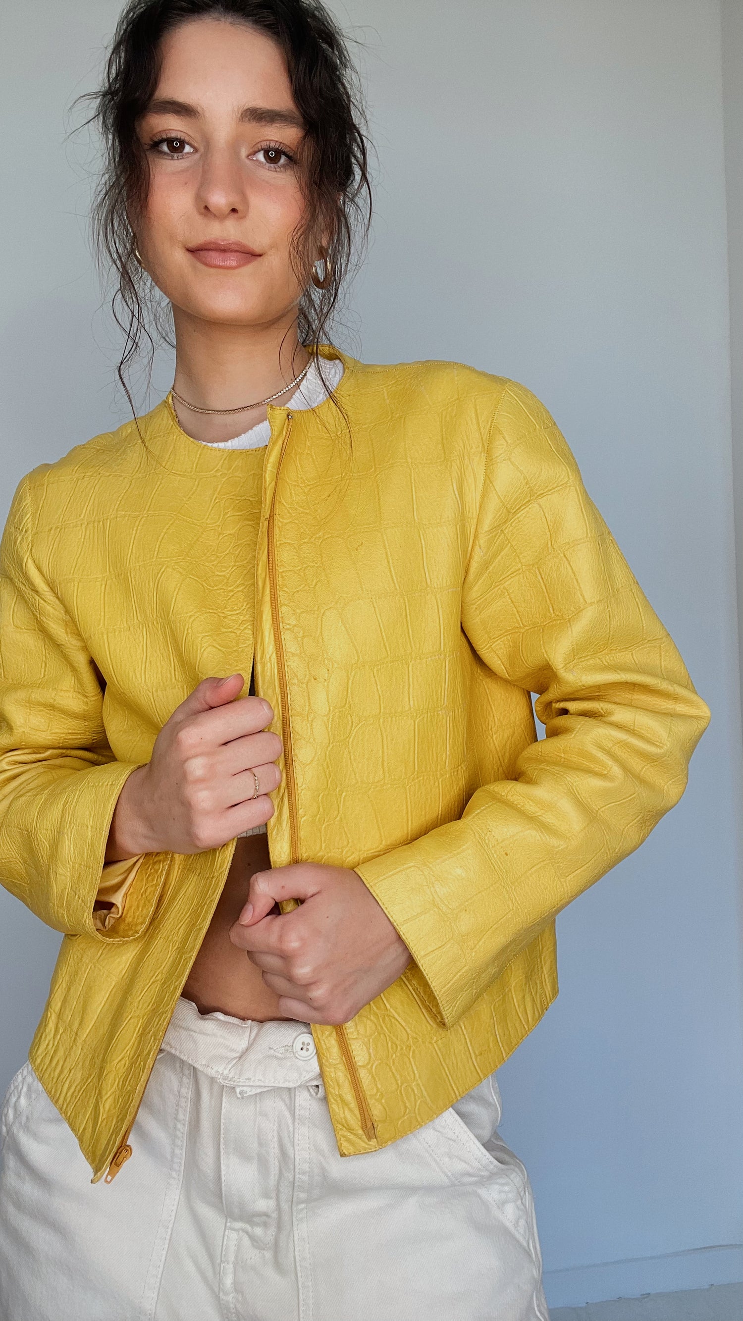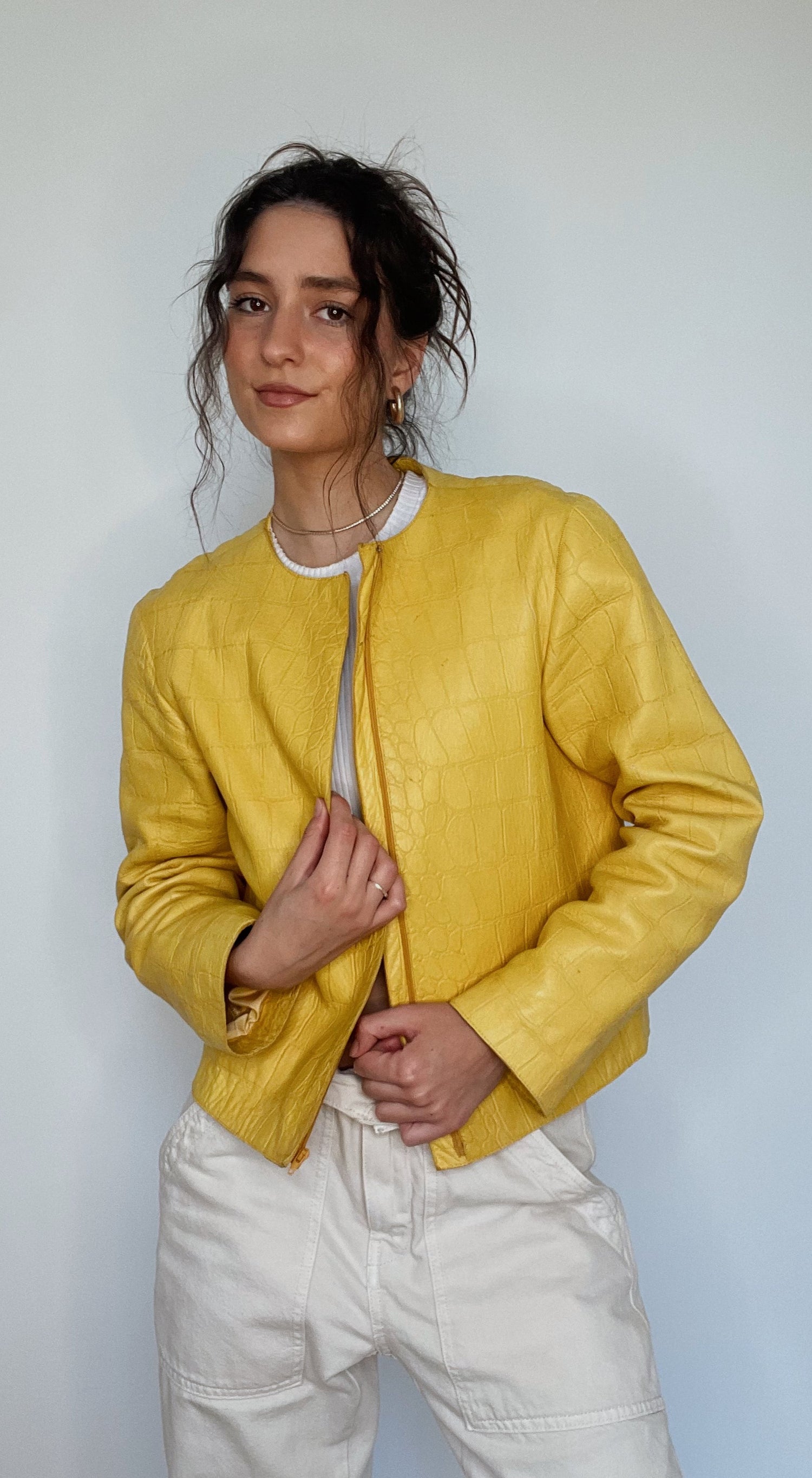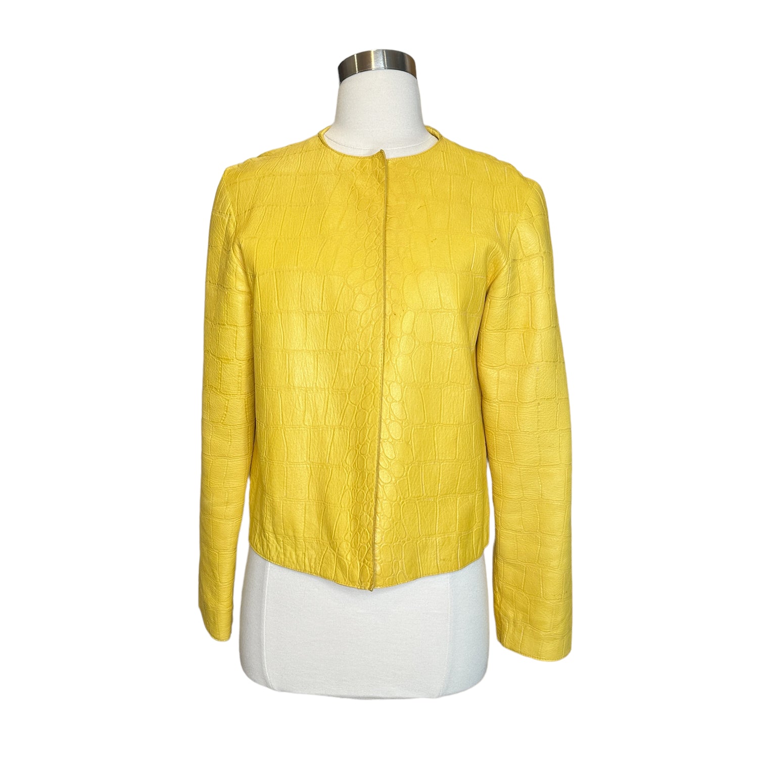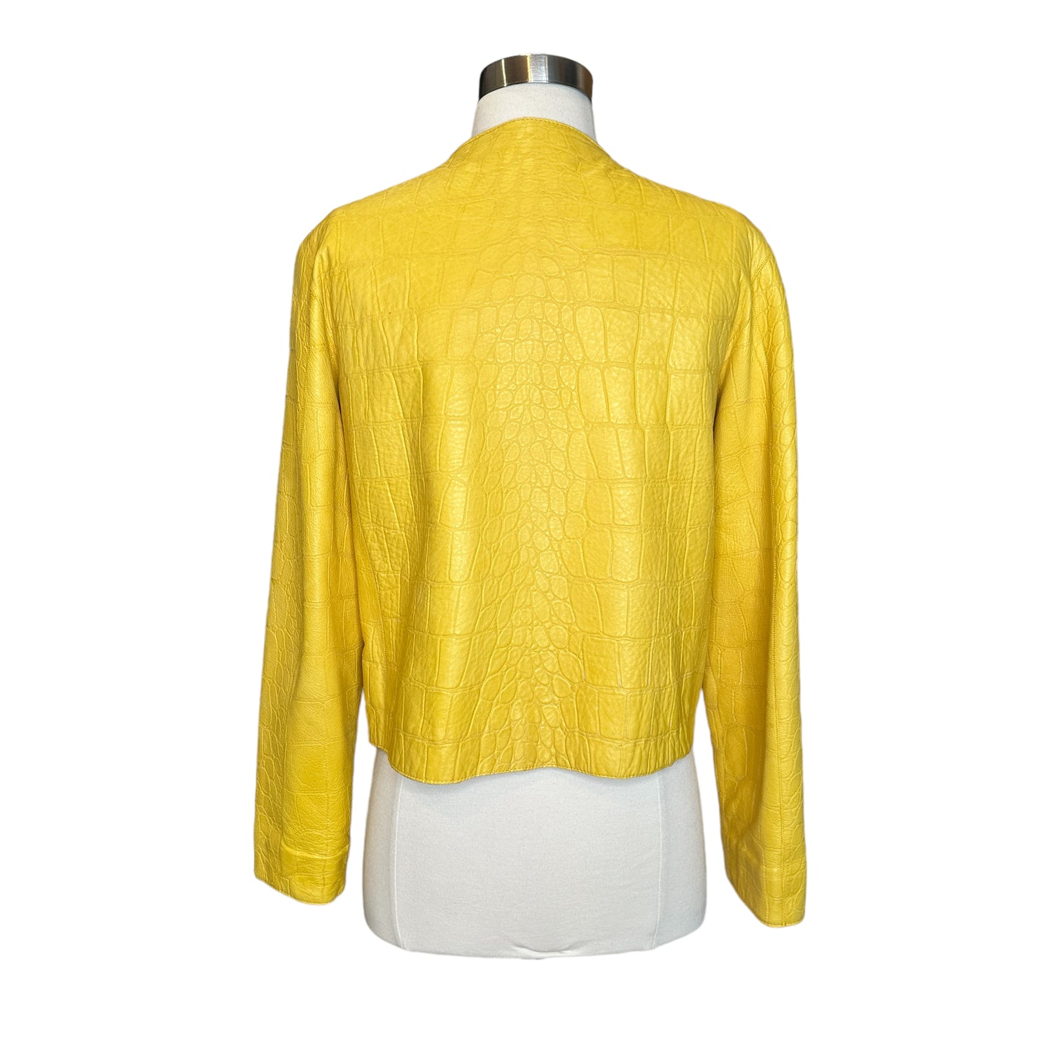 Oscar de la Renta yellow leather jacket. Crocodile embossed leather. Round neck. Zipper closure at front. Designer size 8.