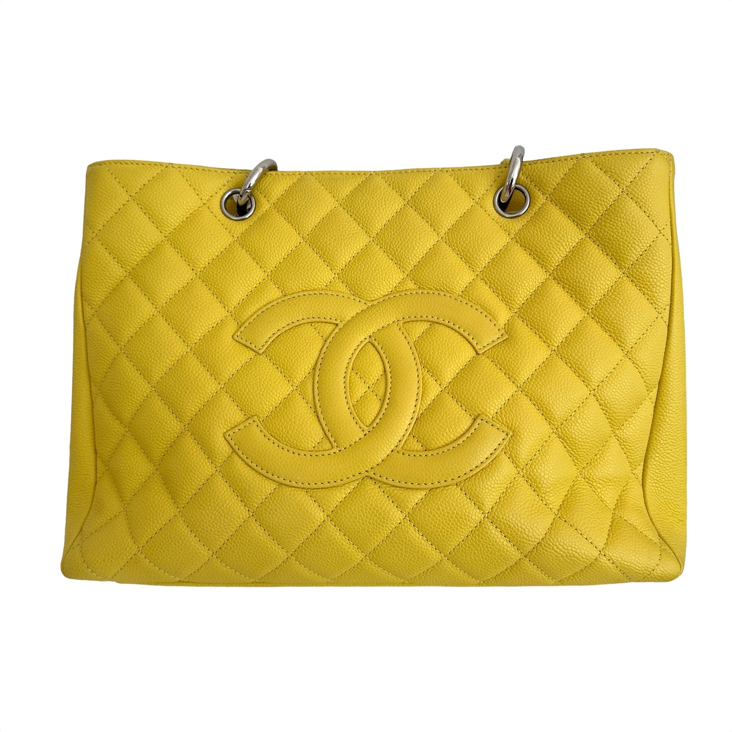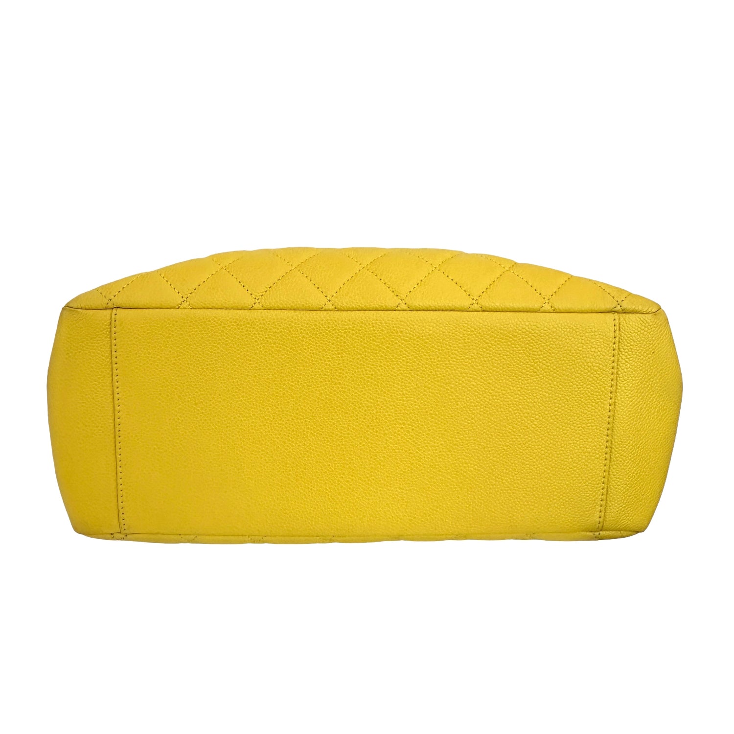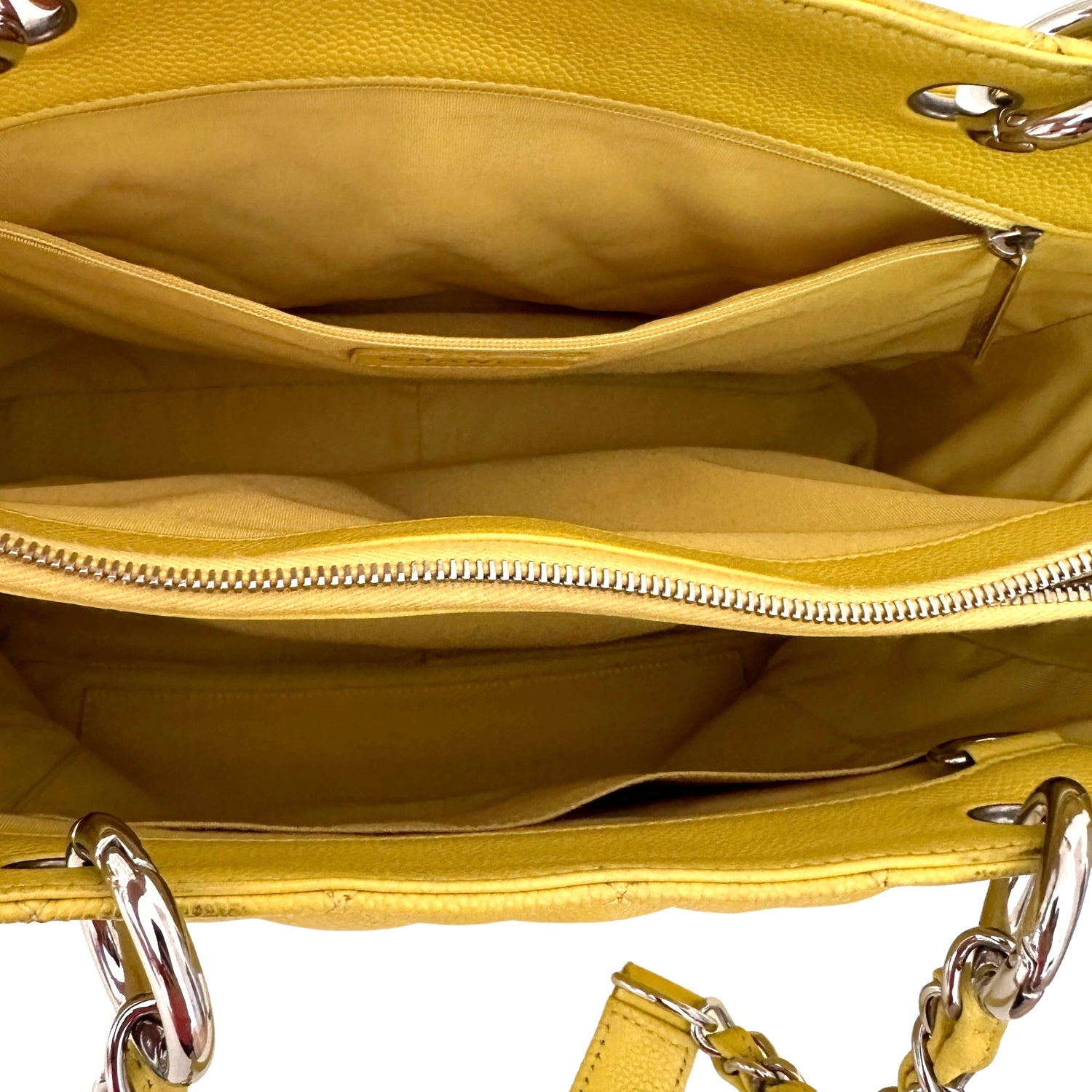 Chanel Grand Shopping yellow caviar tote. Silver-tone hardware. Open on top. Two compartments with one zipper pocket in the middle. One large pocket at back.