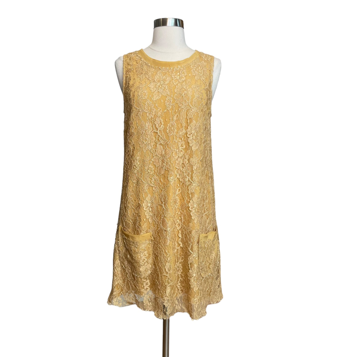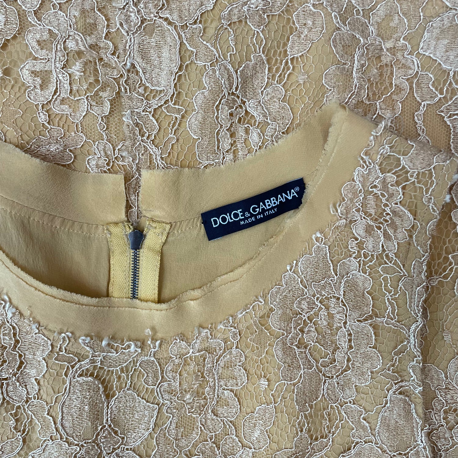 Dolce & Gabbana yellow lace shift dress. Concealed zipper at back. Pockets at front. Designer size 46.