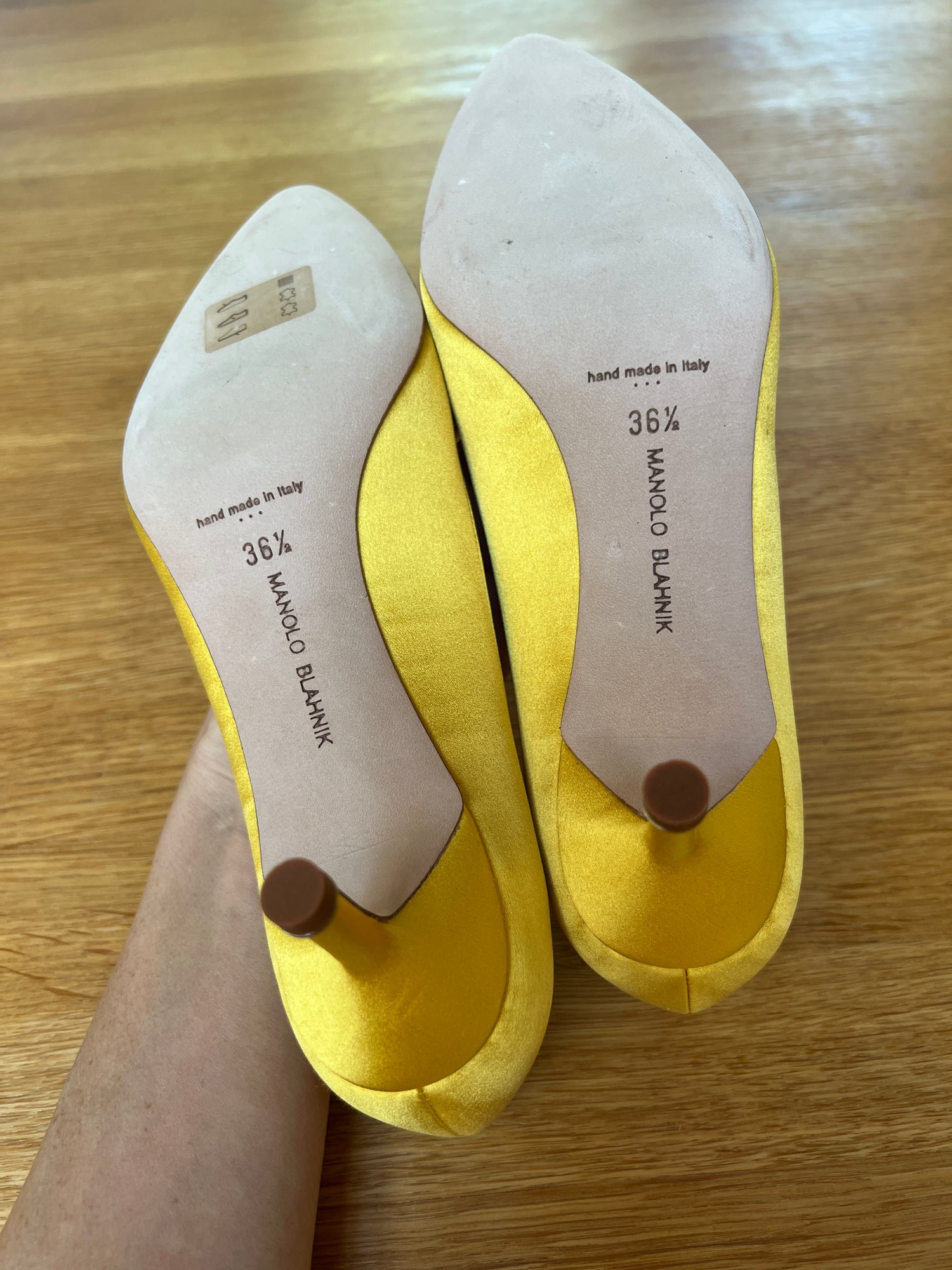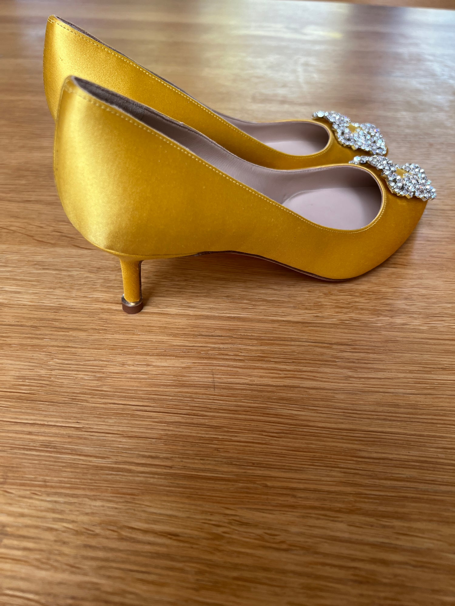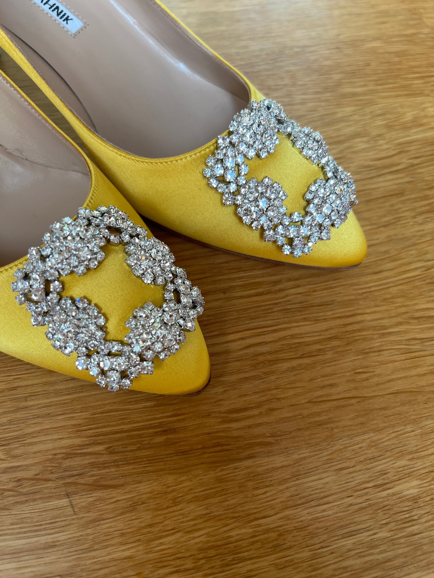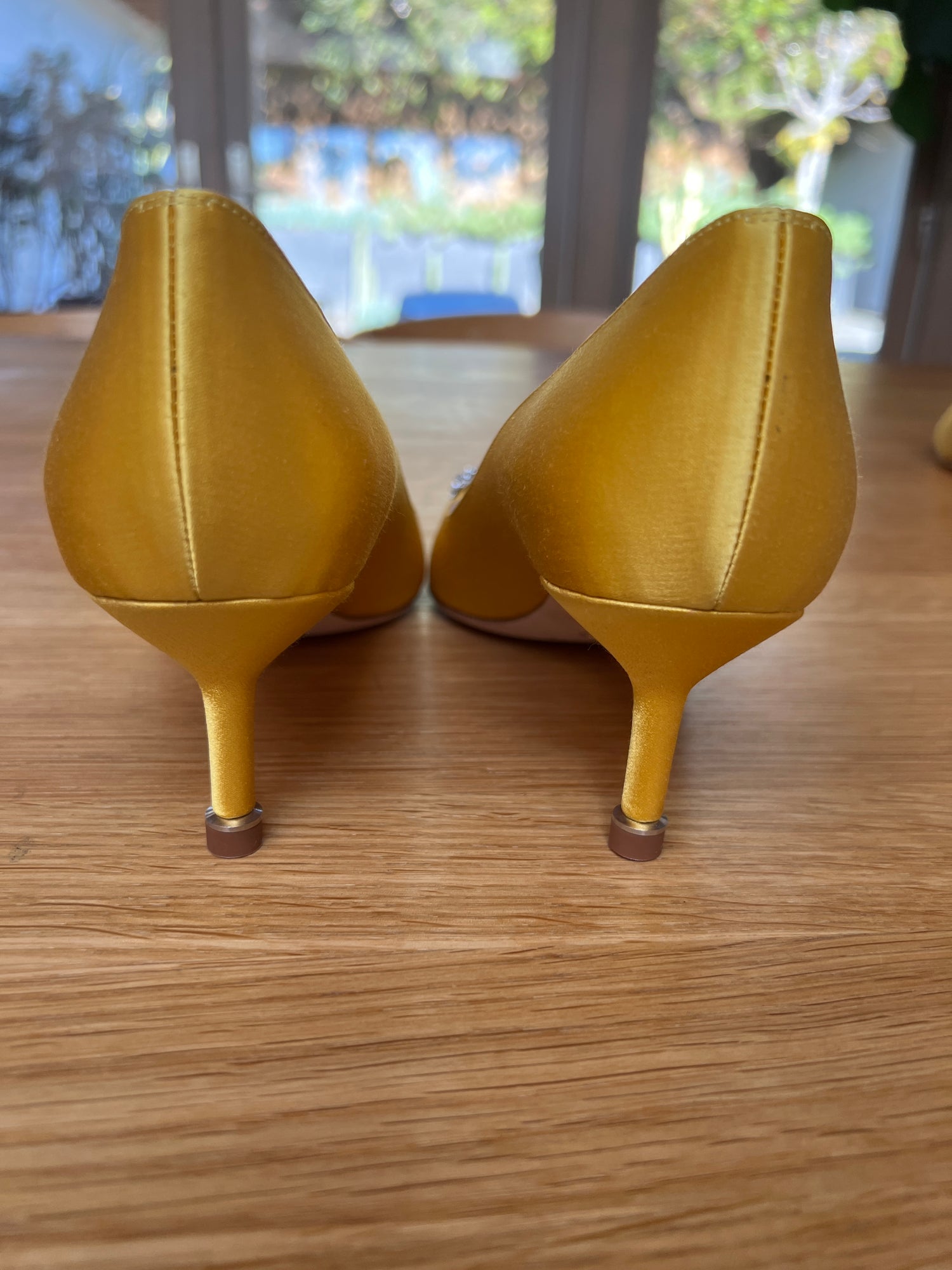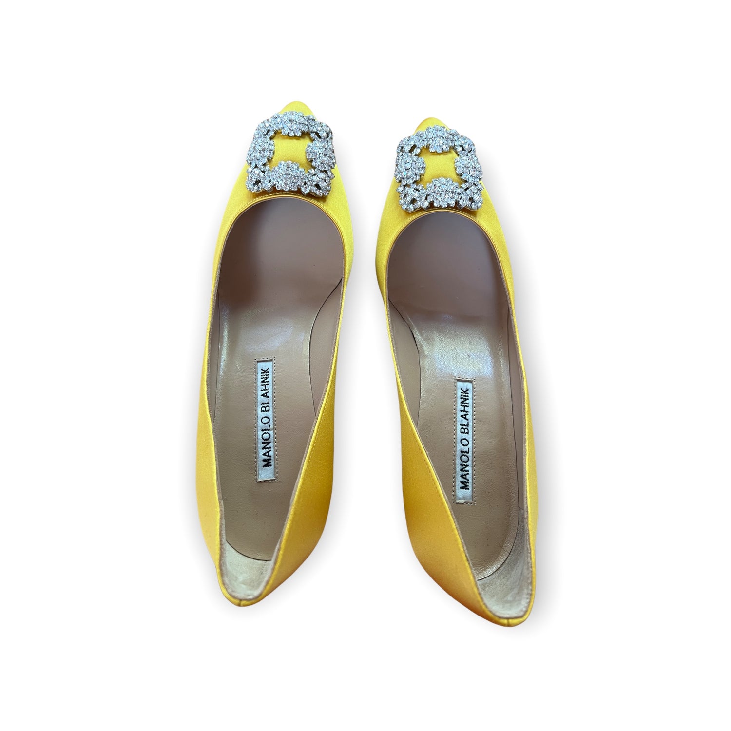 Yellow satin almond toe pumps featuring a square crystal buckle encased in a gunmetal frame. Finished with a stiletto mid heel.