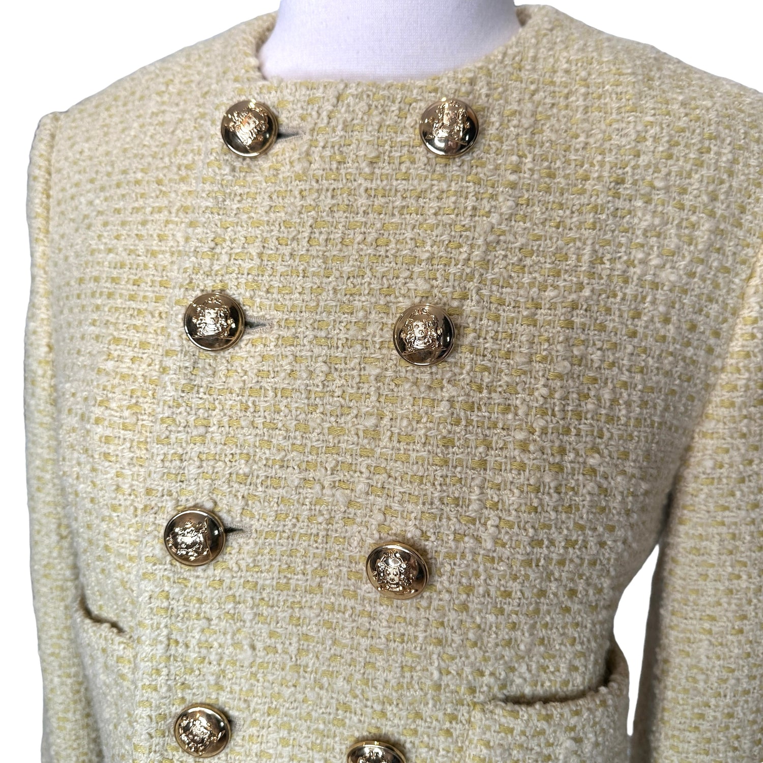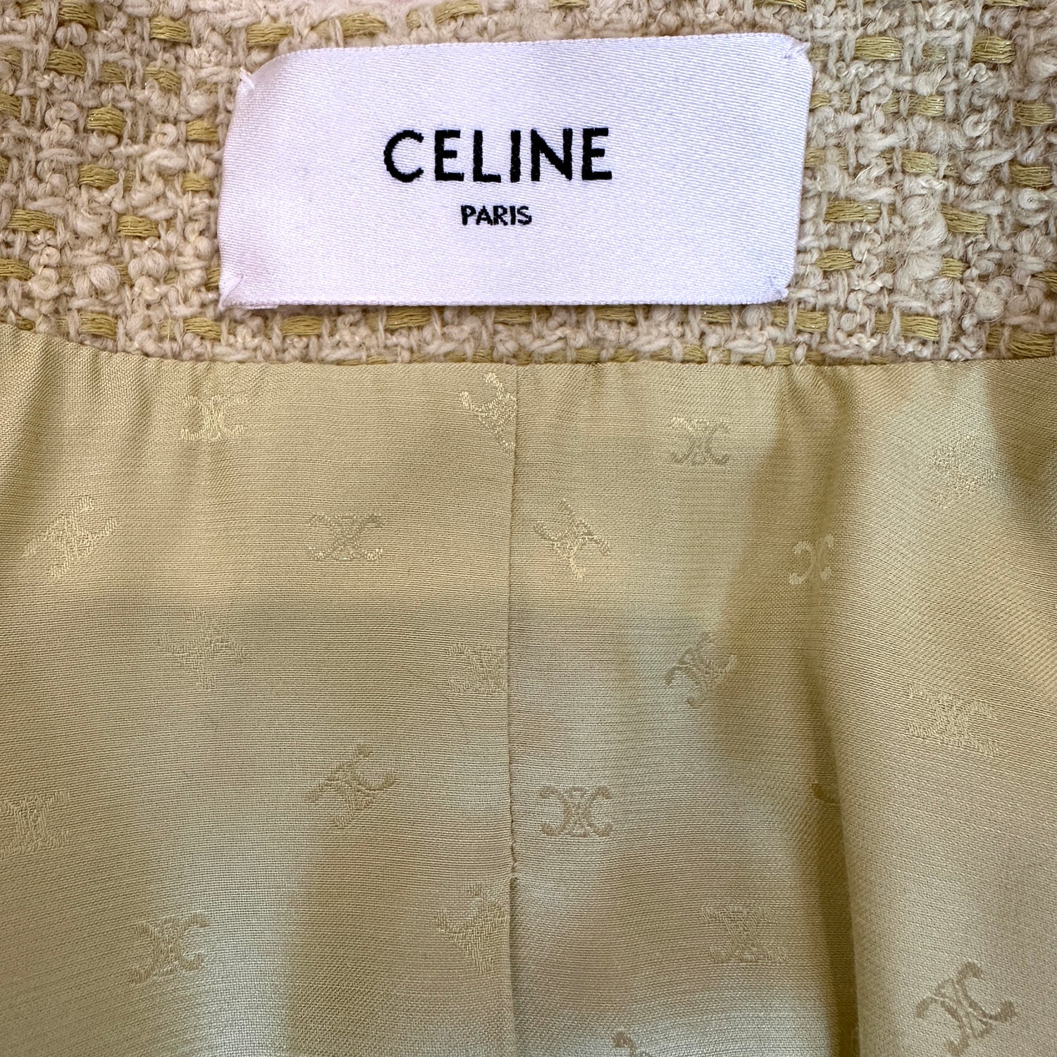 Celine pale yellow tweed jacket. Gold-tone buttons. Patch pockets. Triomphe logo lining. Designer size 36.