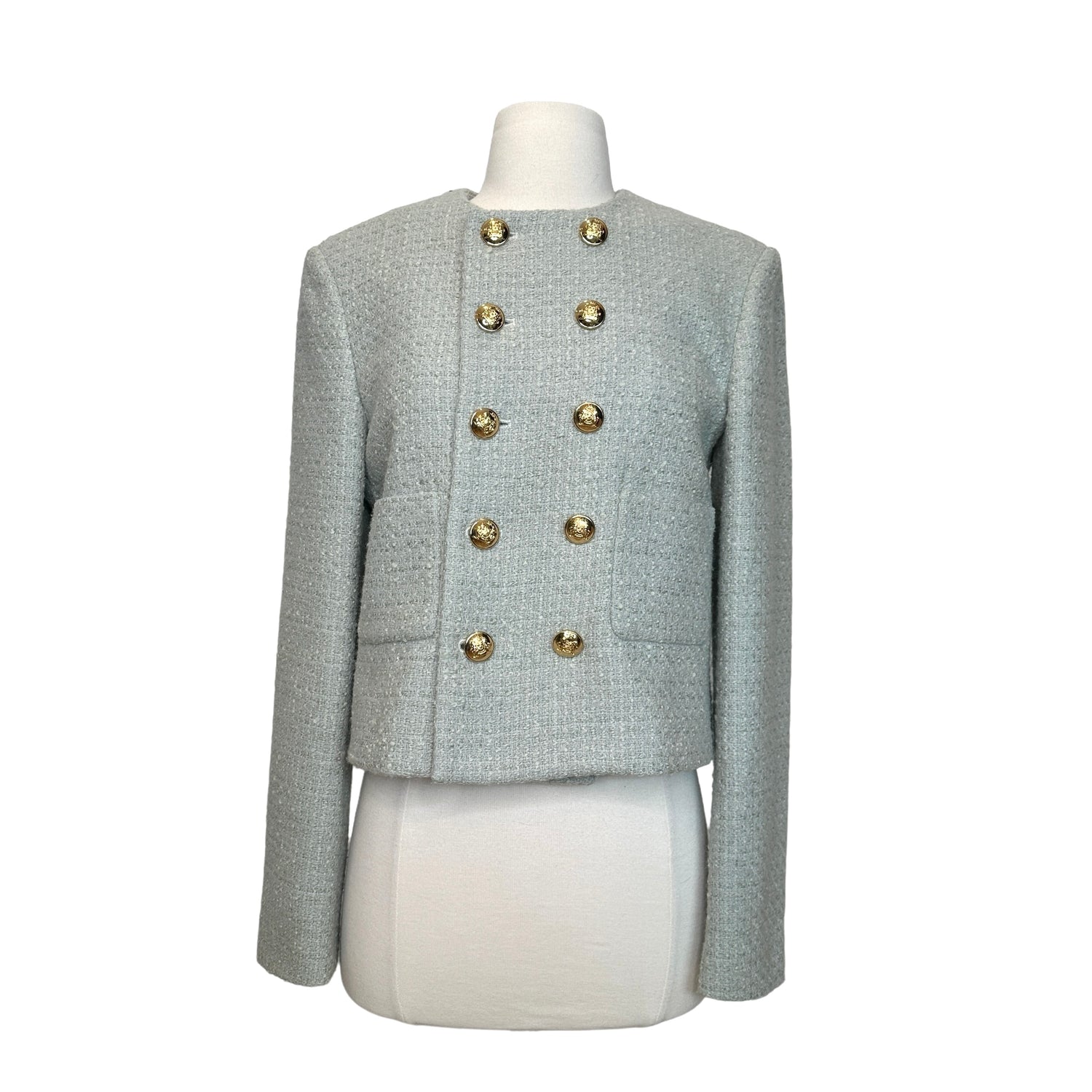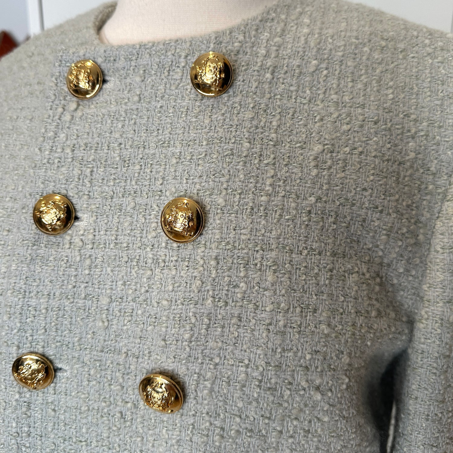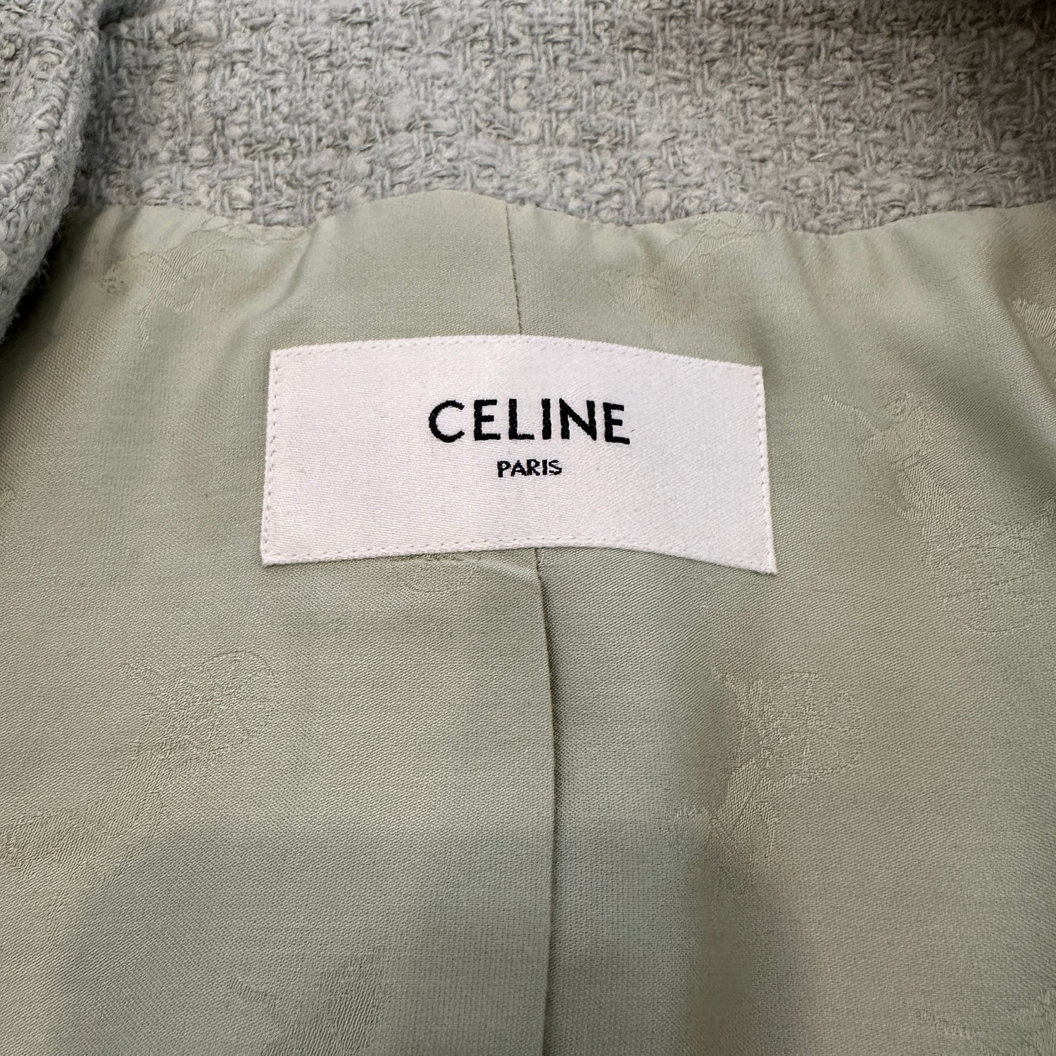 Celine pale green tweed jacket. Sage color. Gold-tone buttons. Patch pockets. Celine logo lining. Designer size 38.