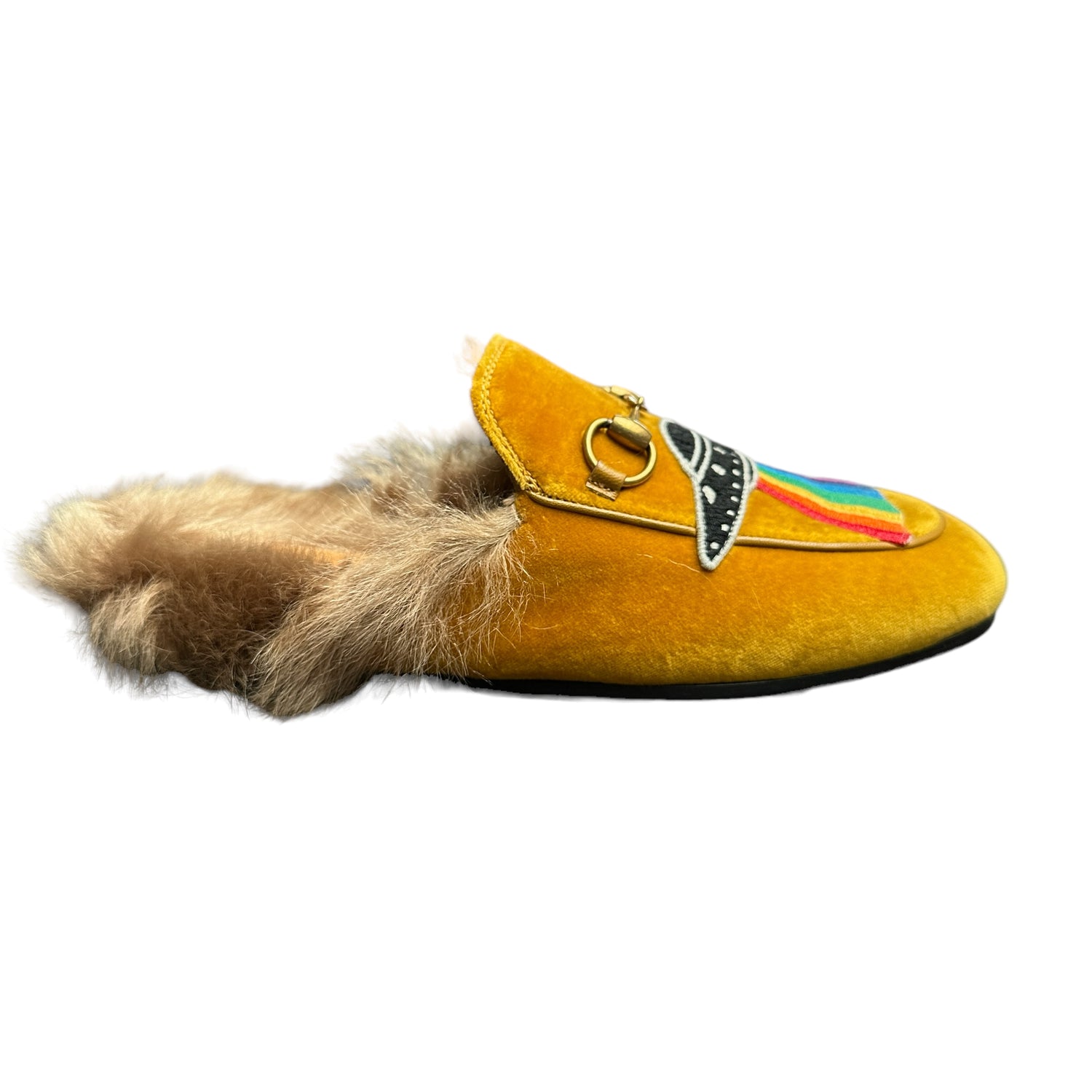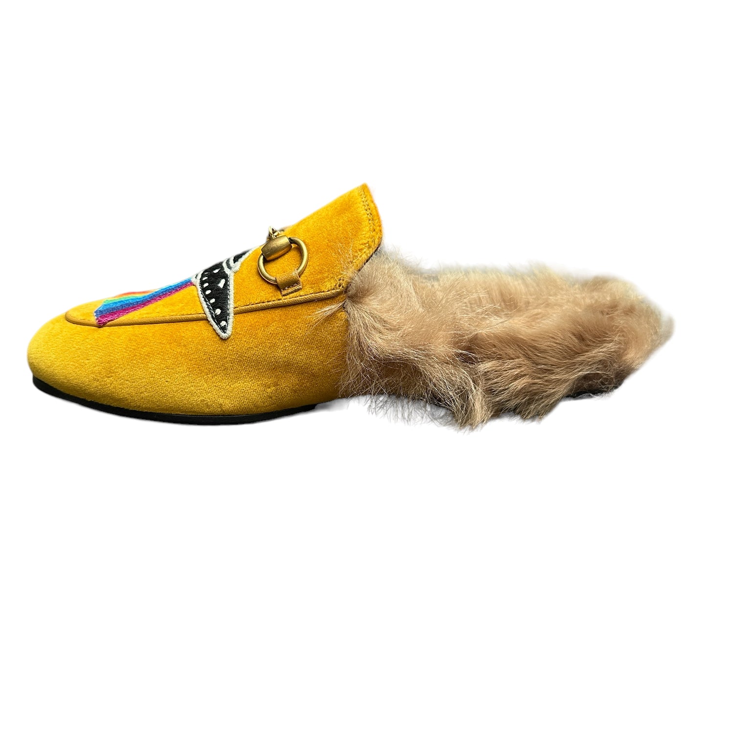 Gucci yellow velvet Princetown slides. Fur lining. UFO shooting rainbow embellishments. Super unique Princetown style. Designer size 35.