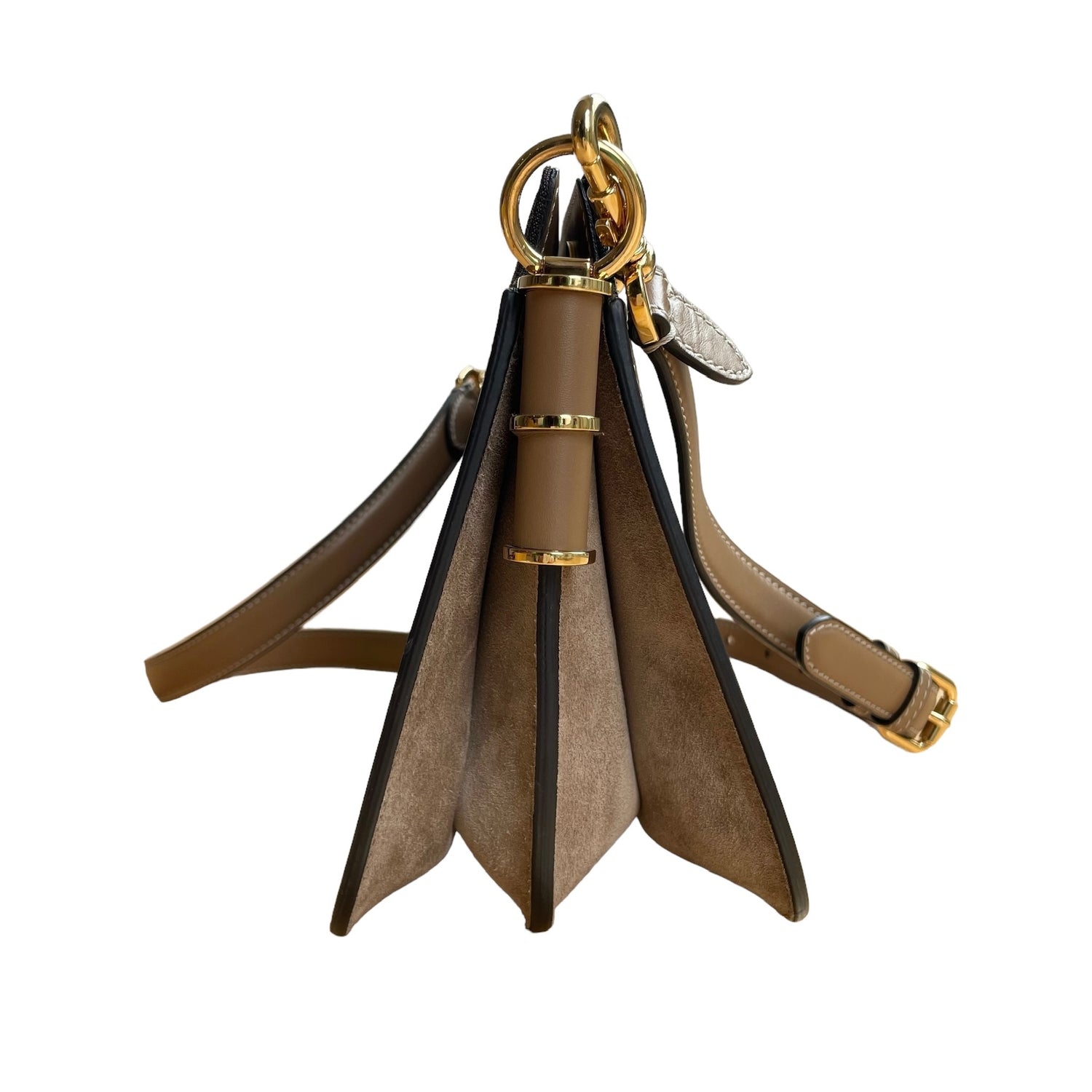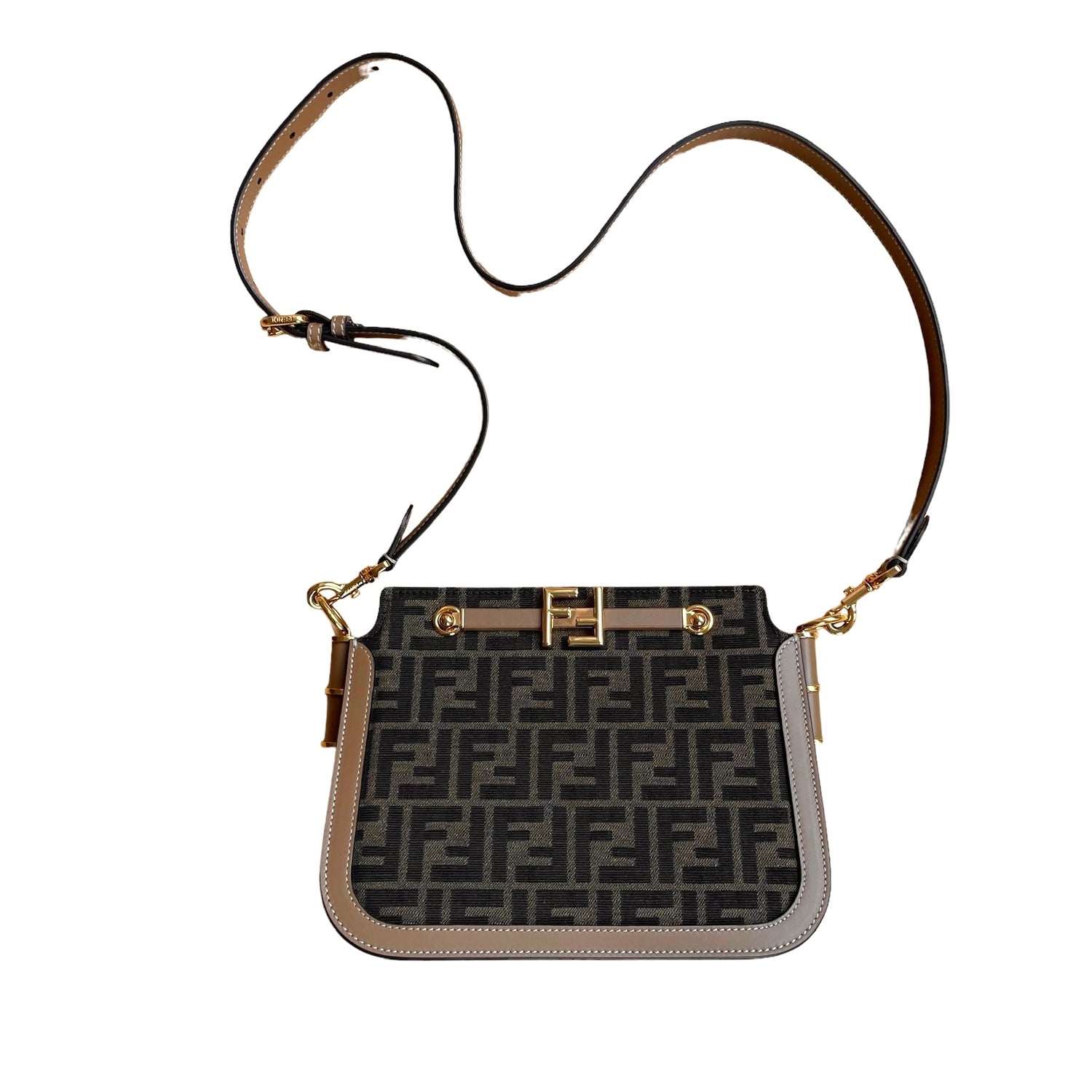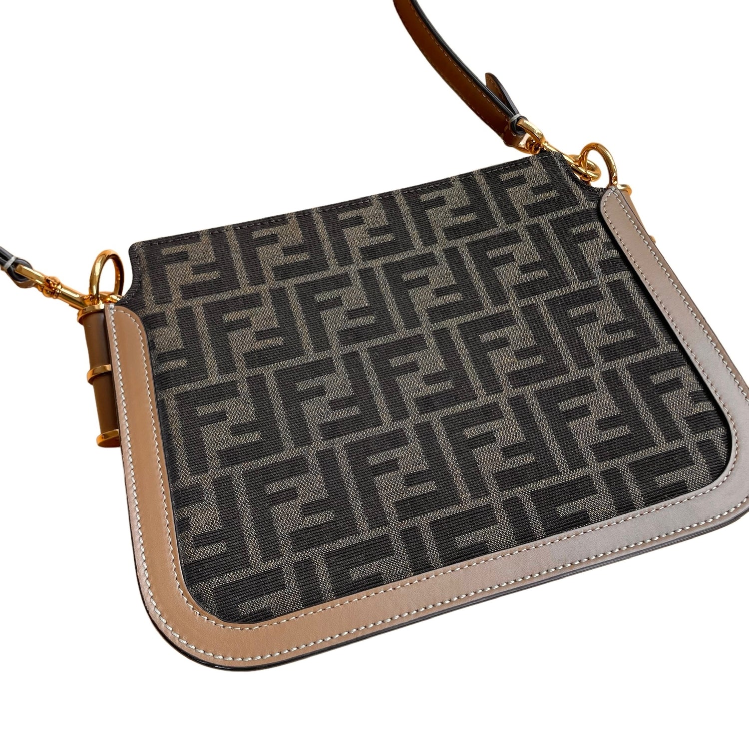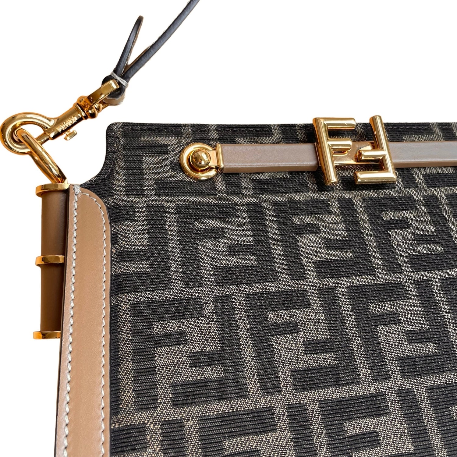 Fendi Touch crossbody bag. Zucca printed canvas. Beige leather and suede trims. Accordion opening. Suede interior.