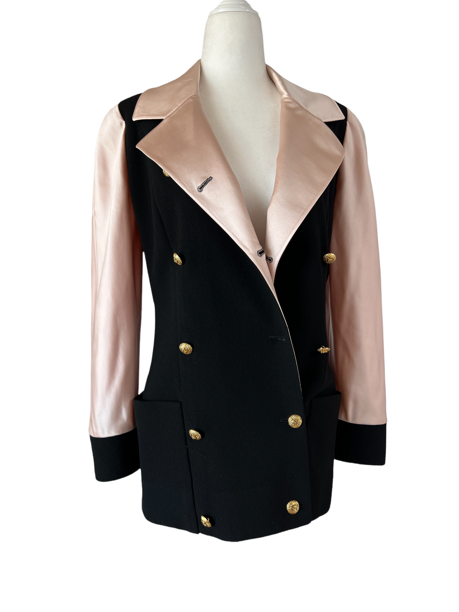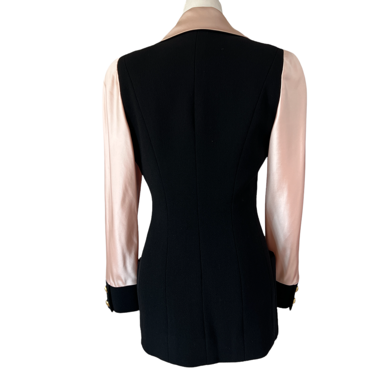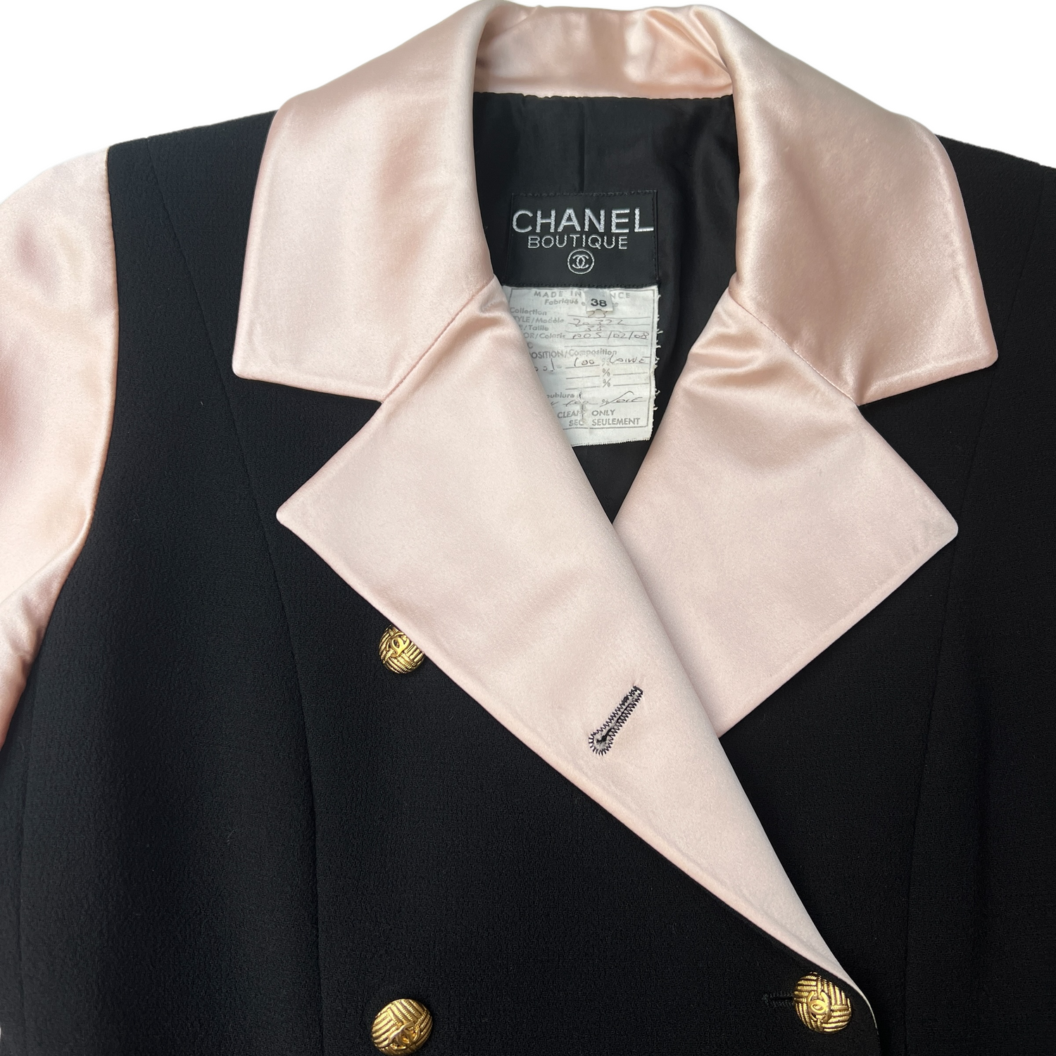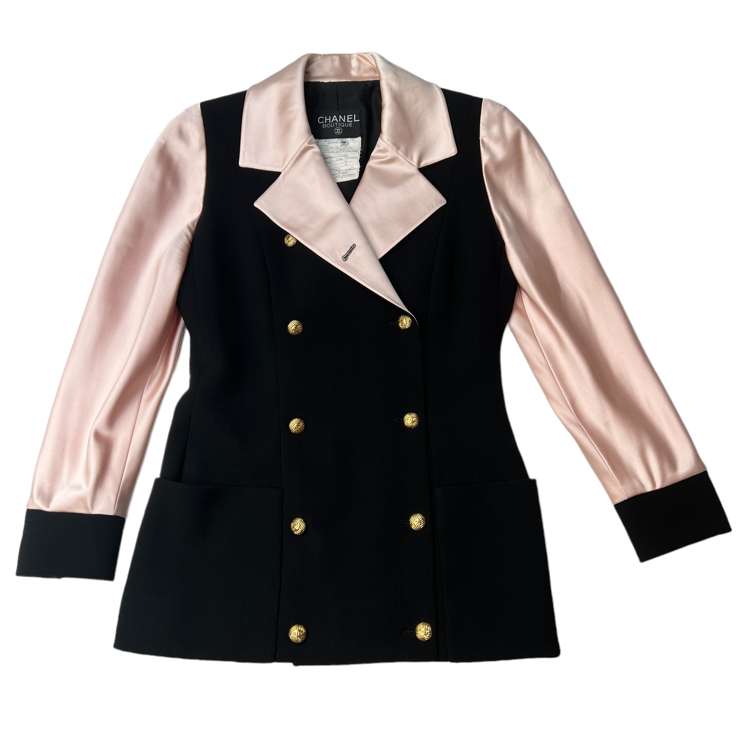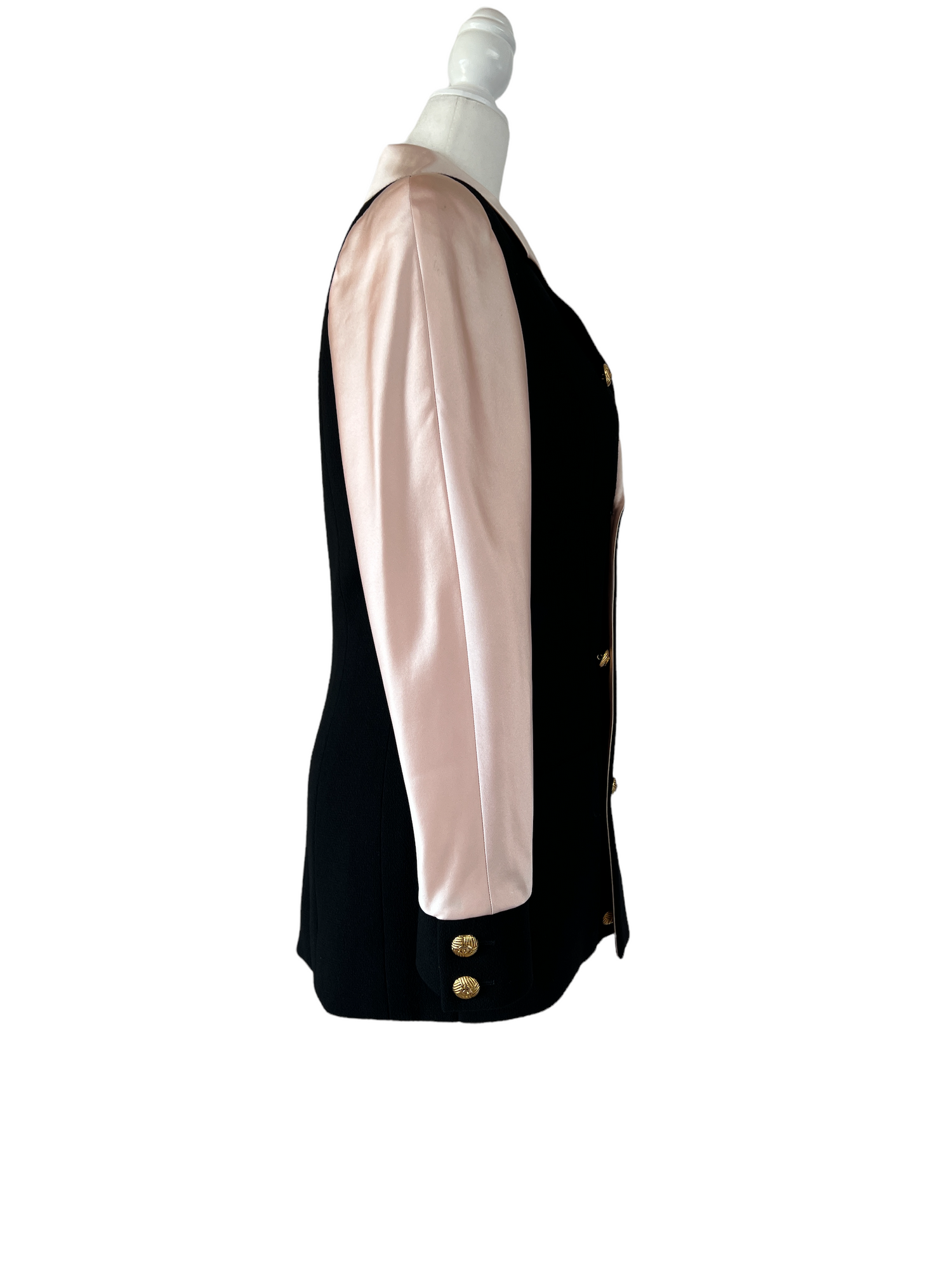 Vintage Chanel Blazer from 1990. Black wool and Light pink silk. Gold tone buttons. Incredible style worn open or closed. The collar can be left down and relaxed or worn up for an elevated, elegant style! Size 38.