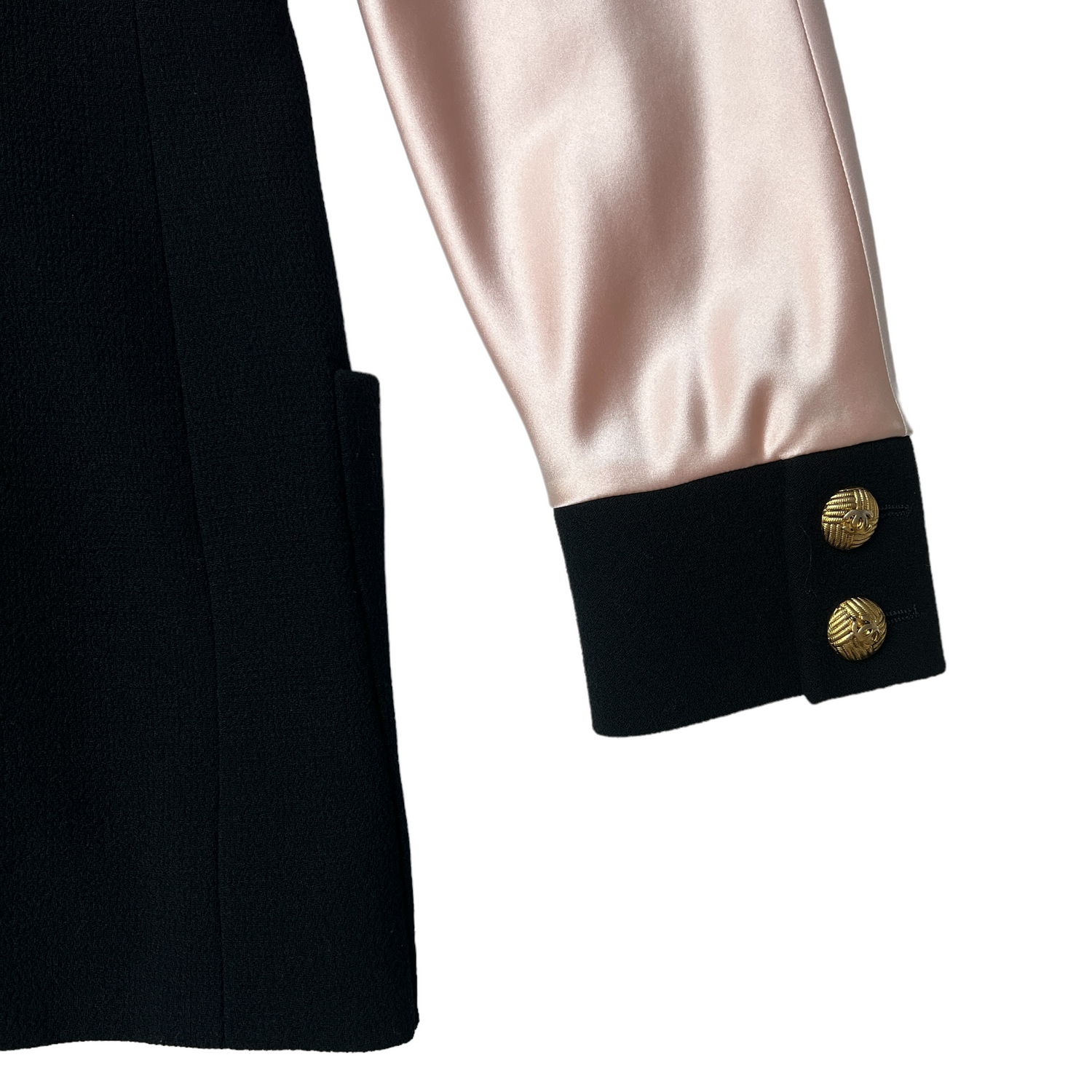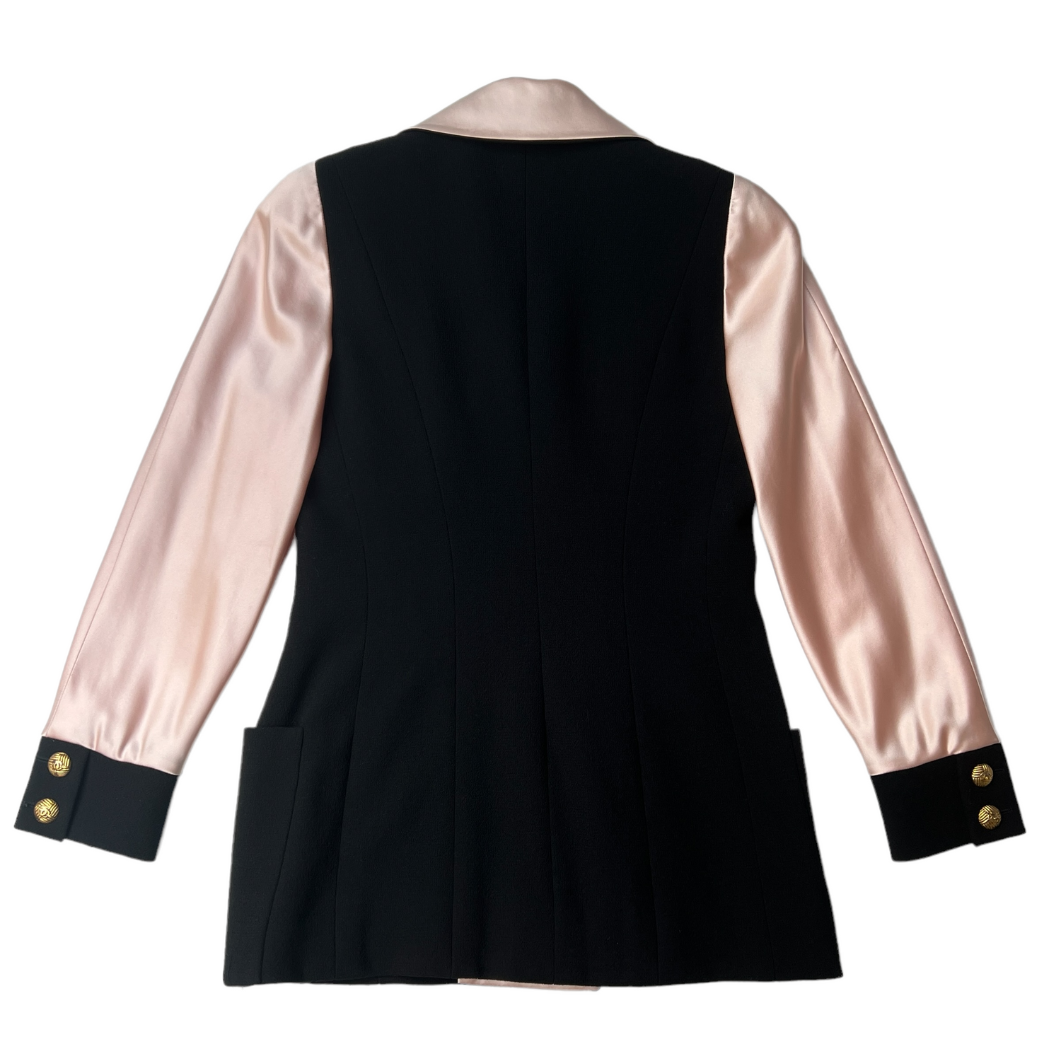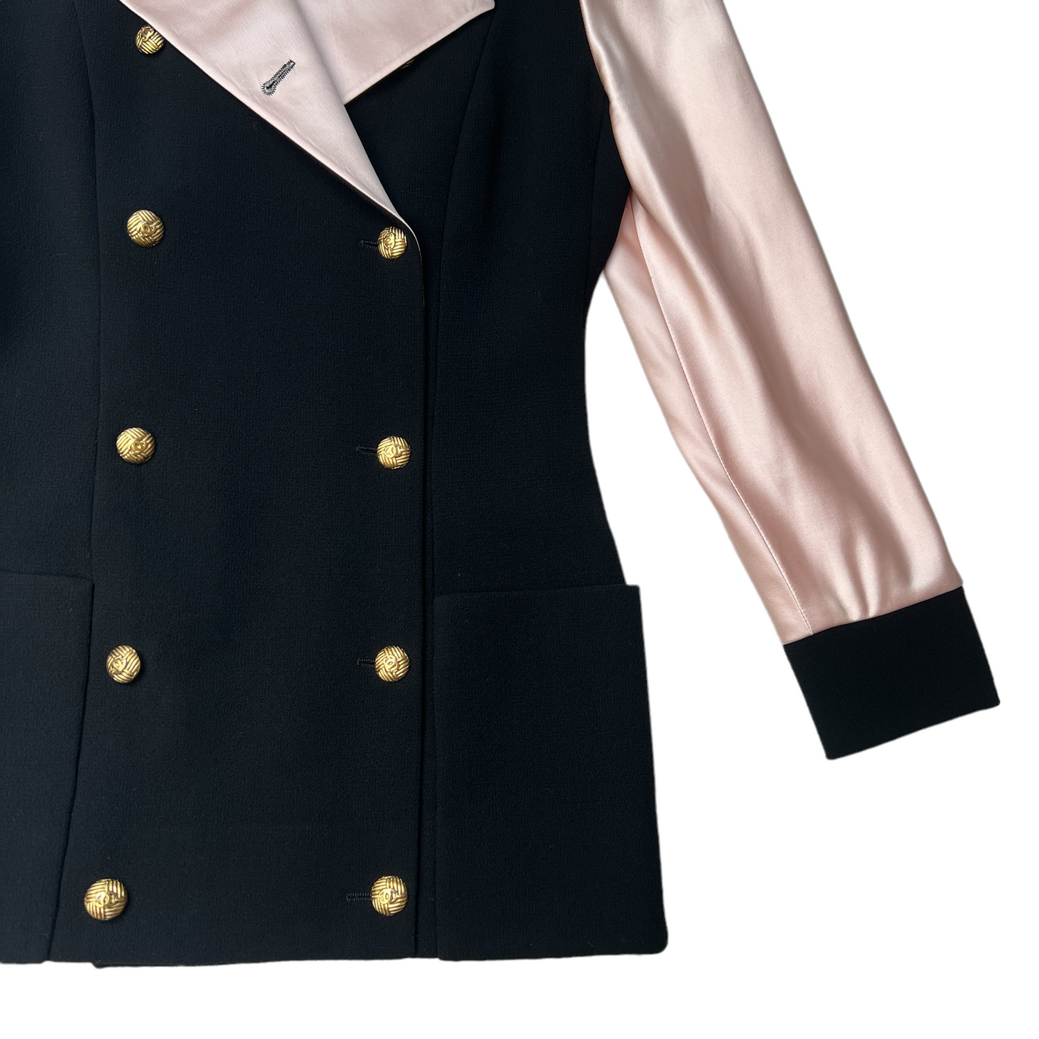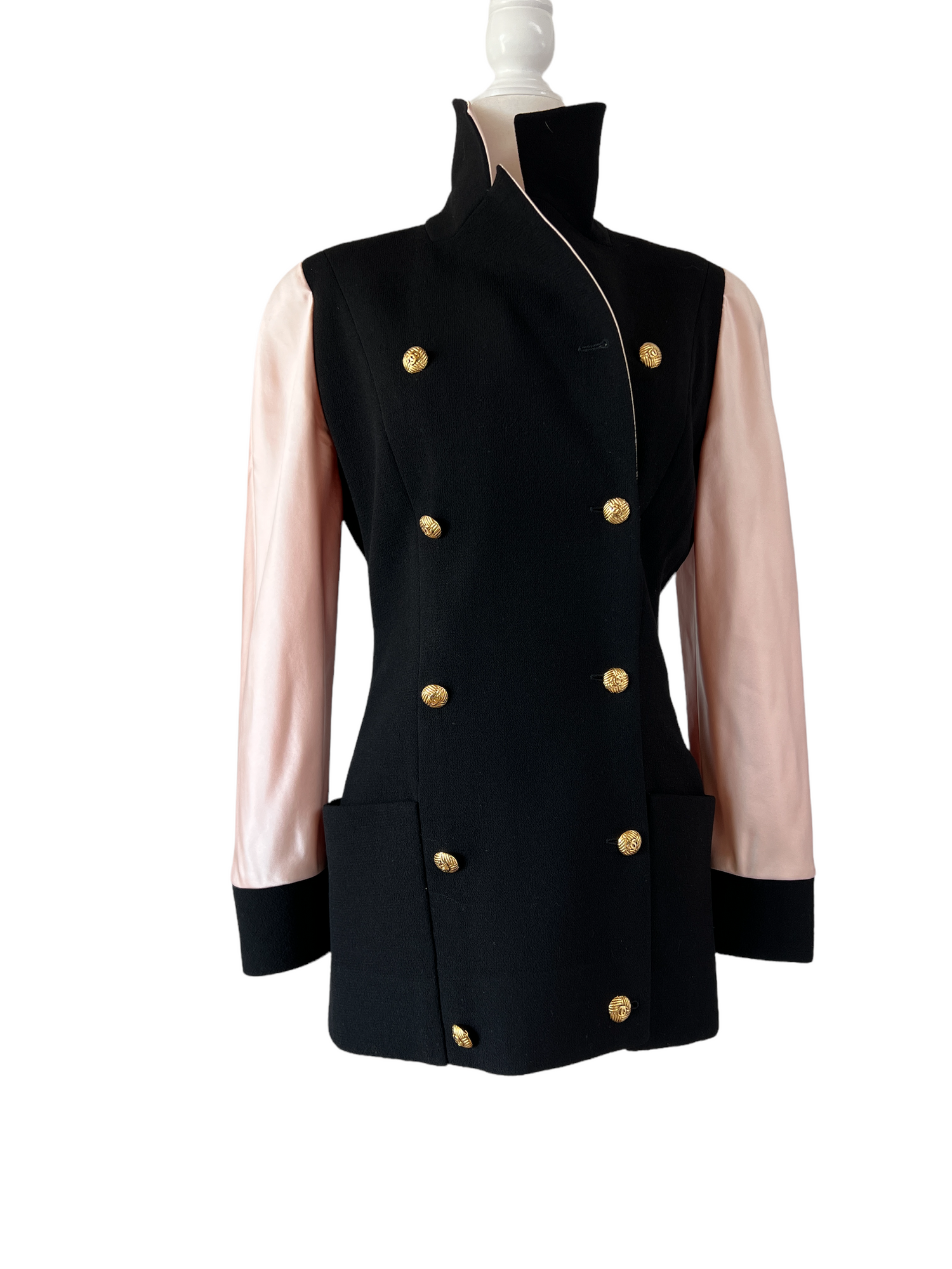 Vintage Chanel Blazer from 1990. Black wool and Light pink silk. Gold tone buttons. Incredible style worn open or closed. The collar can be left down and relaxed or worn up for an elevated, elegant style! Size 38.