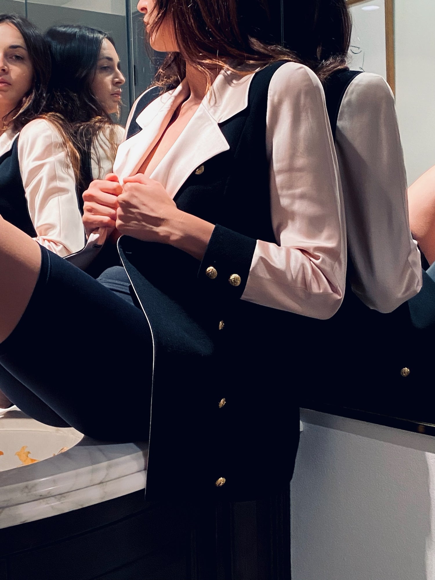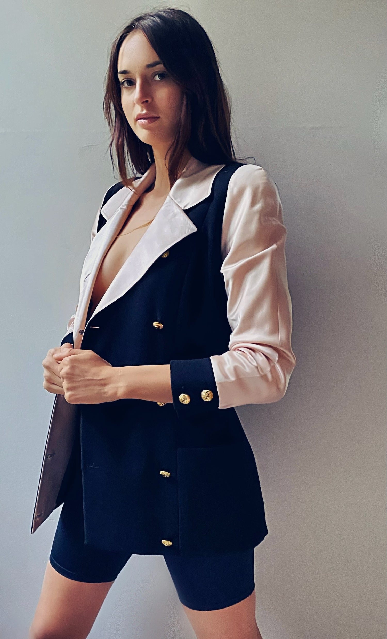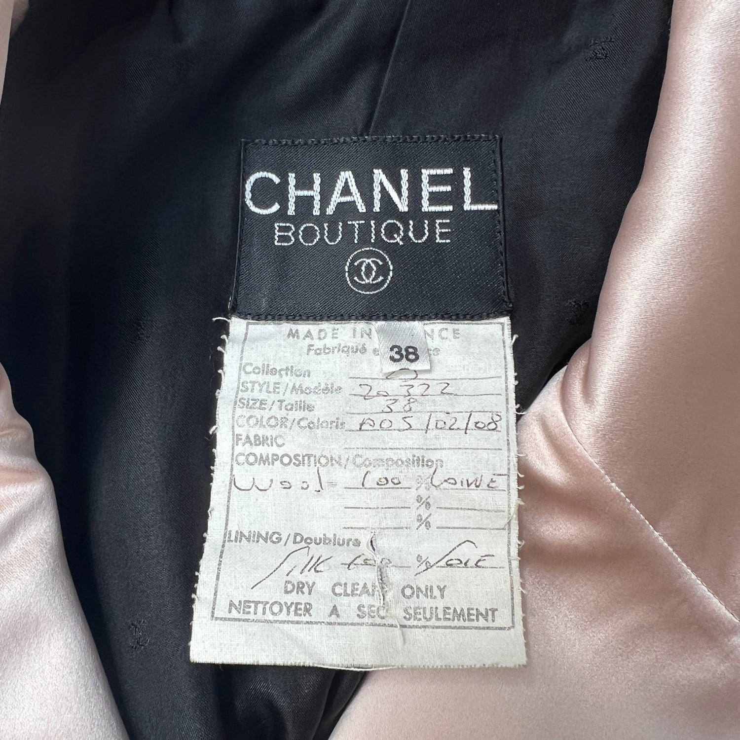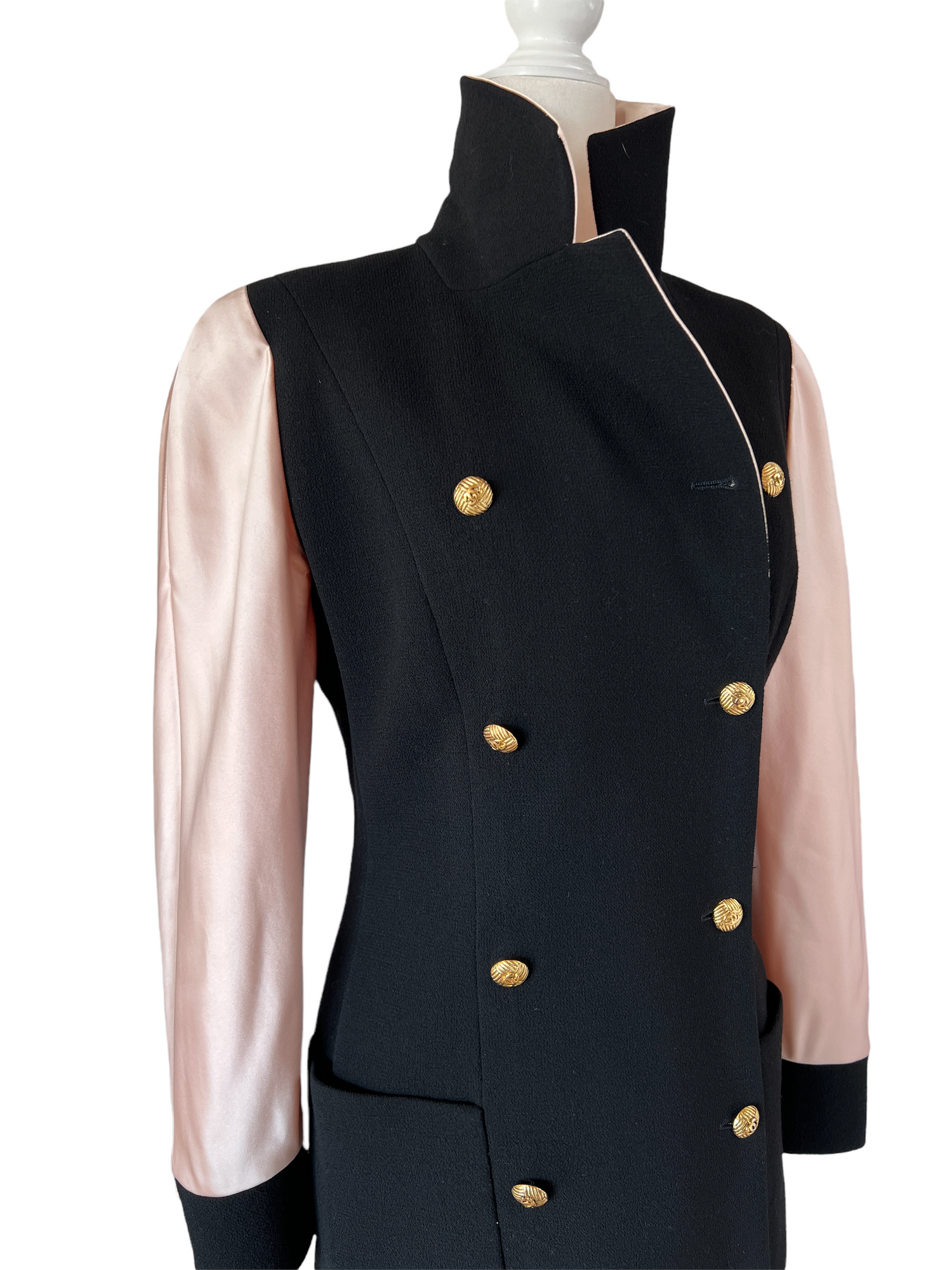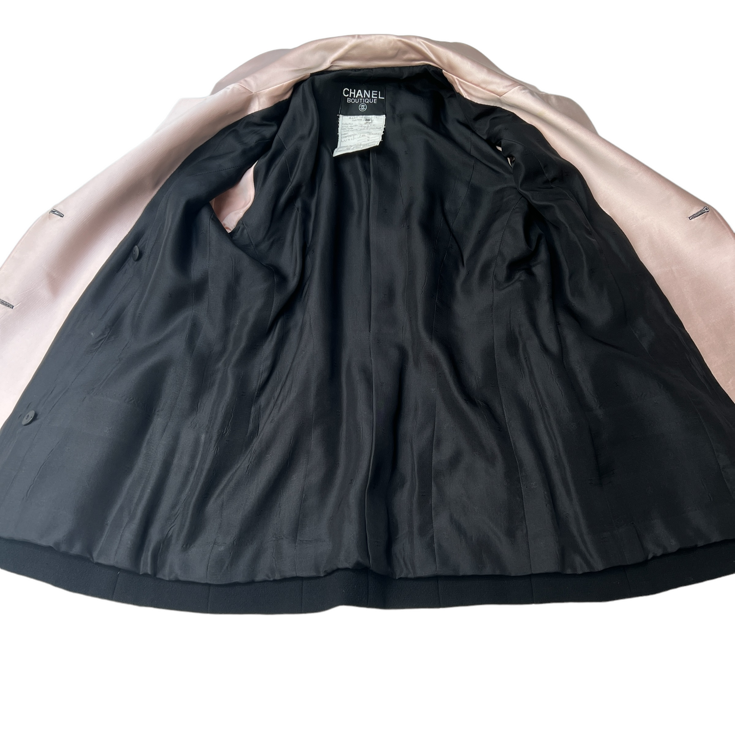 Vintage Chanel Blazer from 1990. Black wool and Light pink silk. Gold tone buttons. Incredible style worn open or closed. The collar can be left down and relaxed or worn up for an elevated, elegant style! Size 38.