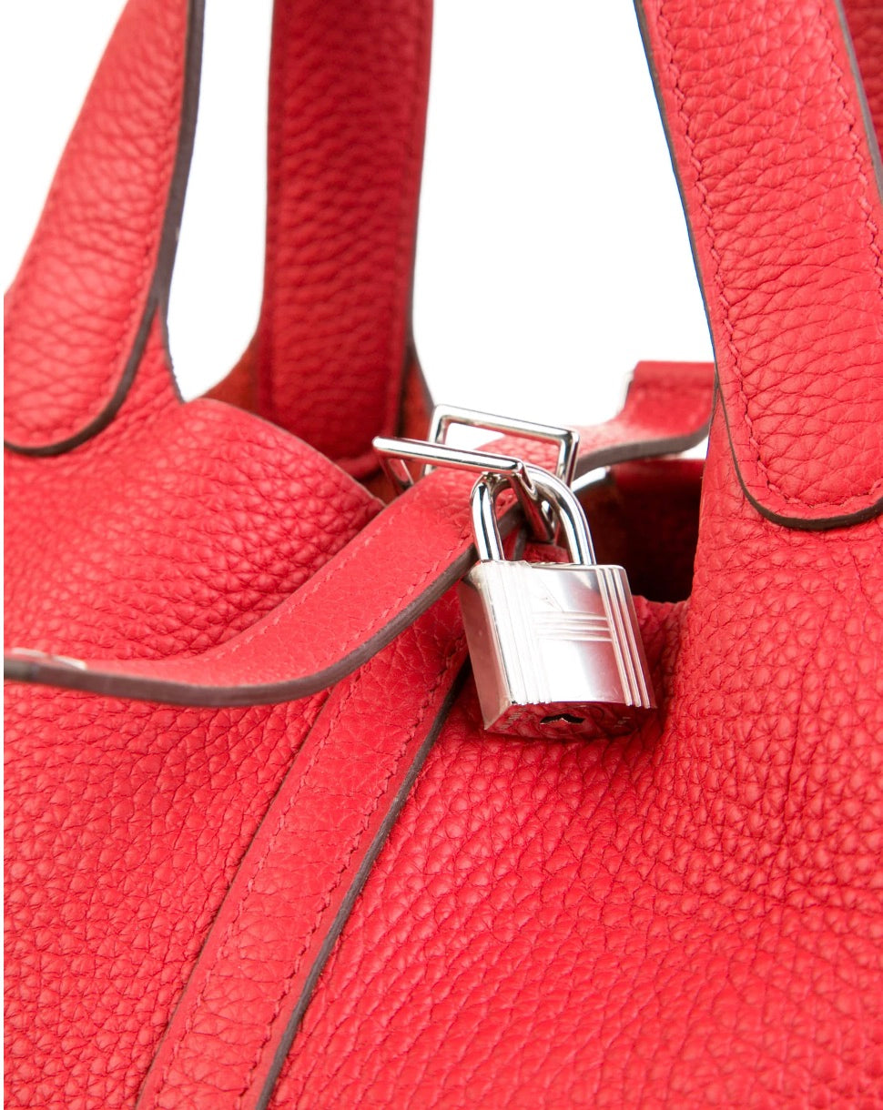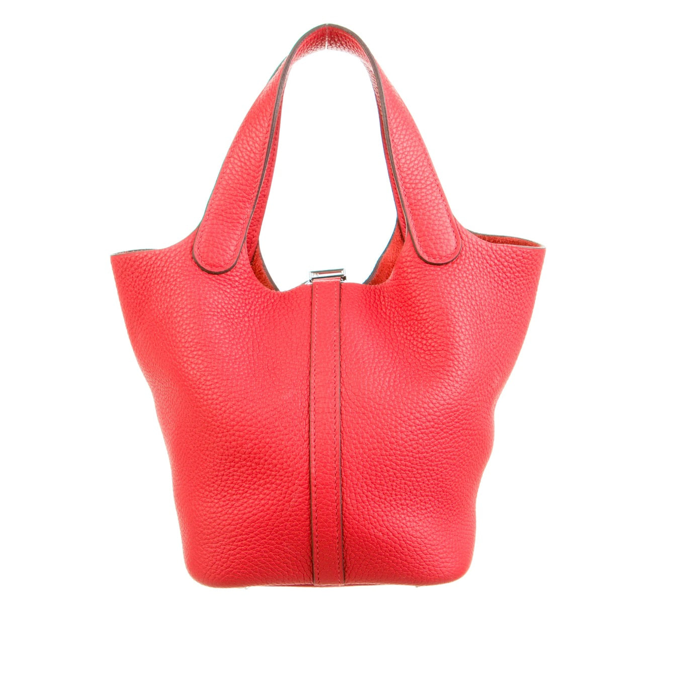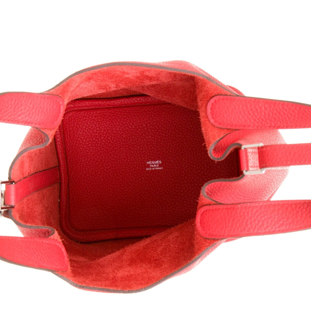 Hermes Picotin 18 bag from the 2020 collection. Rouge Tomate Clemence leather. Palladium-plated hardware. Flat handles. This bag is an iconic open top handle bag which is very desirable and collectible right now. Protective feet at base.