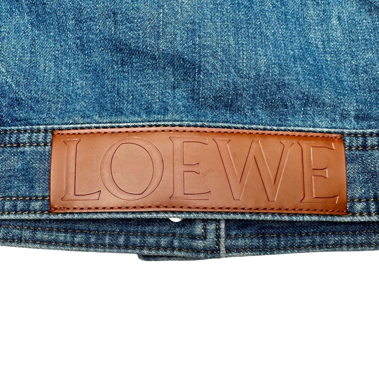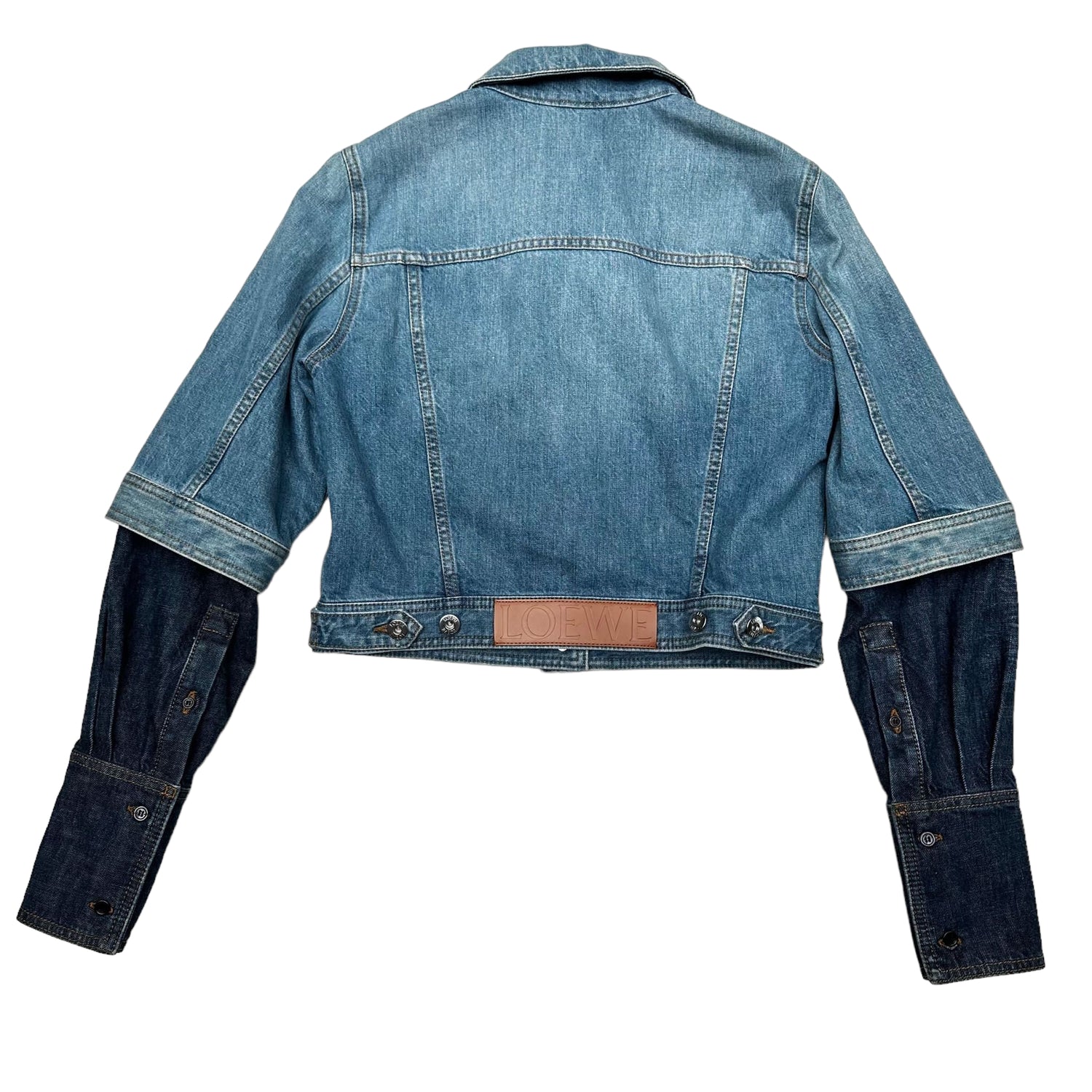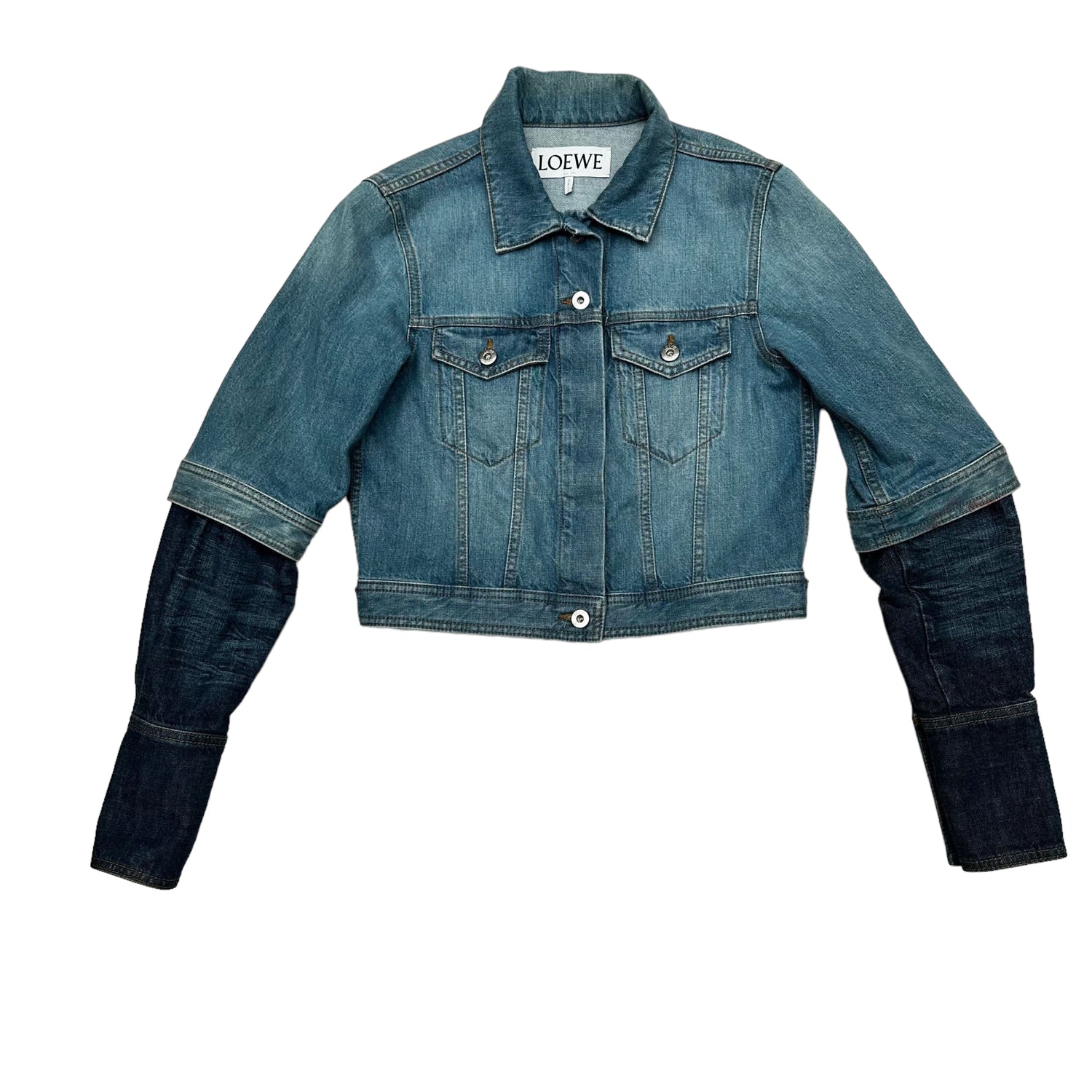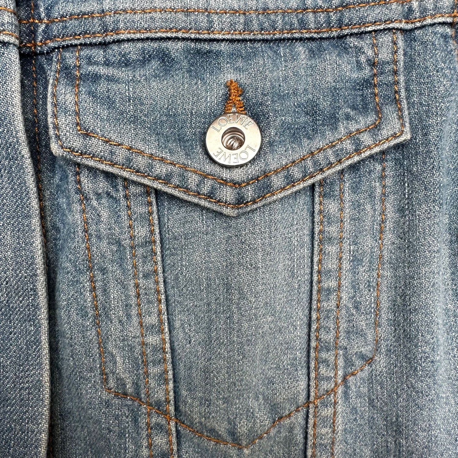 Loewe denim jacket. Cropped with extra long sleeves. Pointed collar. Silver-tone buttons. Brown logo leather patch at back. Two patch pockets with buttons at front. Designer size 36.