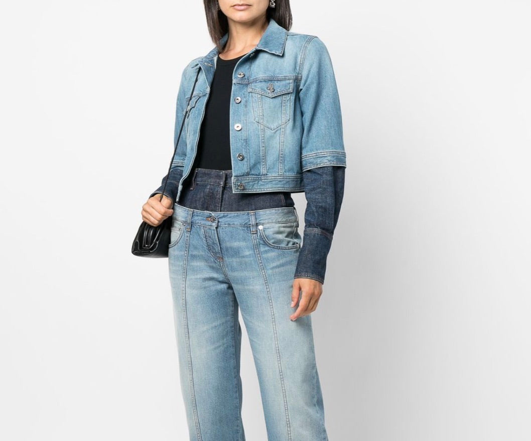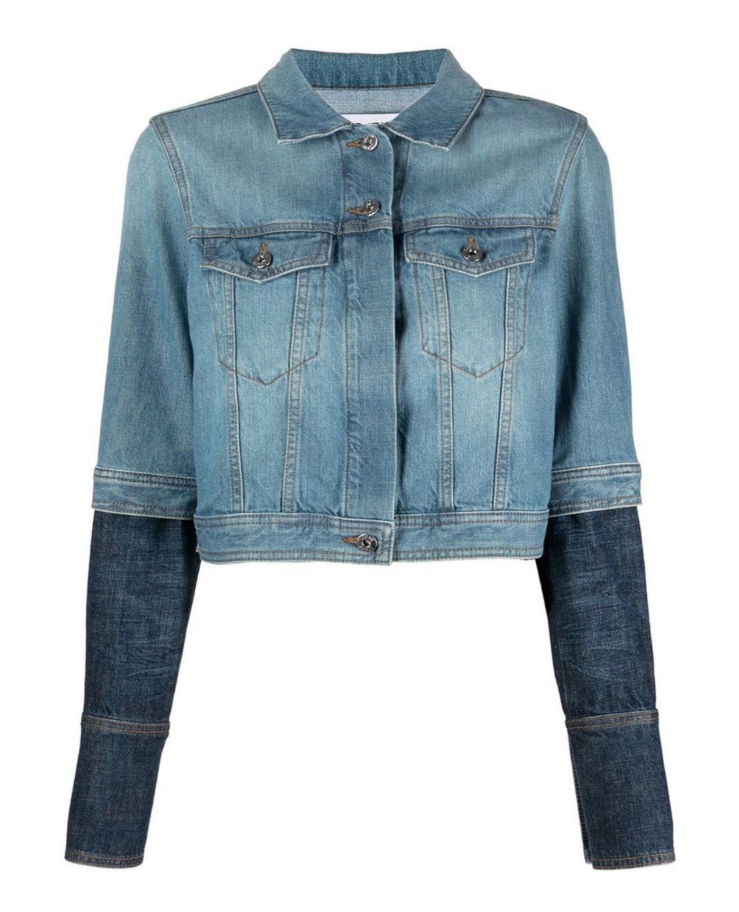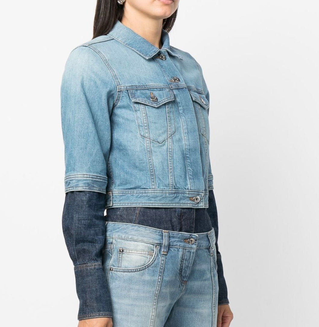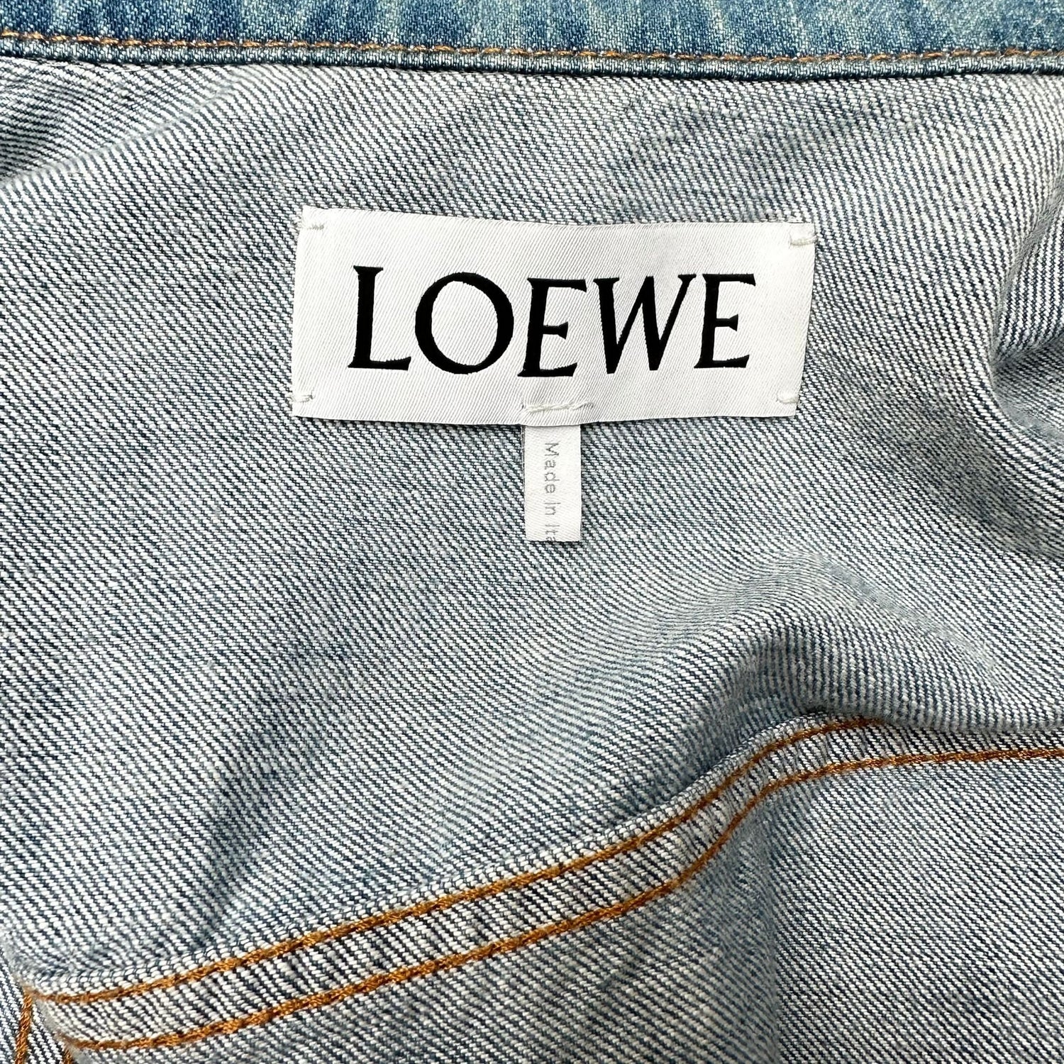 Loewe denim jacket. Cropped with extra long sleeves. Pointed collar. Silver-tone buttons. Brown logo leather patch at back. Two patch pockets with buttons at front. Designer size 36.
