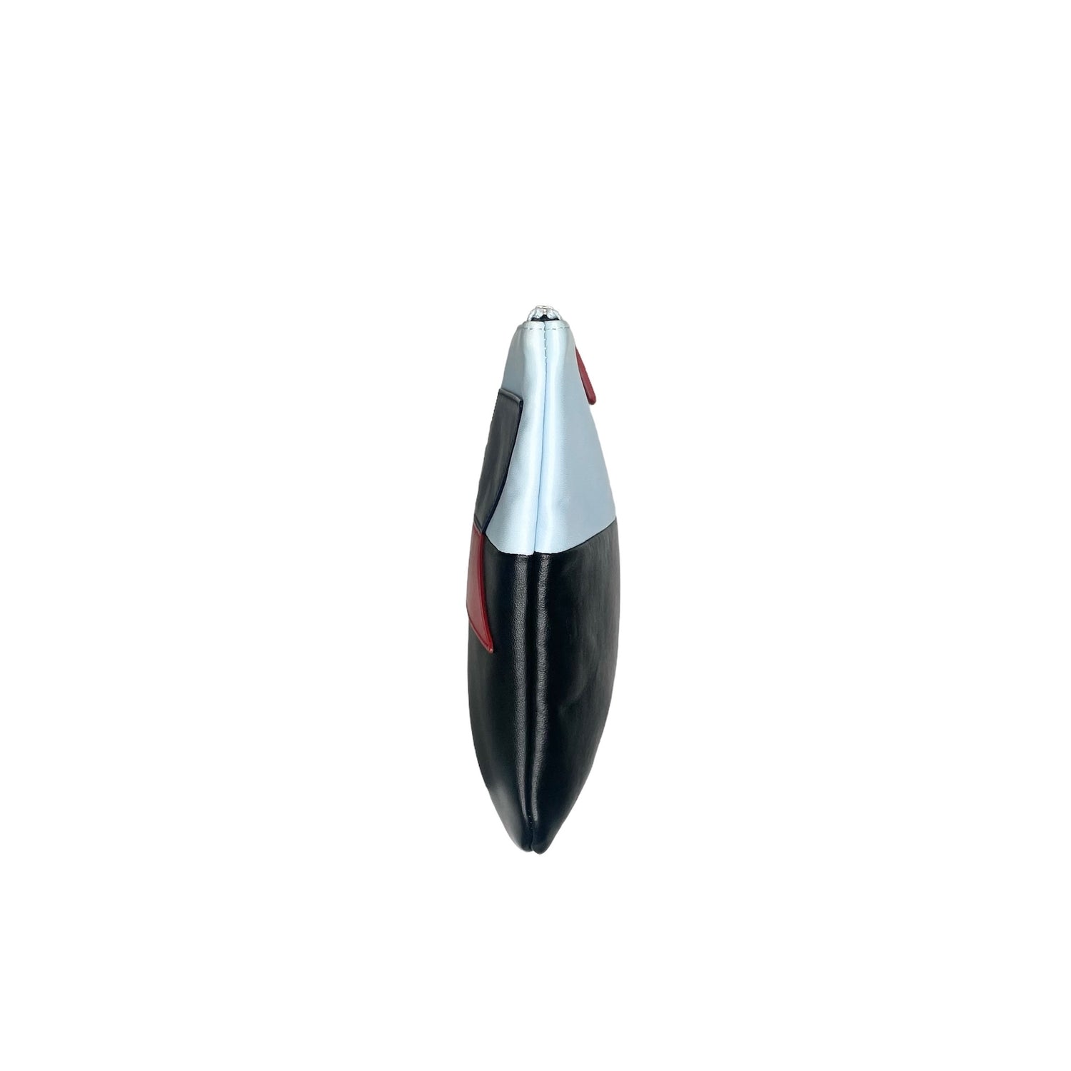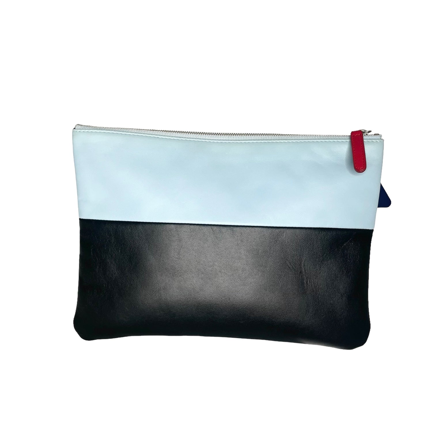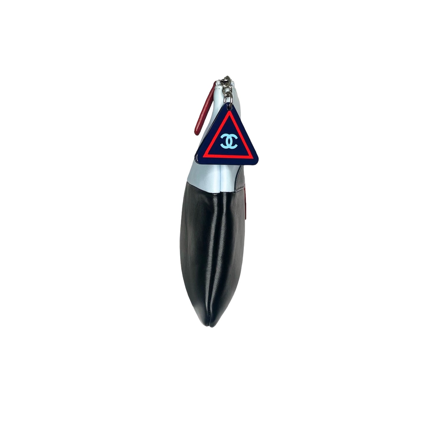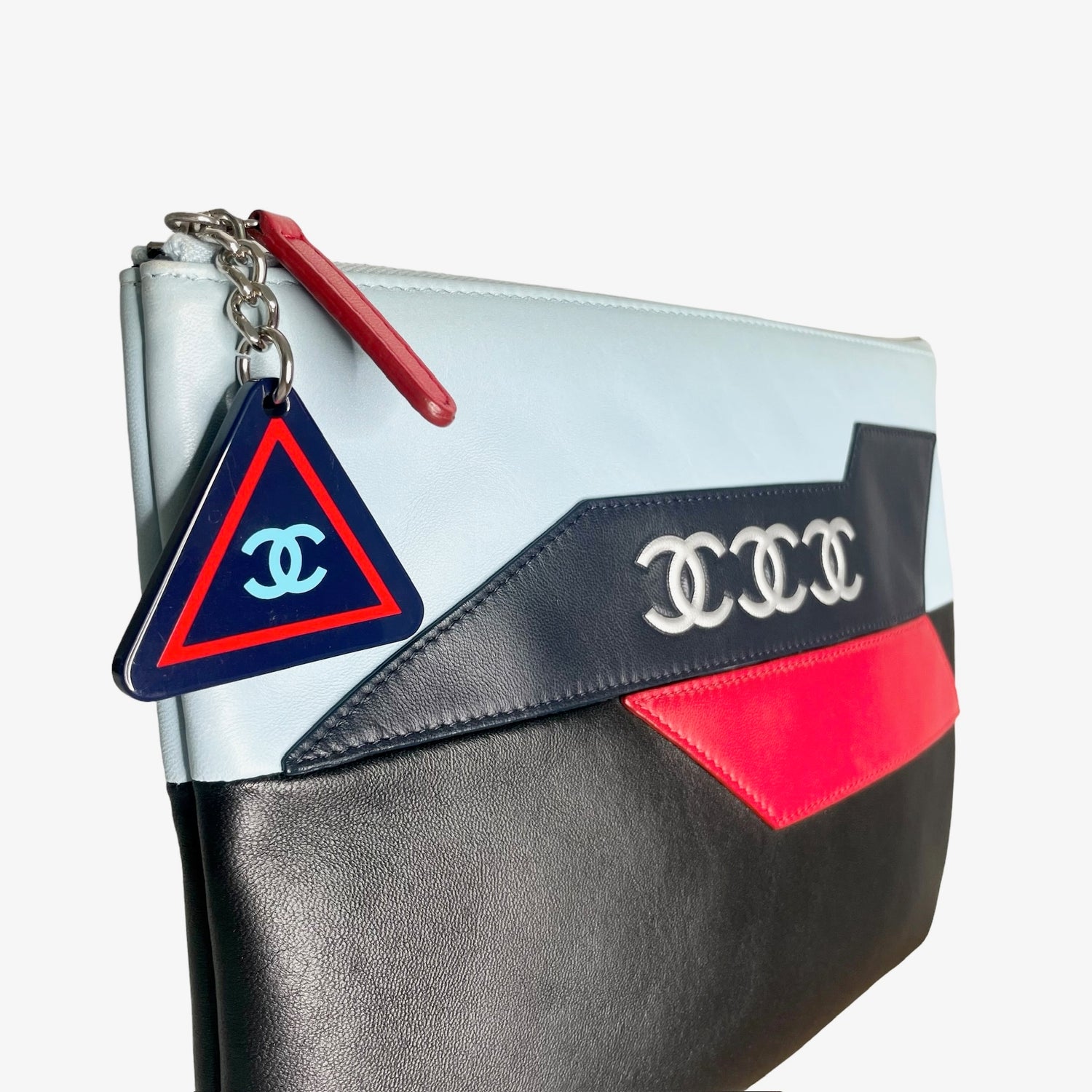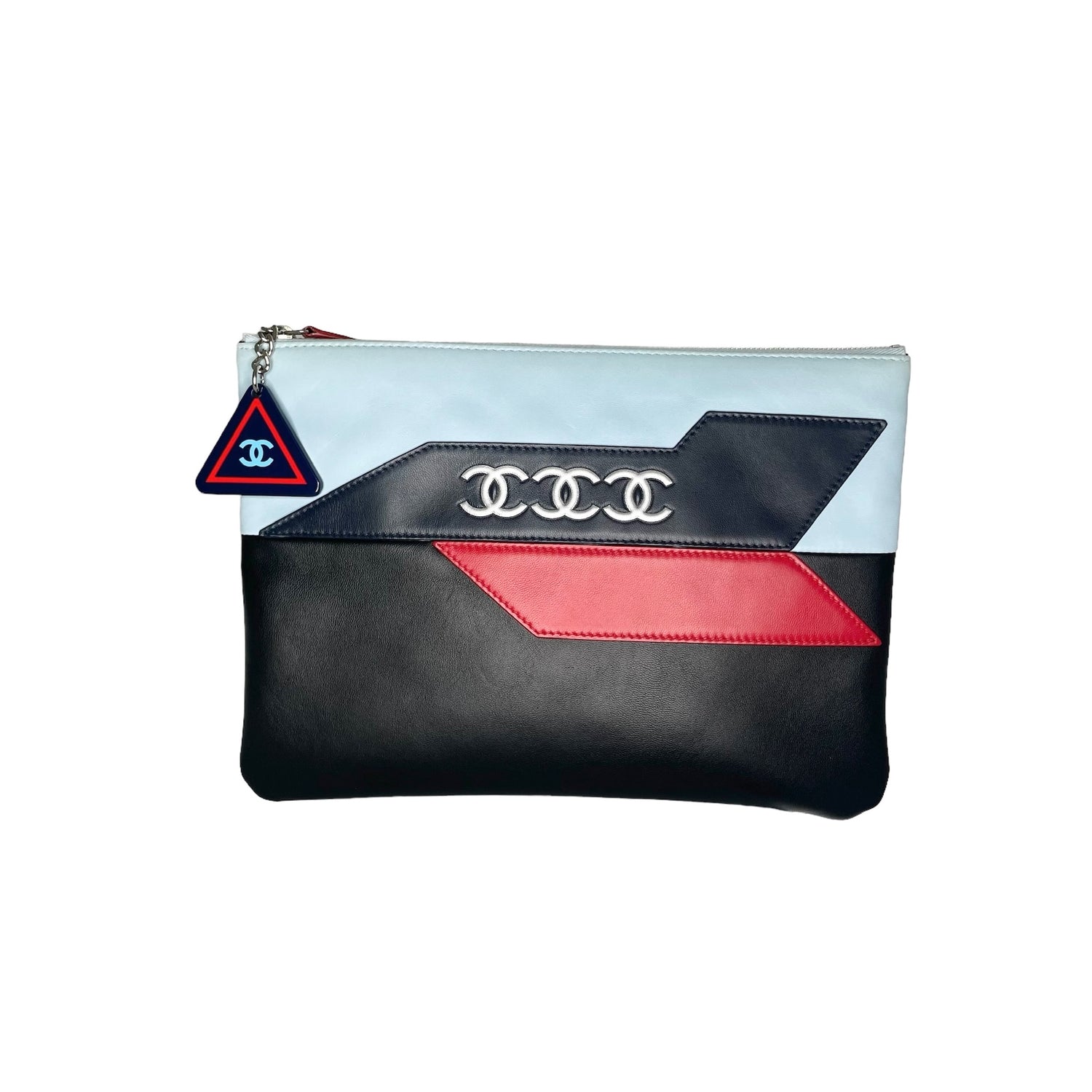 Chanel Airline O-Case clutch. Black, blue and red lambskin leather. CC logo at front. Acetate zipper tongue.