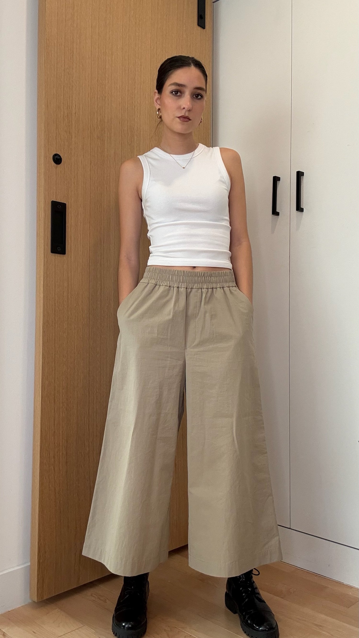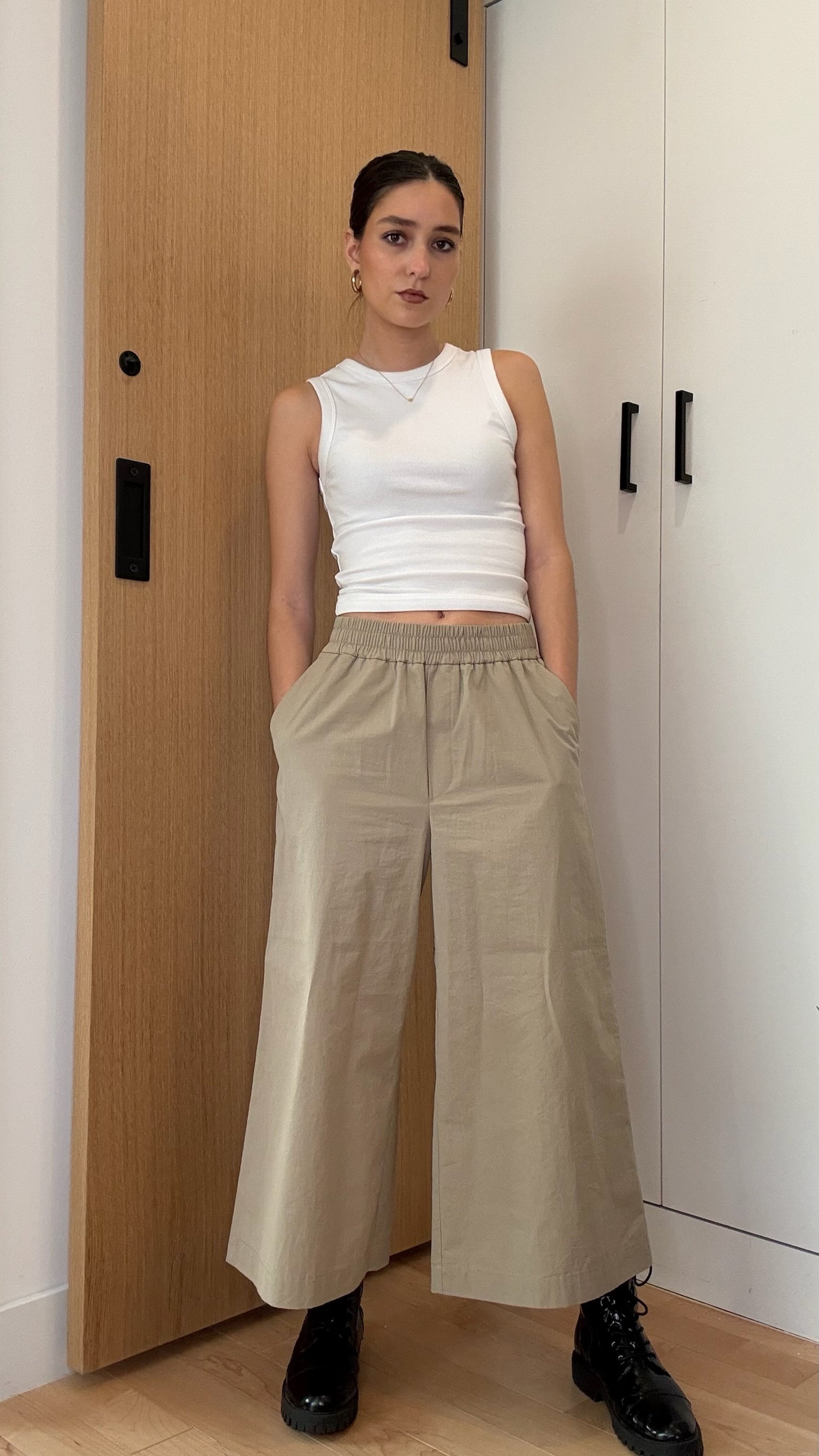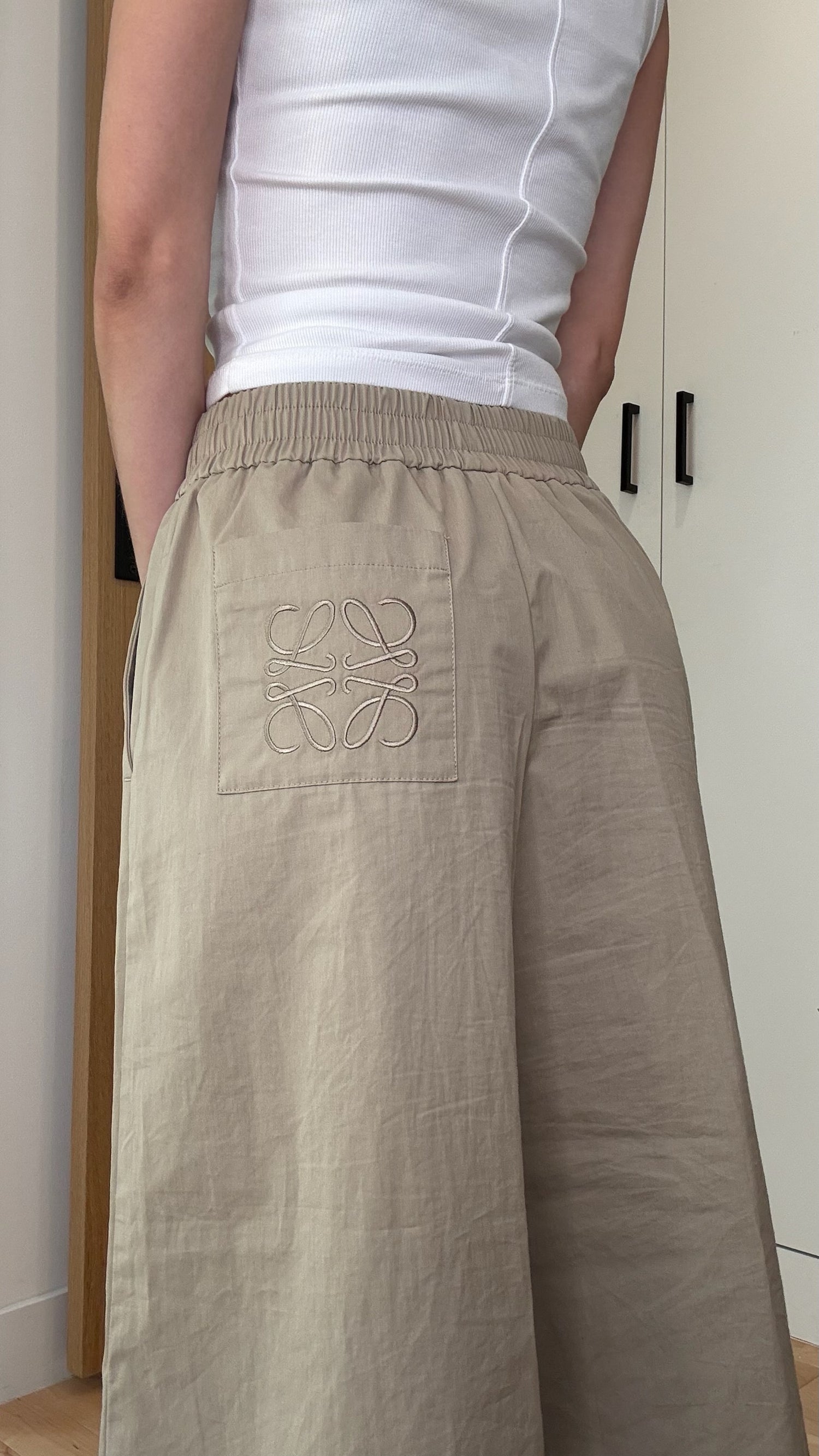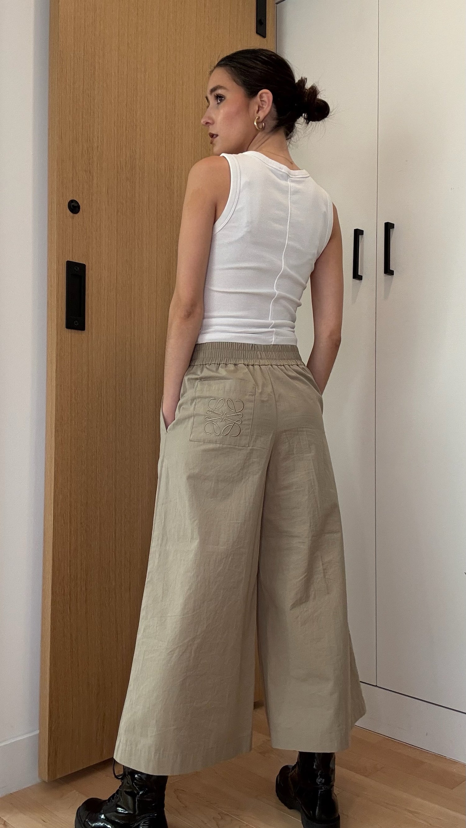 Loewe beige pants. Anagram logo at back pocket. Elasticized waistband. Pockets at front and back. Flared. Designer size small.