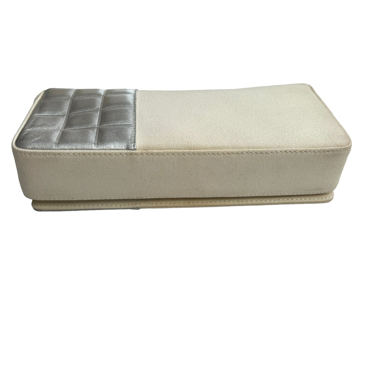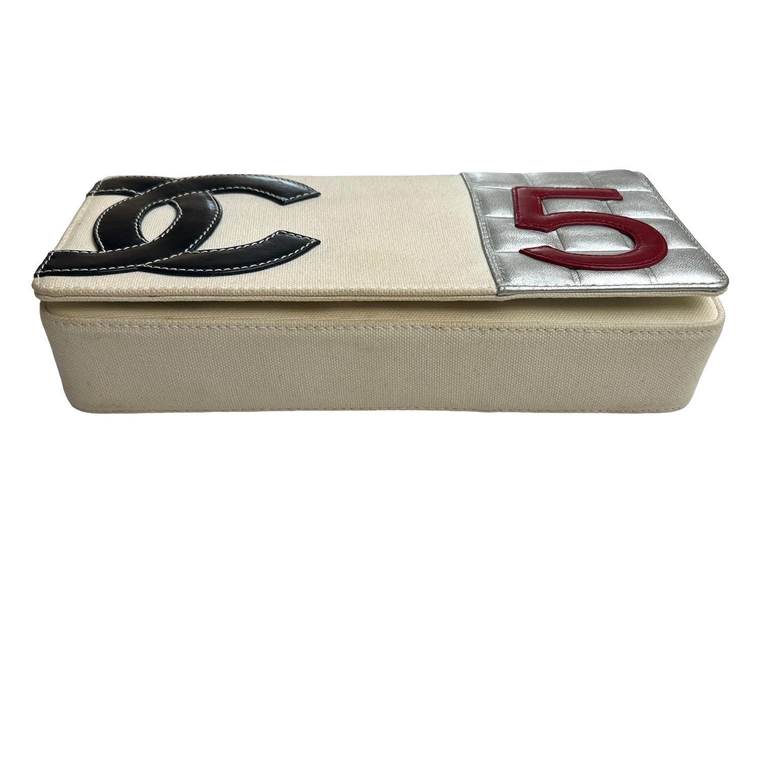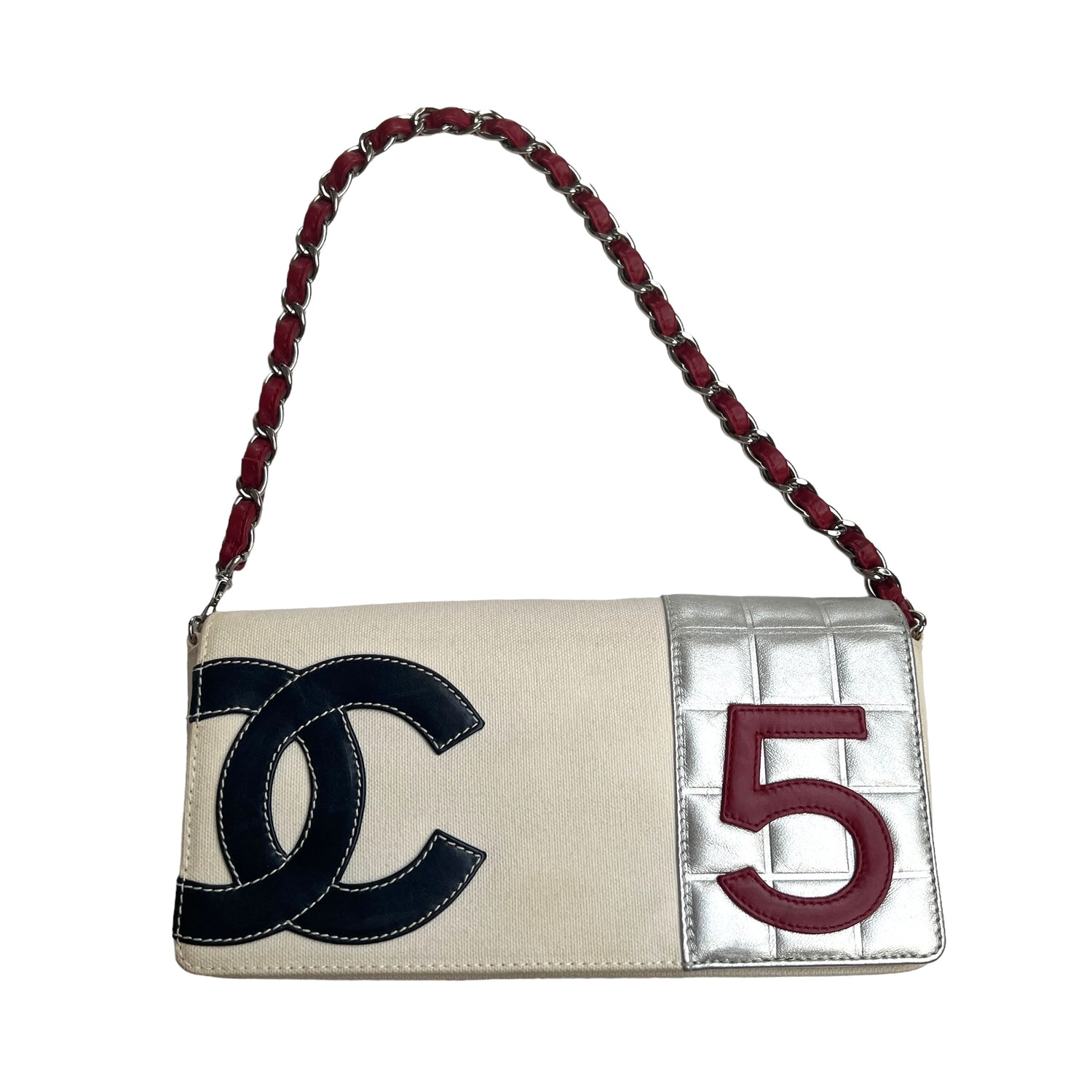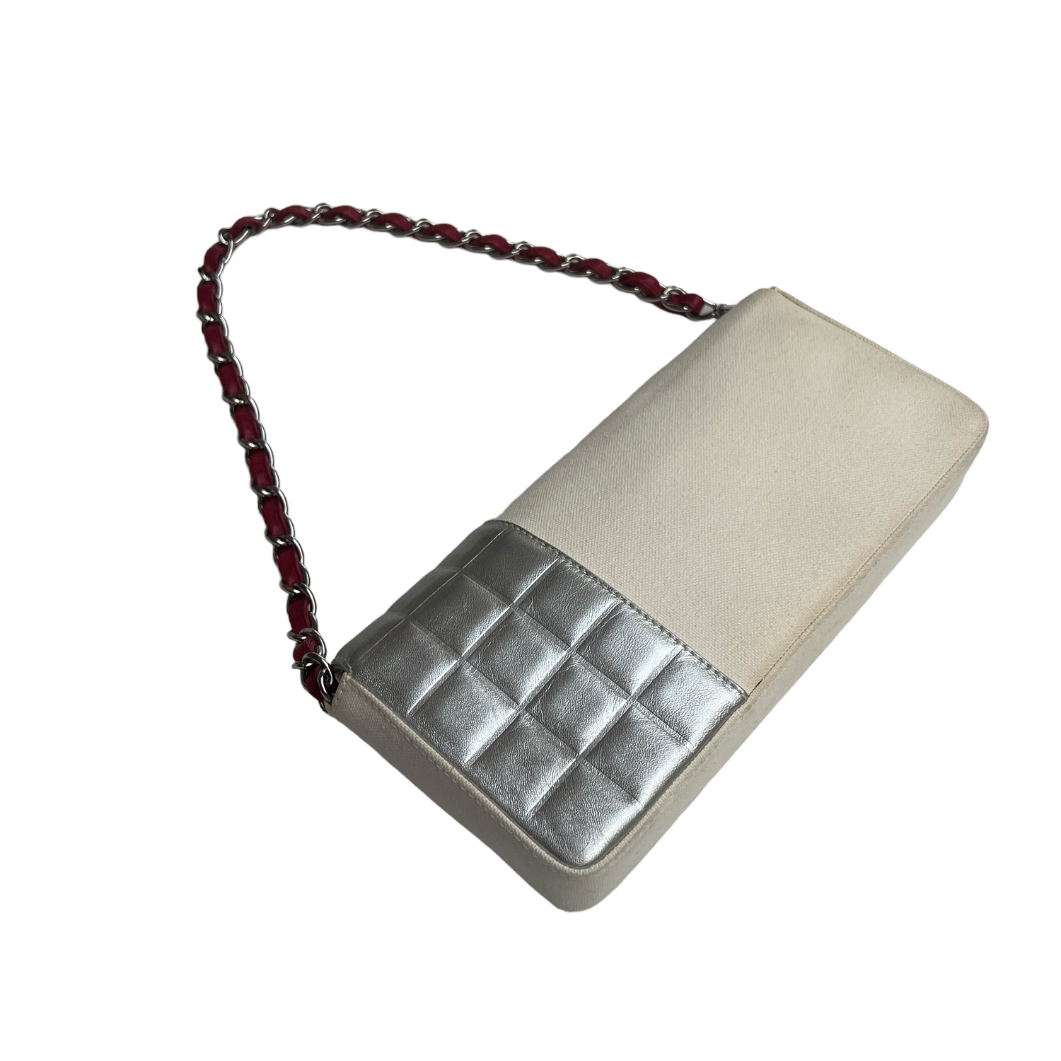 Chanel beige and silver shoulder bag. CC fabric logo on top of beige fabric. Silver matelasse patch with 5 leather detail on top. Magnetic flap closure. Red leather strap. Silver-tone hardware. The chain is detachable for more of a clutch look or to wear around the wrist. This bag is versatile and can be worn in different style and match a lot of outfit with different colors and structure. Stunning silver patent lining which makes you want to dive in! Zipper pocket inside.