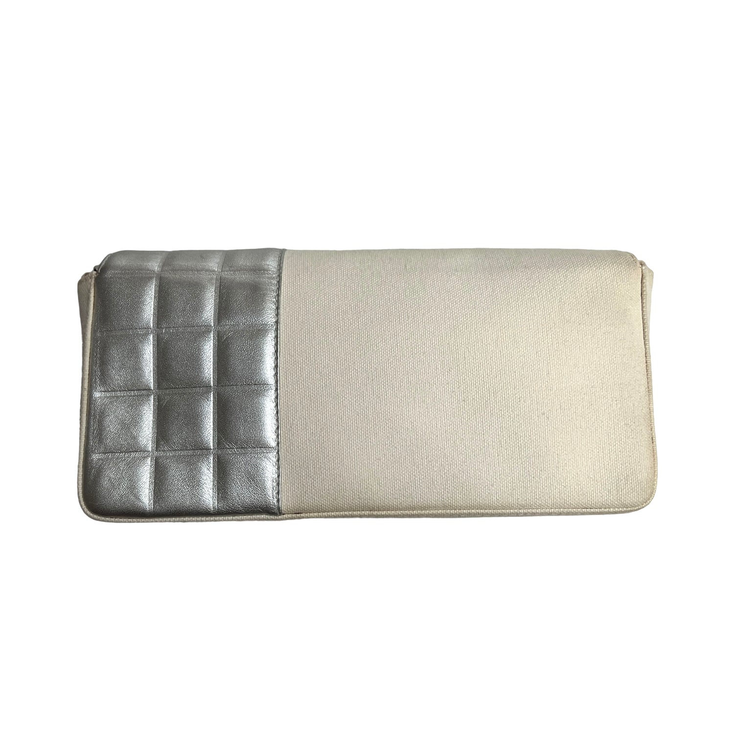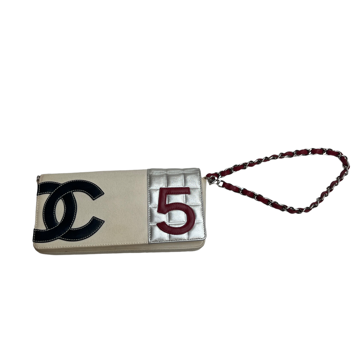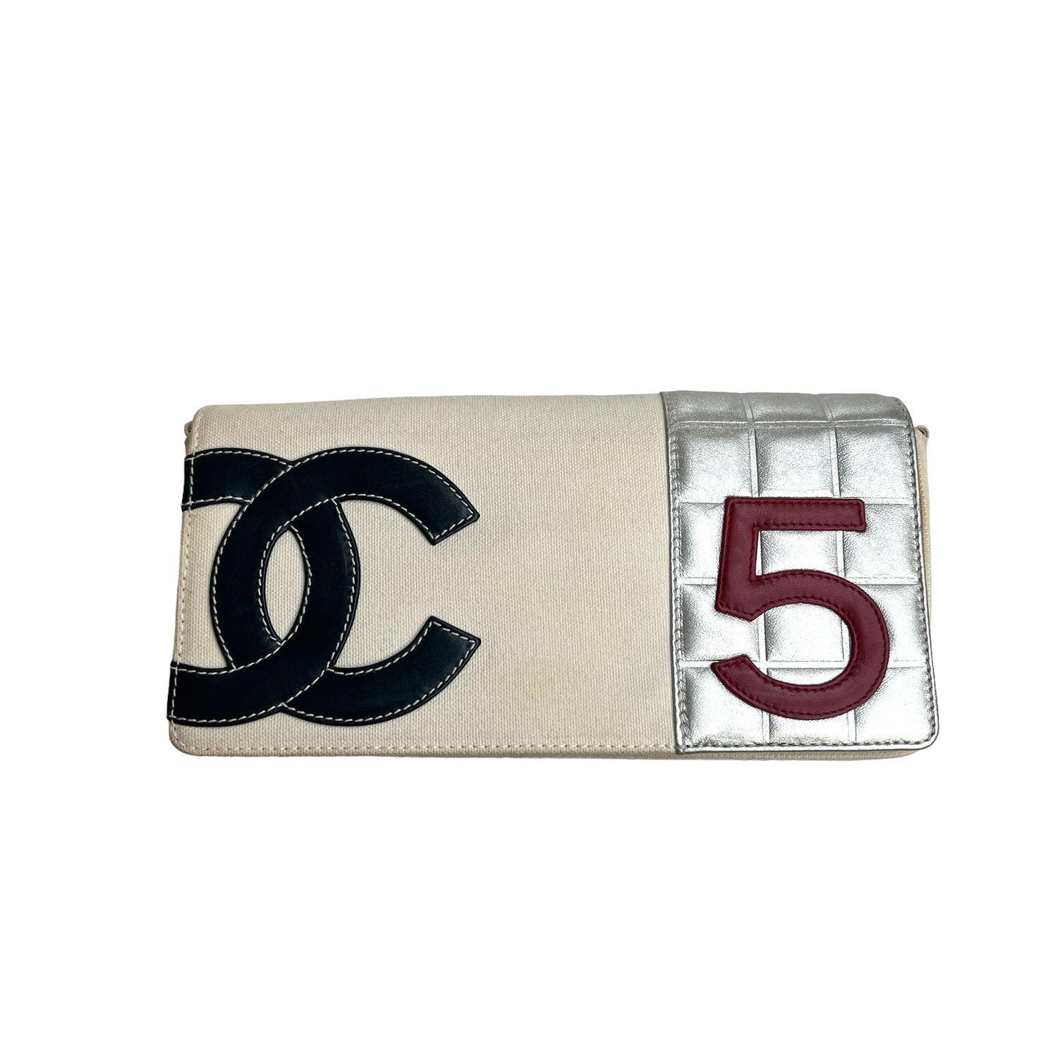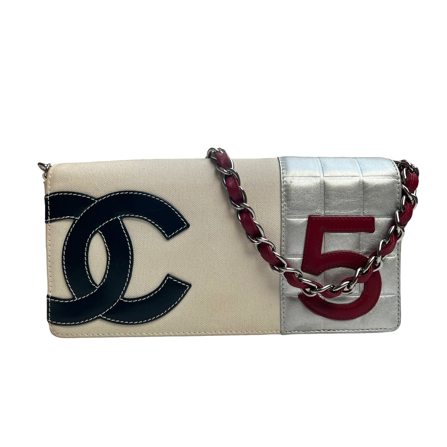 Chanel beige and silver shoulder bag. CC fabric logo on top of beige fabric. Silver matelasse patch with 5 leather detail on top. Magnetic flap closure. Red leather strap. Silver-tone hardware. The chain is detachable for more of a clutch look or to wear around the wrist. This bag is versatile and can be worn in different style and match a lot of outfit with different colors and structure. Stunning silver patent lining which makes you want to dive in! Zipper pocket inside.