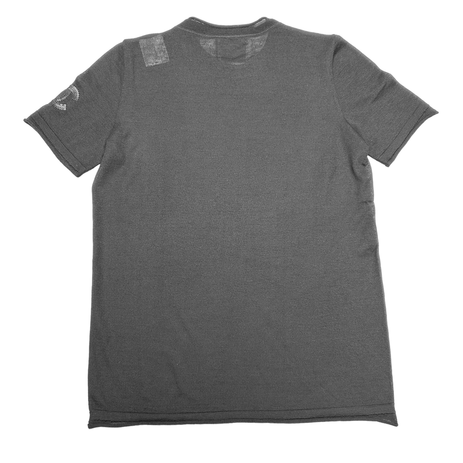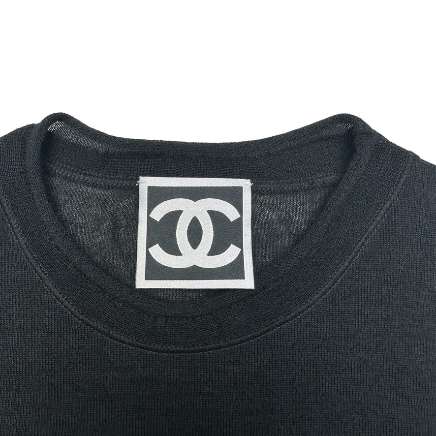 Chanel black cashmere top. Short sleeves. CC logo with sequins at left sleeve. Round neck. Extra soft. Designer size 38