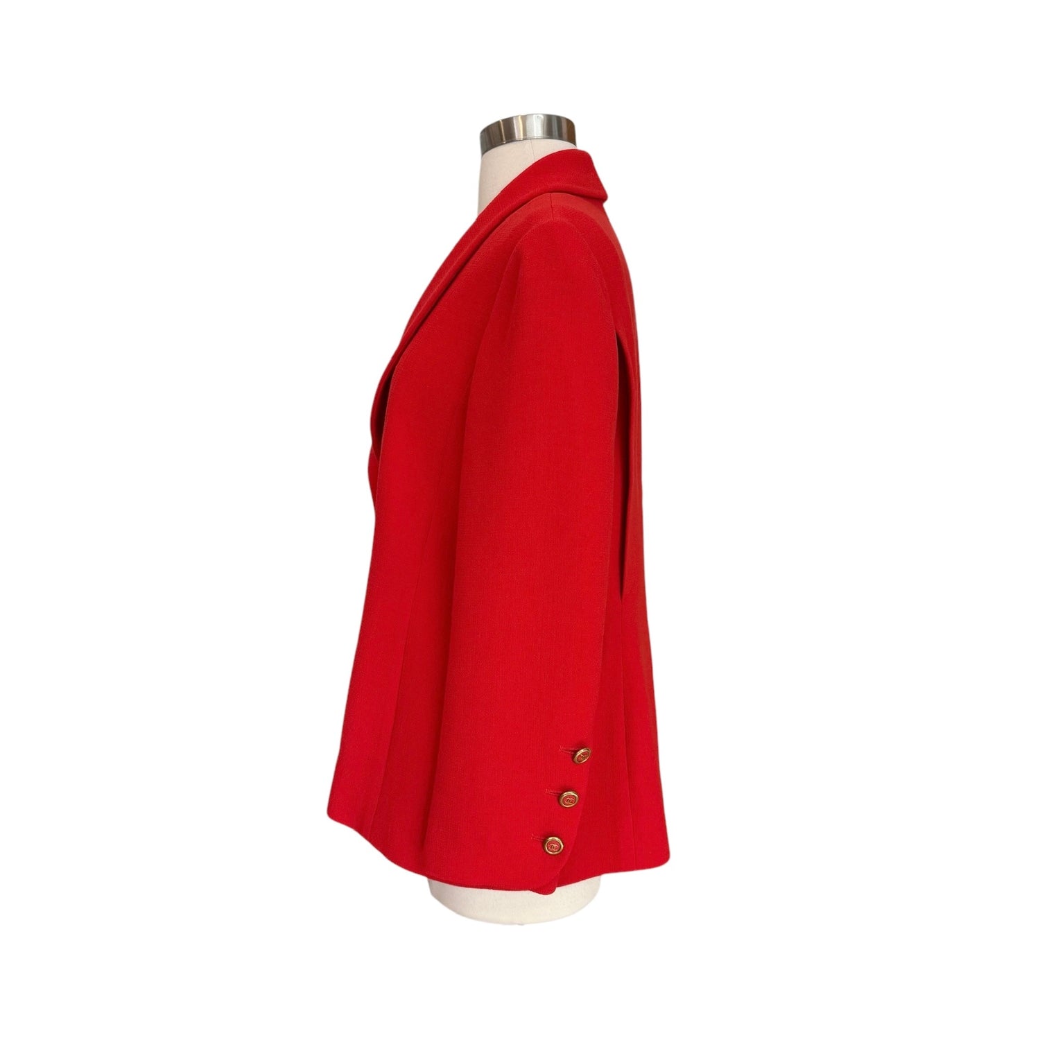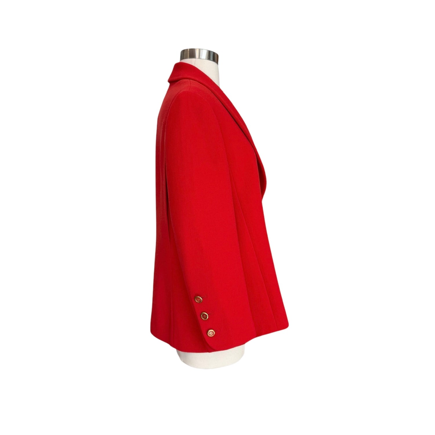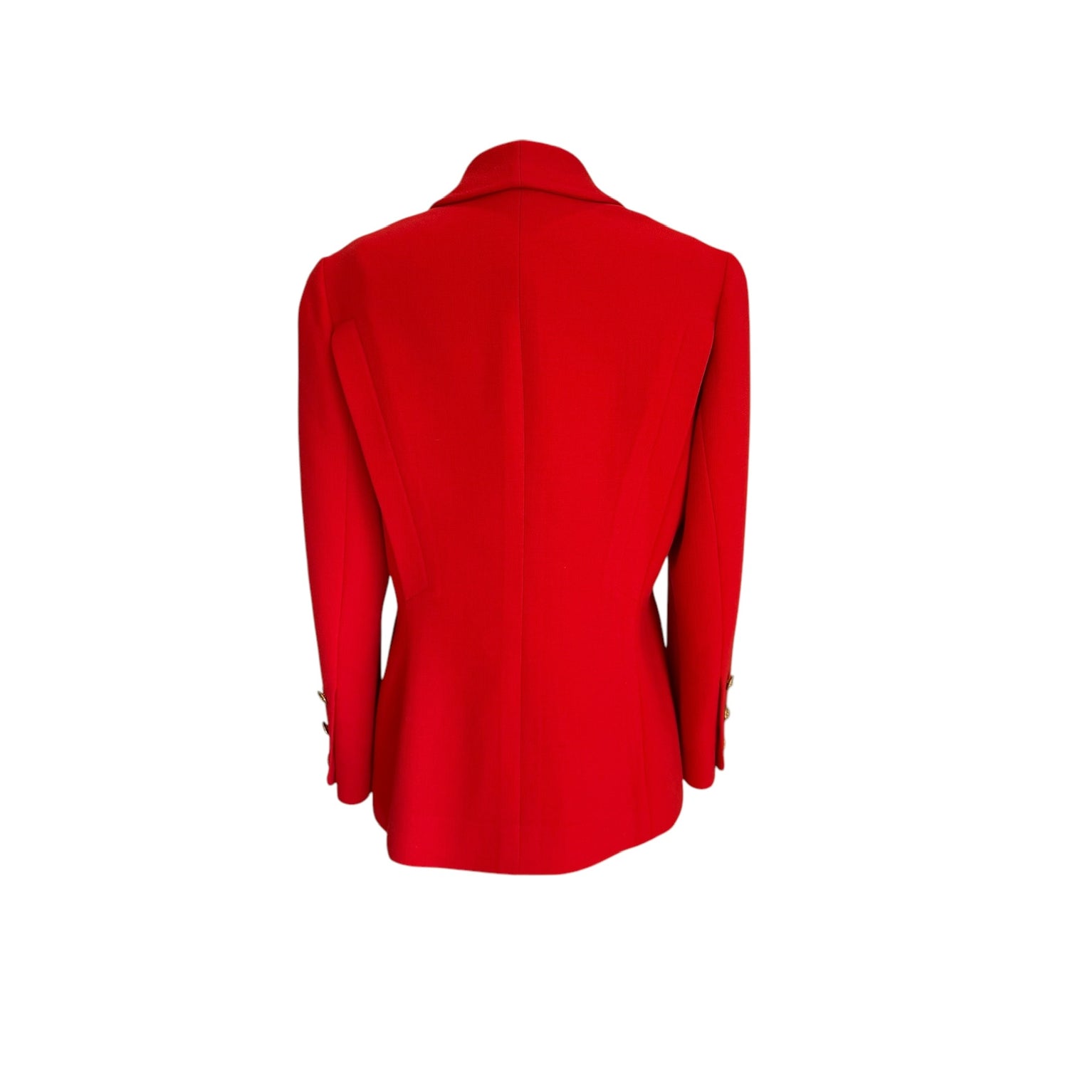 Chanel red vintage blazer. Fall 1994 collection. CC logo buttons with hammered gold trims at front and sleeves. Round collar. Button closure at front. Designer size 40.