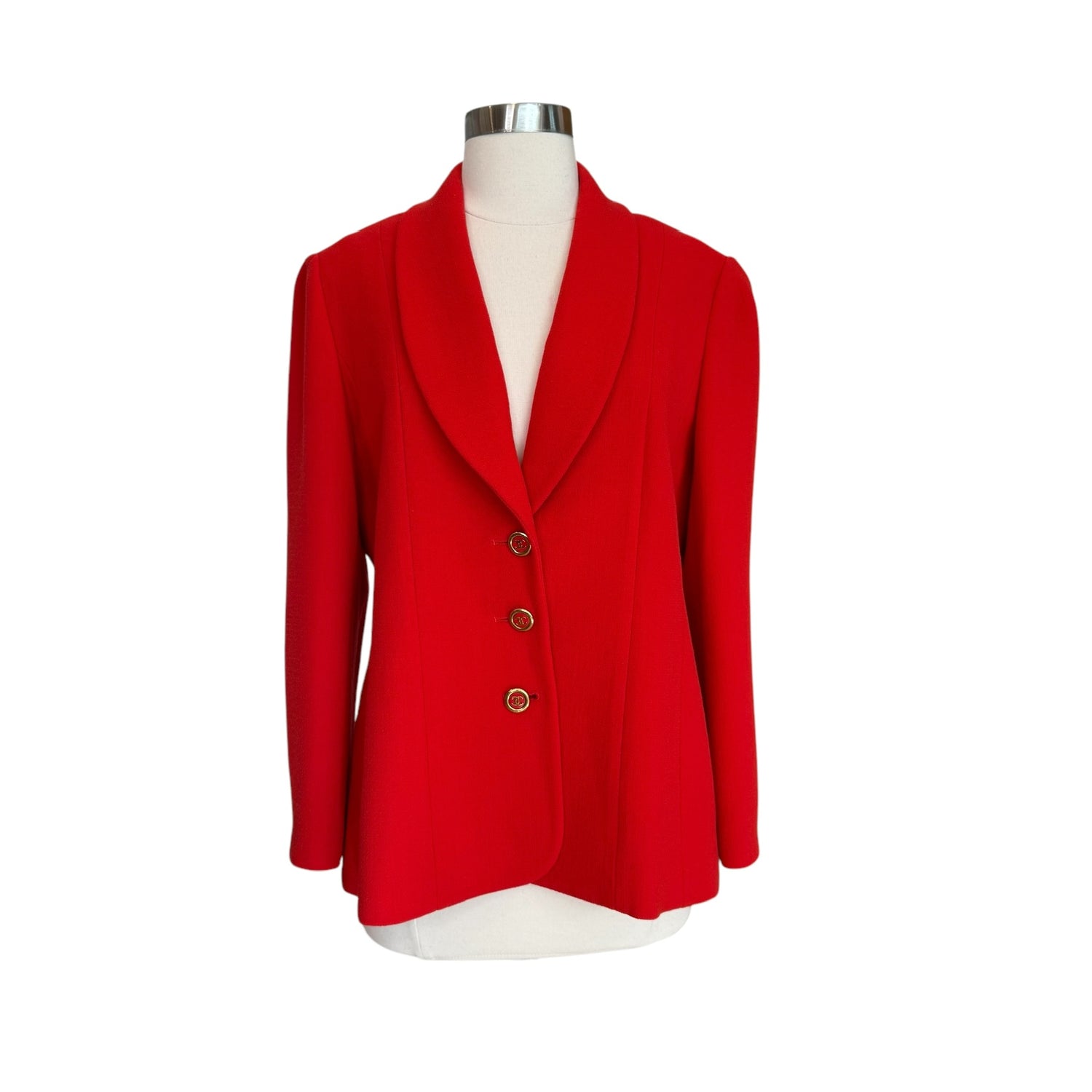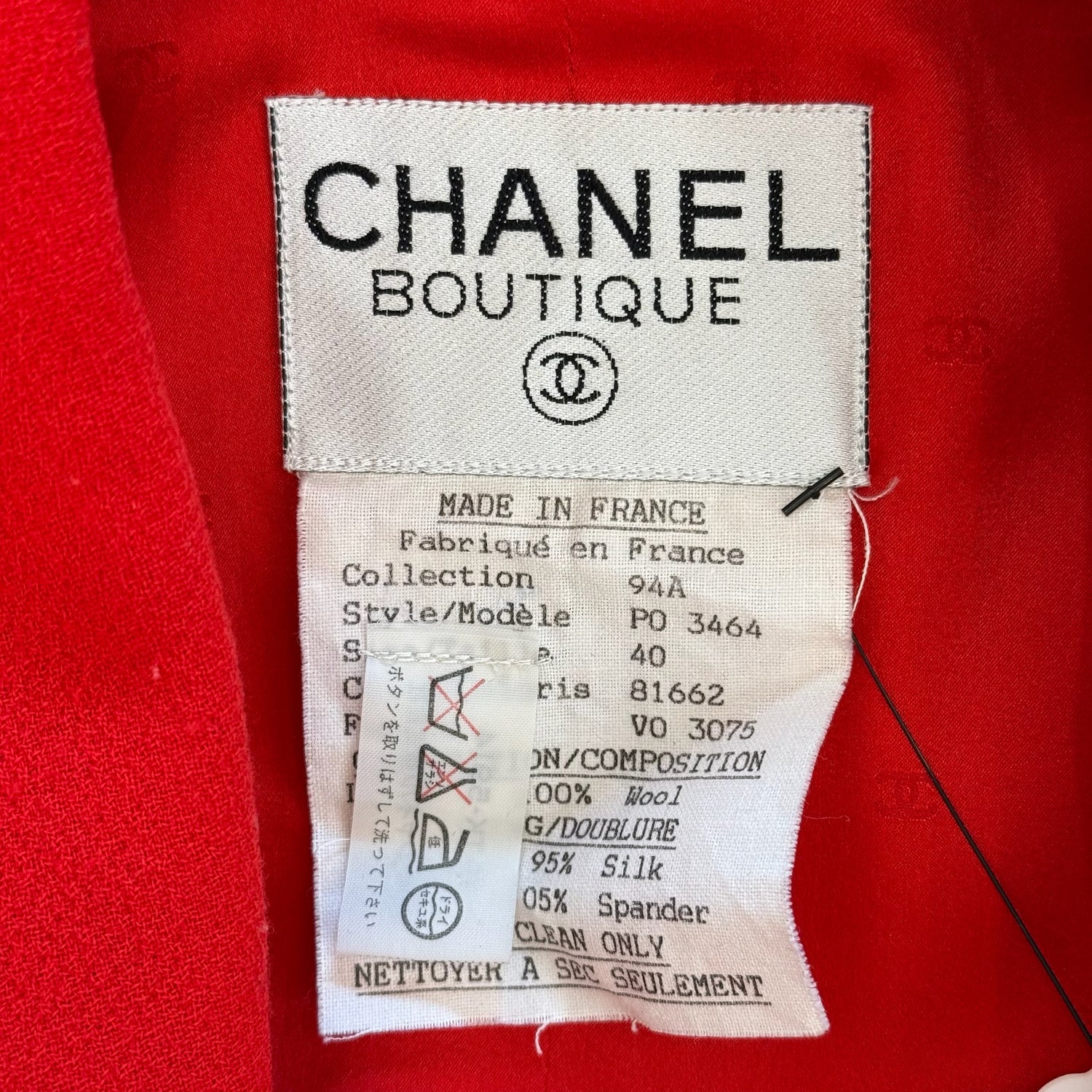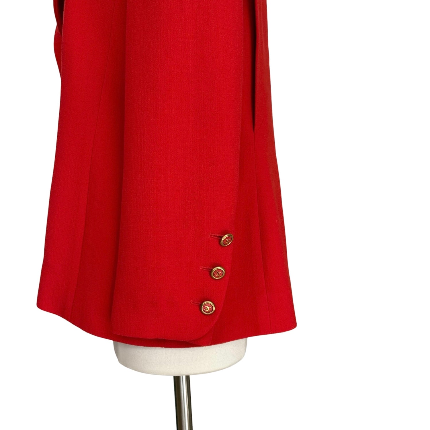 Chanel red vintage blazer. Fall 1994 collection. CC logo buttons with hammered gold trims at front and sleeves. Round collar. Button closure at front. Designer size 40.