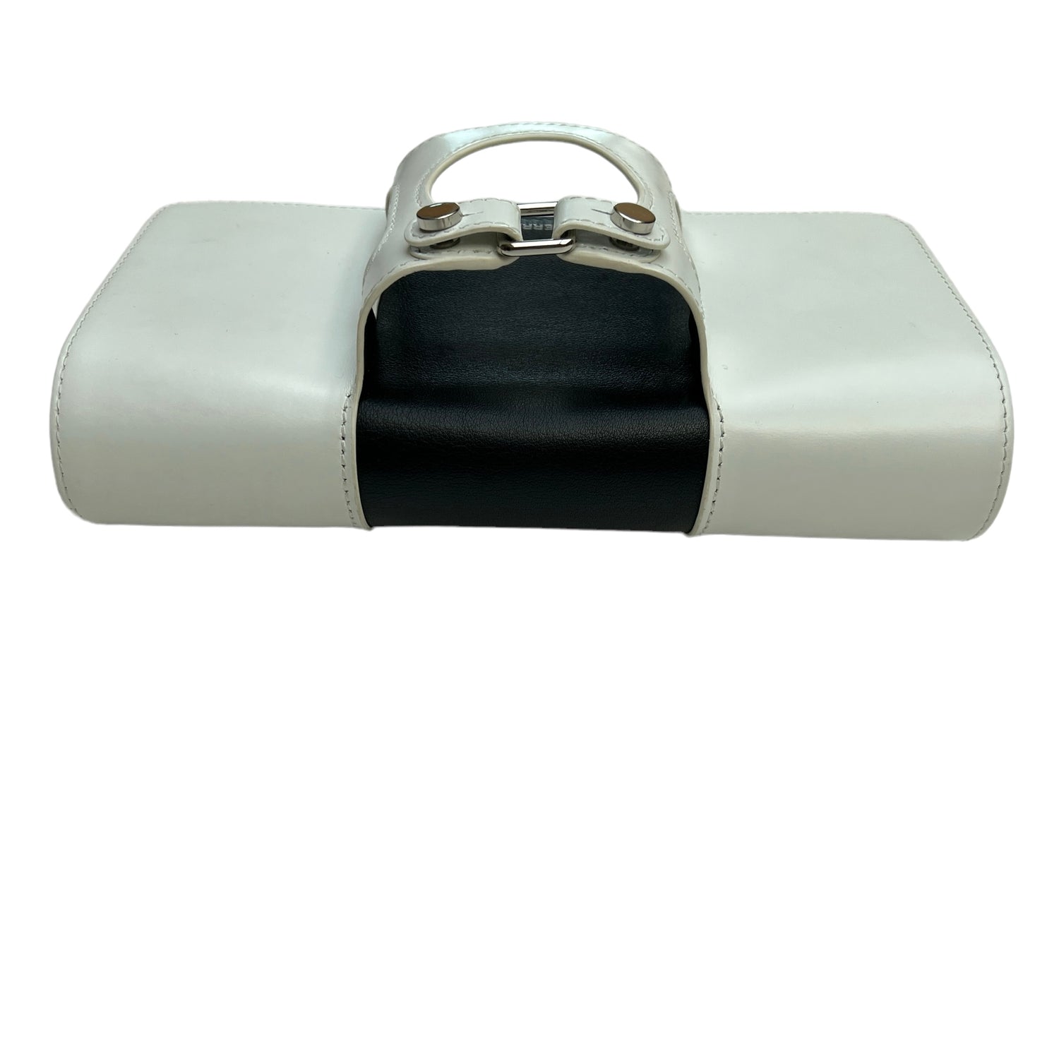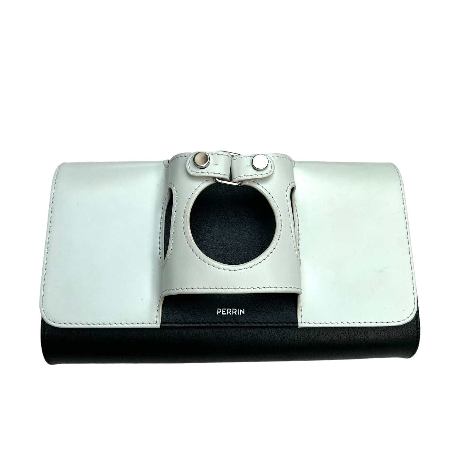 Perrin black and white leather clutch. Integrated glove as part of their iconic design. Brand logo at front. Magnetic snap closure. One slit pocket at interior. Silver-tone hardware.
