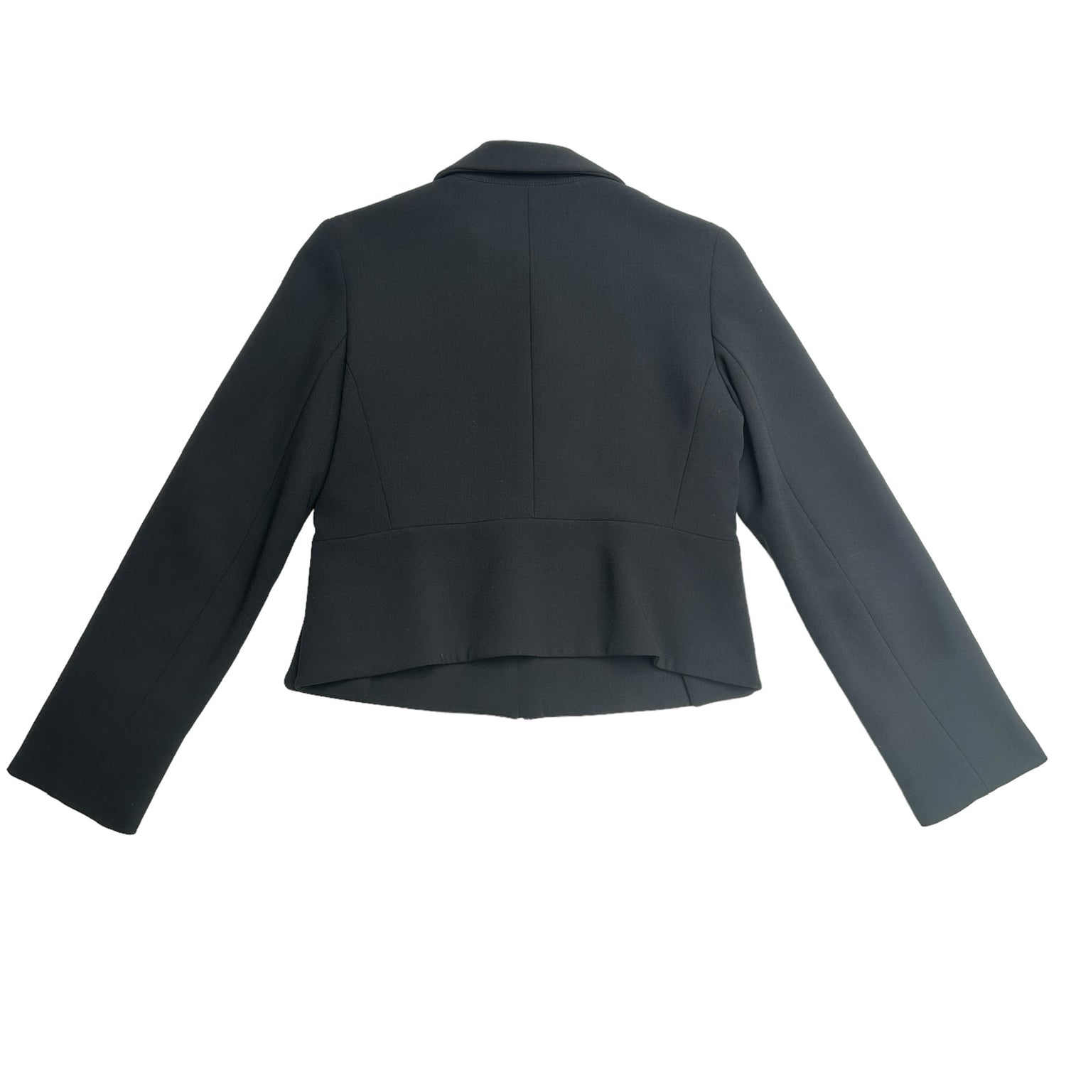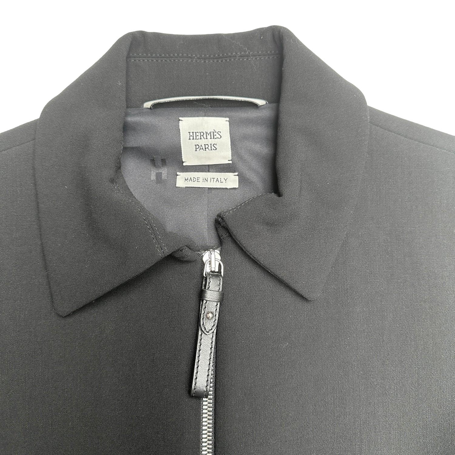 Hermes black wool jacket. Silver-tone silver zipper at front. Leather detail at zipper. Soft silk H logo lining. Designer size 38.