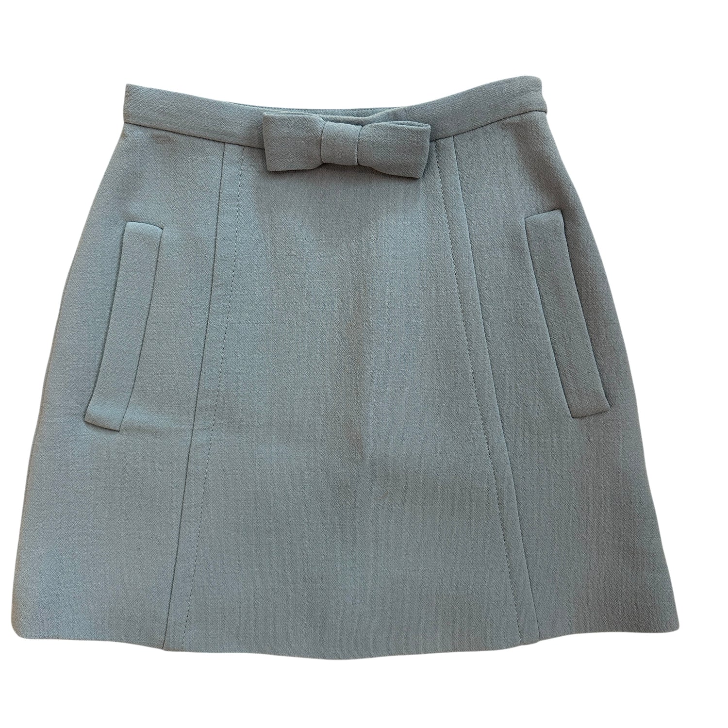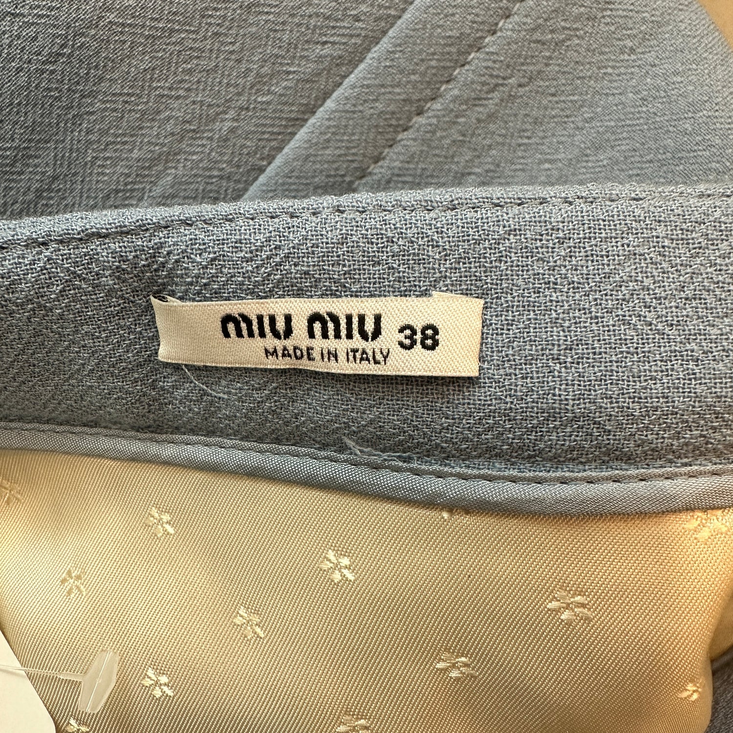 Miu Miu baby blue mini skirt. Bow at front. Zipper closure. Designer size 38 .
