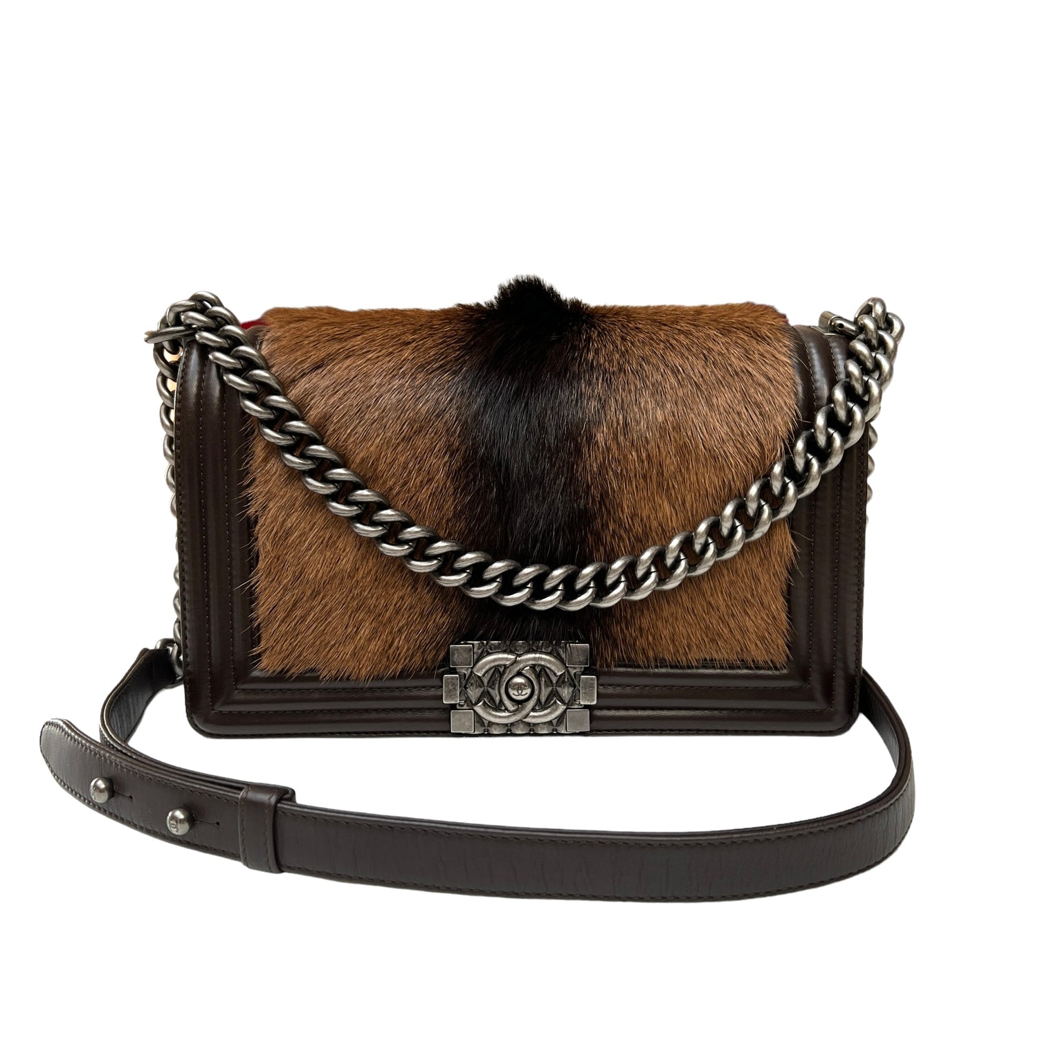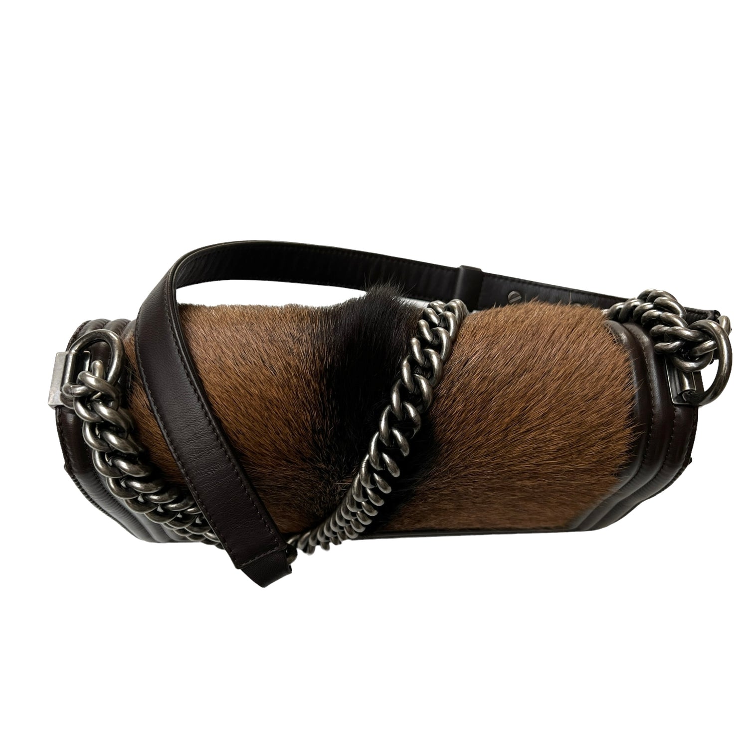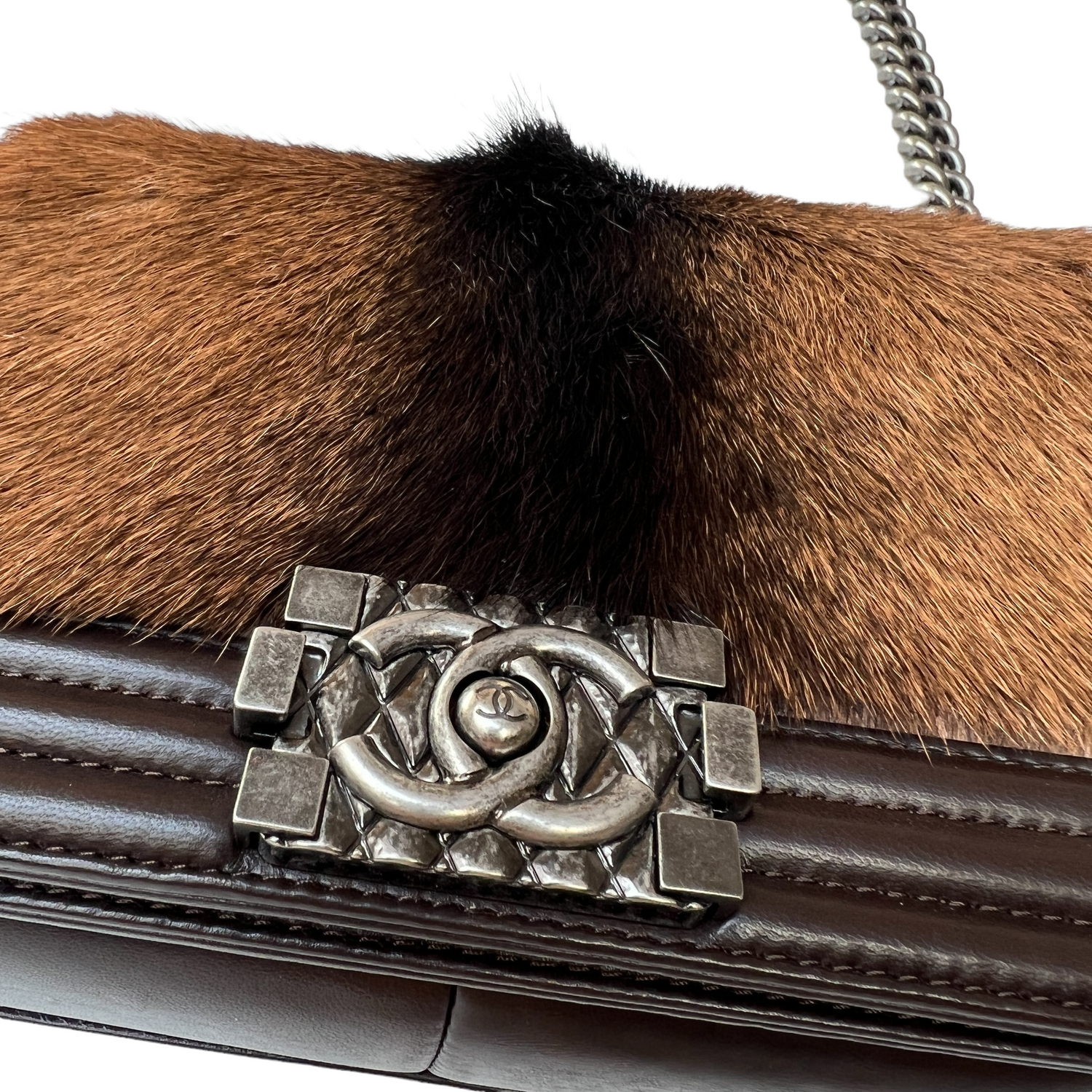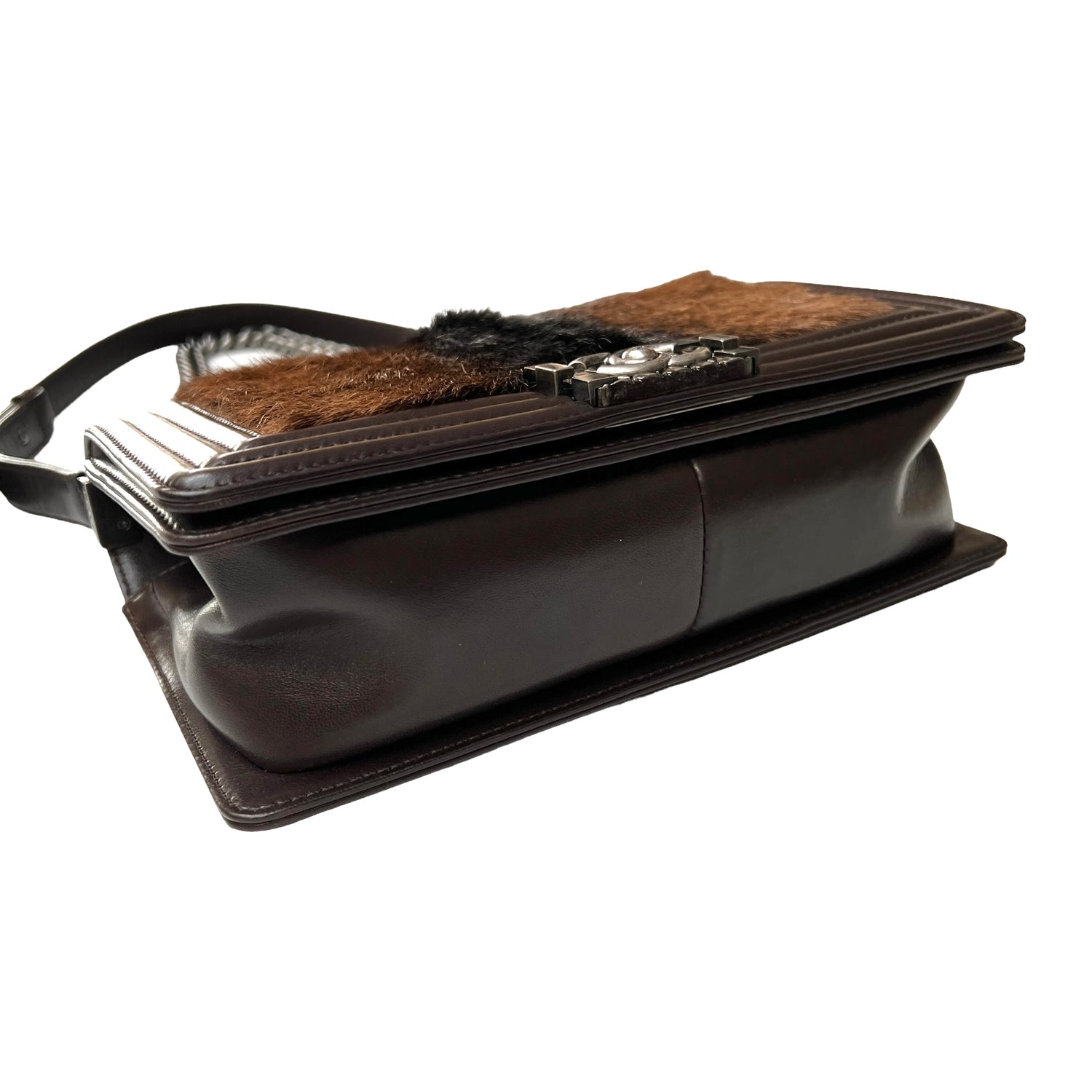Chanel Boy bag from the Fall 2013 collection by Karl Lagerfeld. Brown Leather. Interlocking CC logo at snap closure. Chain-link and leather strap. Antiqued silver-tone hardware. Can be worn as a crossbody or shoulder bag. Fur body. Burgundy red leather lining & single interior slit pocket.