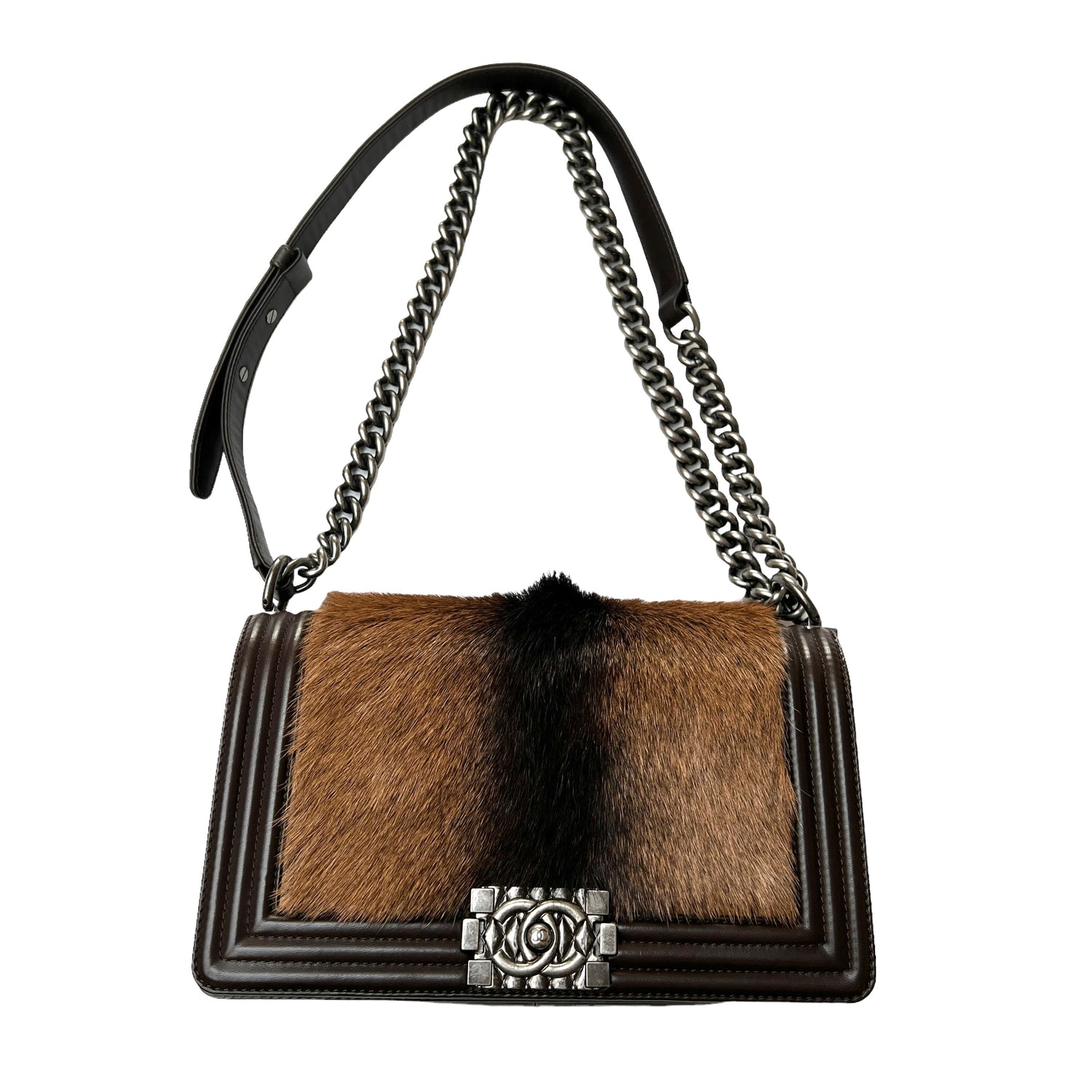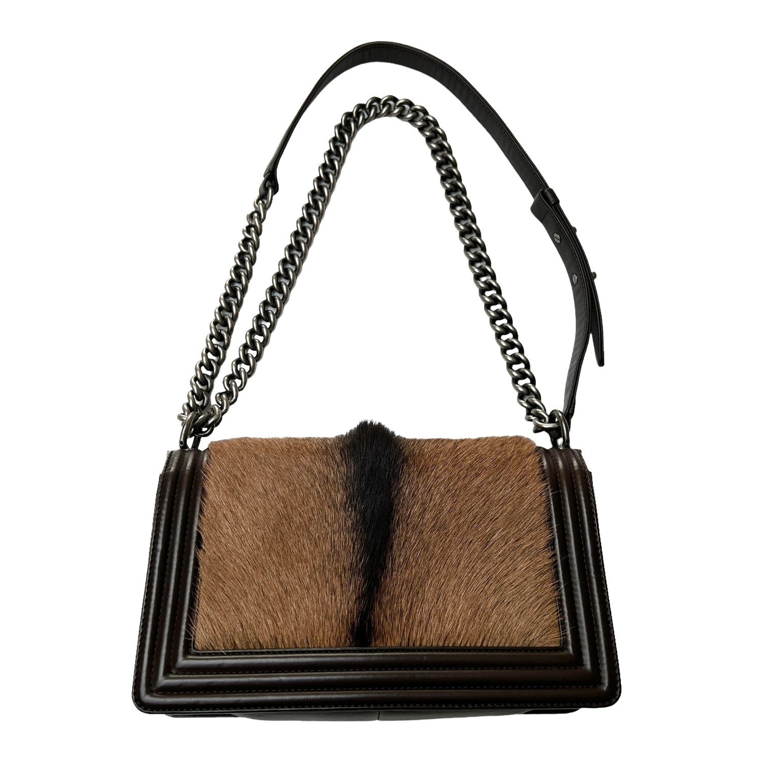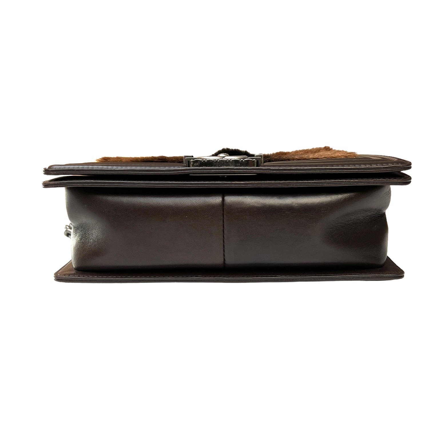 Chanel Boy bag from the Fall 2013 collection by Karl Lagerfeld. Brown Leather. Interlocking CC logo at snap closure. Chain-link and leather strap. Antiqued silver-tone hardware. Can be worn as a crossbody or shoulder bag. Fur body. Burgundy red leather lining & single interior slit pocket.