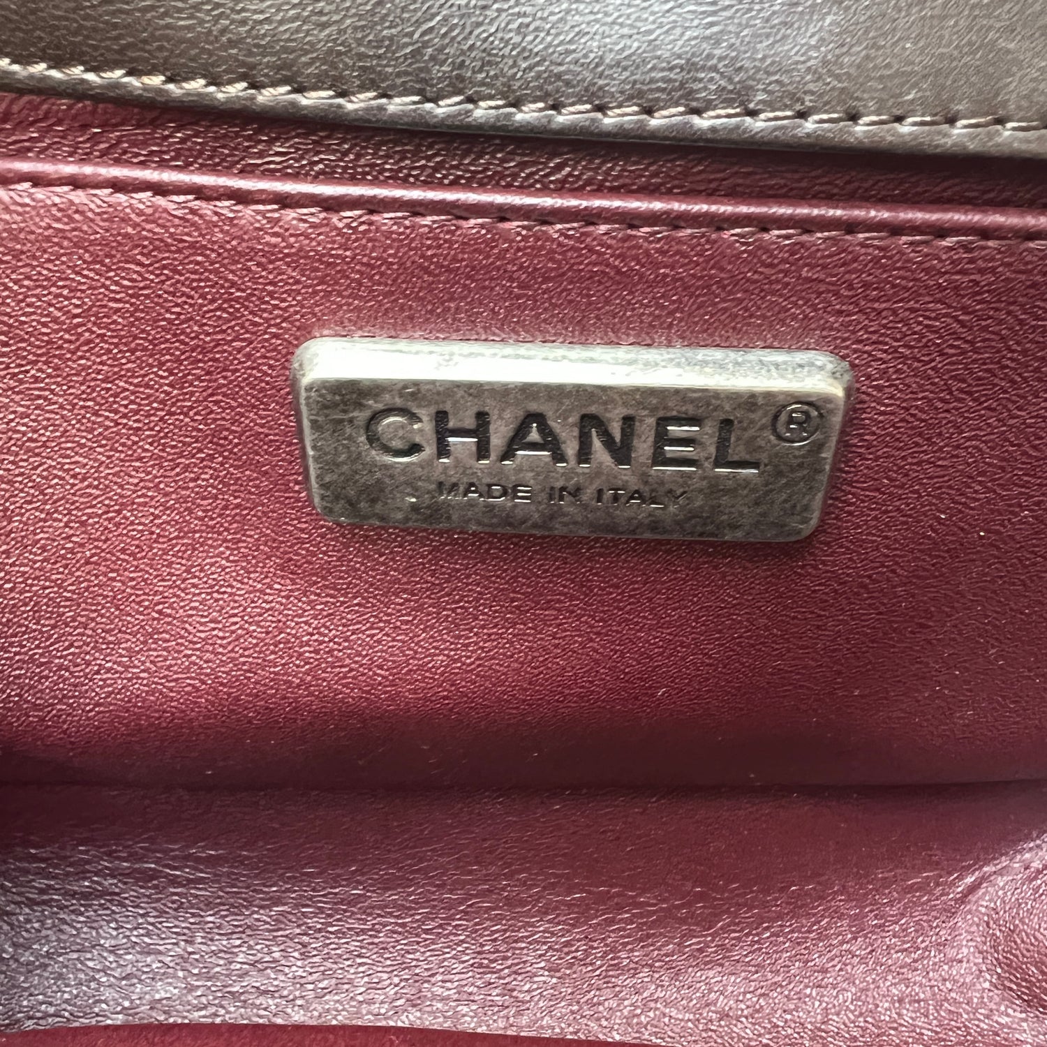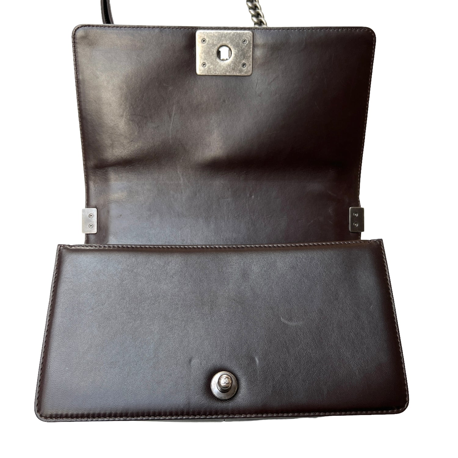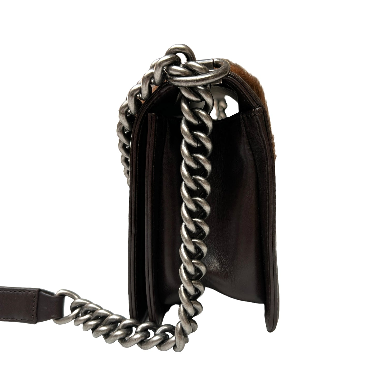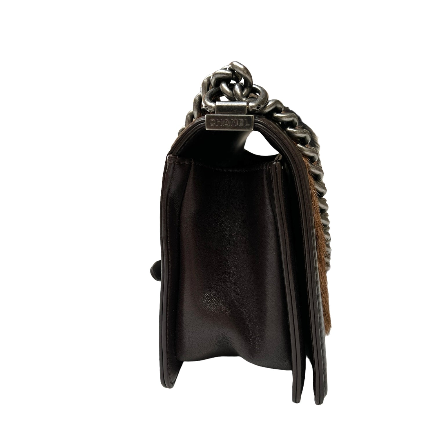 Chanel Boy bag from the Fall 2013 collection by Karl Lagerfeld. Brown Leather. Interlocking CC logo at snap closure. Chain-link and leather strap. Antiqued silver-tone hardware. Can be worn as a crossbody or shoulder bag. Fur body. Burgundy red leather lining & single interior slit pocket.