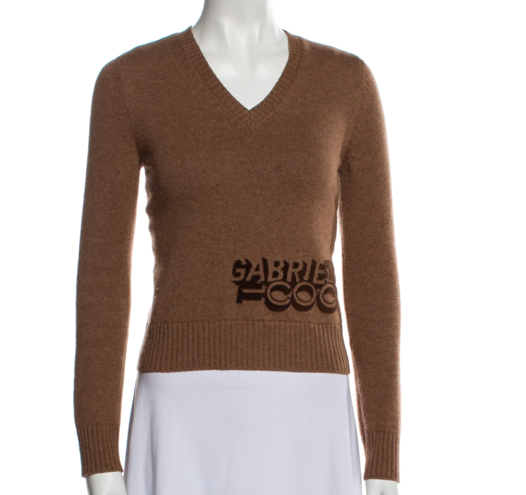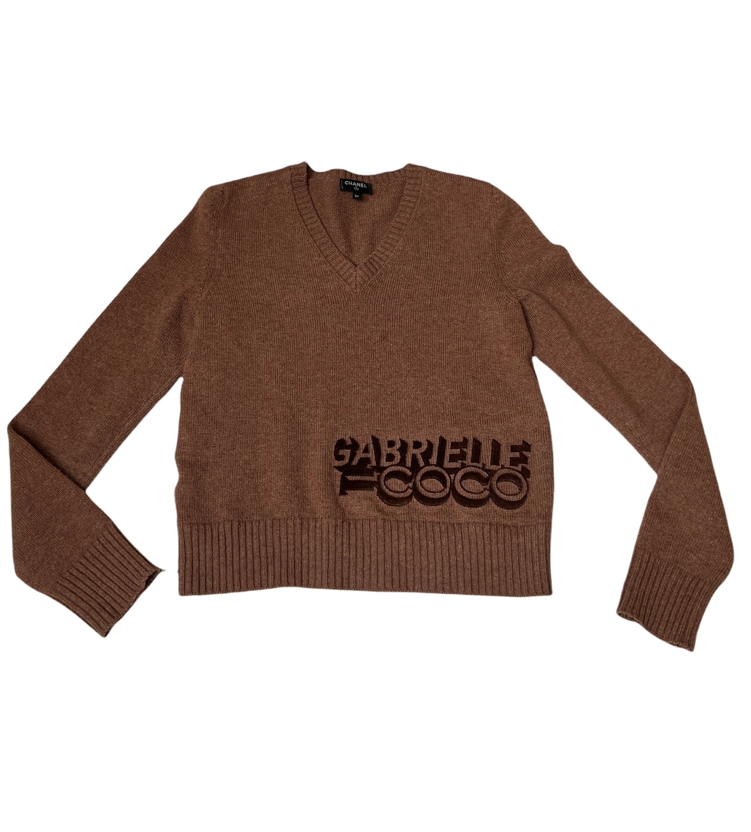From the Pre-Fall 2017 Collection, Brown, Graphic Print in 3D Velvet, Long Sleeve with V-Neck. Gabrielle Coco 3D velvet at bottom. CC pin logo at back. Designer size 34.