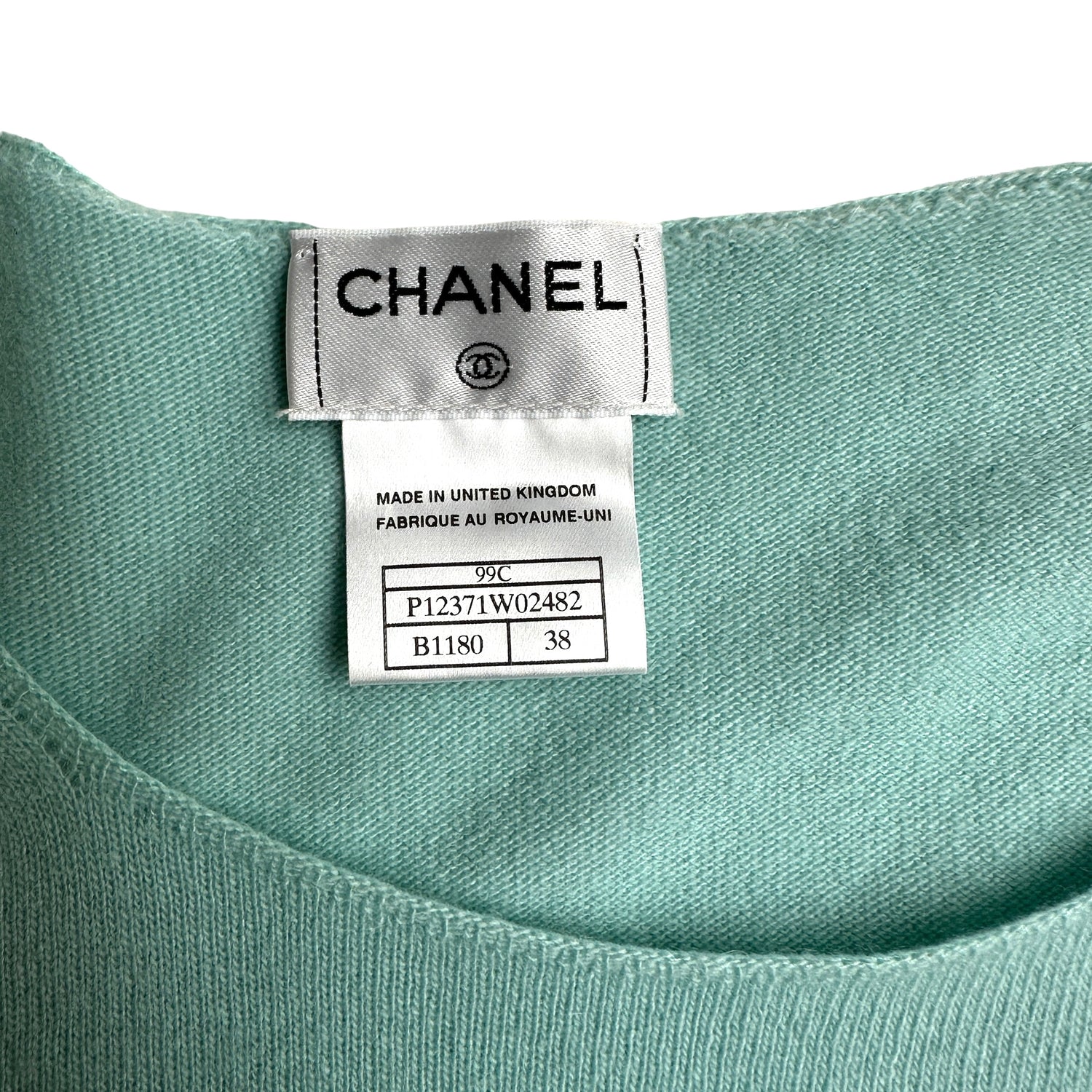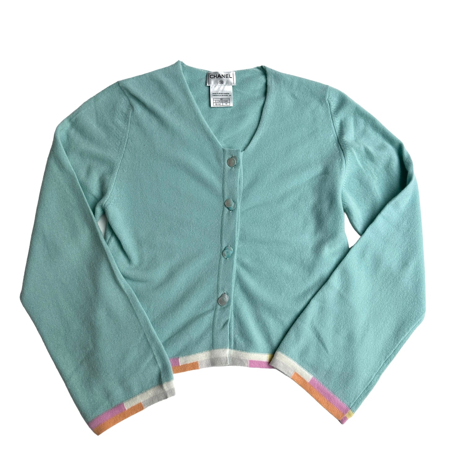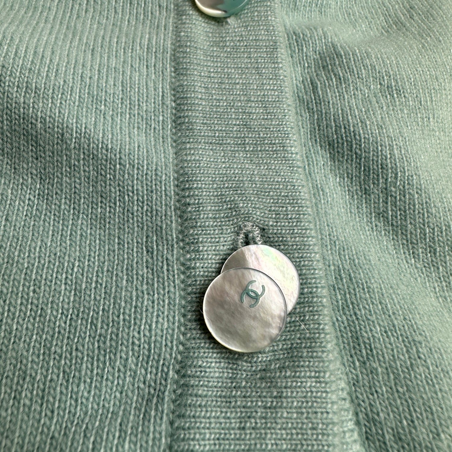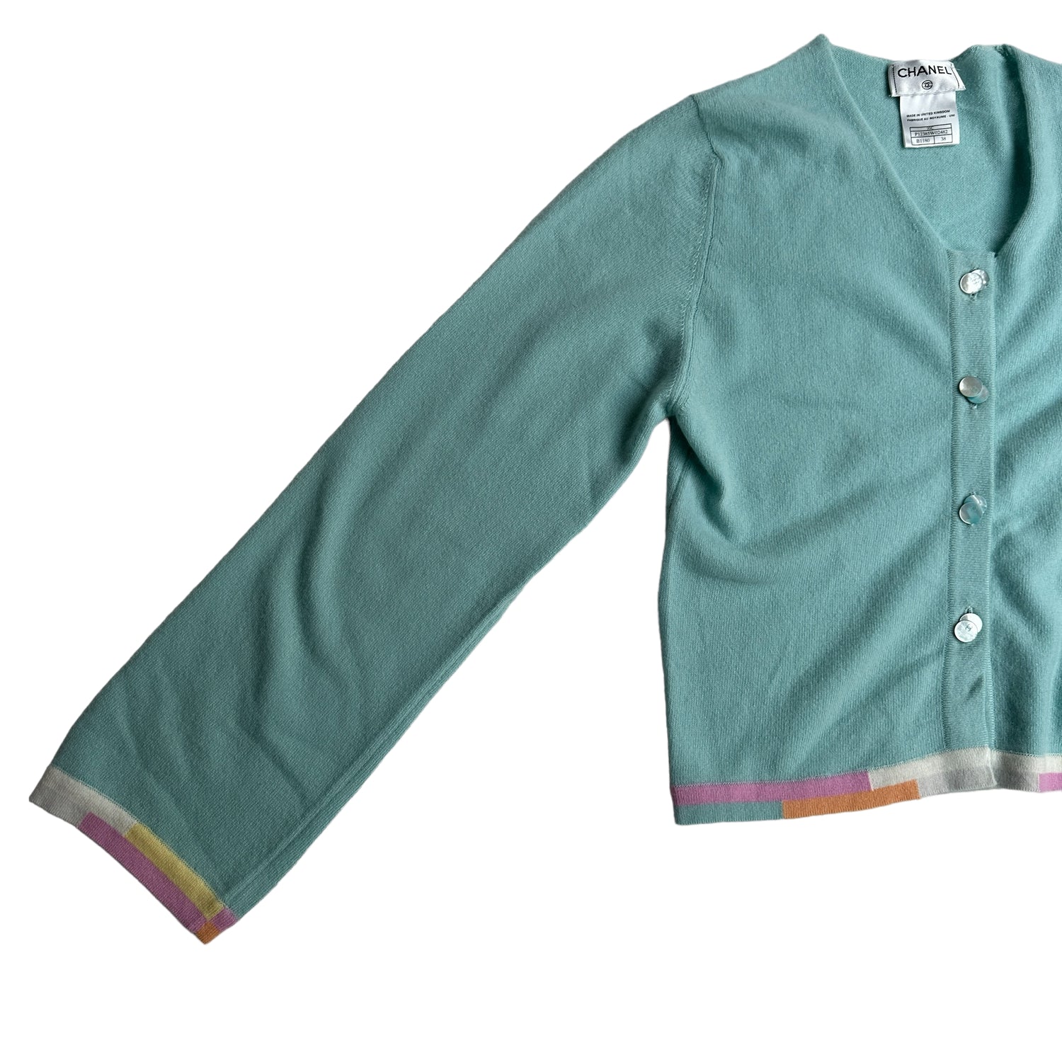 Chanel Cashmere Cardigan set. From the Cruise 1999 Collection by Karl Lagerfeld. Matching cashmere top underneath cardigan or wear both separately. Vintage. Blue cashmere. Interlocking CC logo at mother-of-pearl buttons. Long sleeve sweater with scoop neck. Designer size 38.